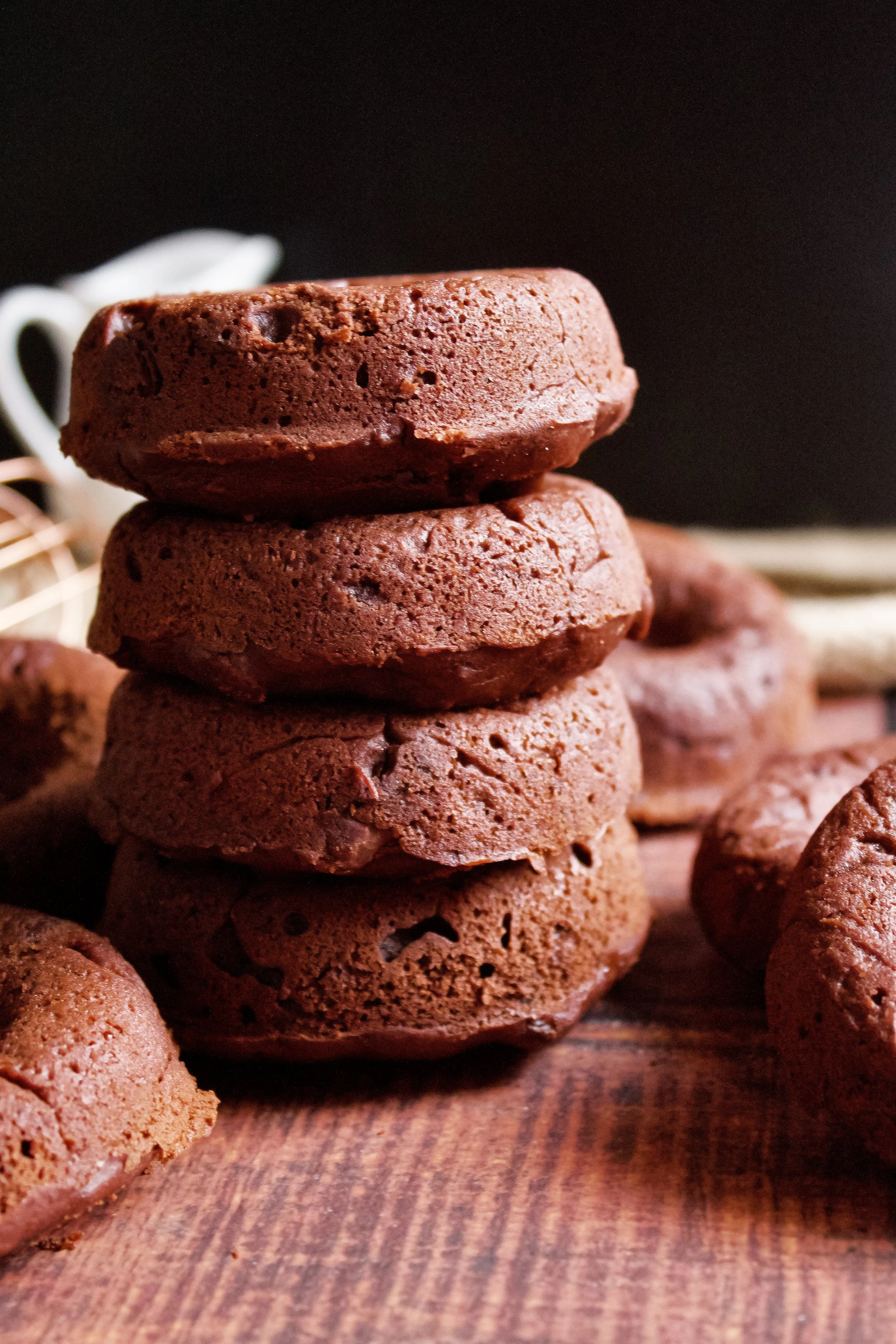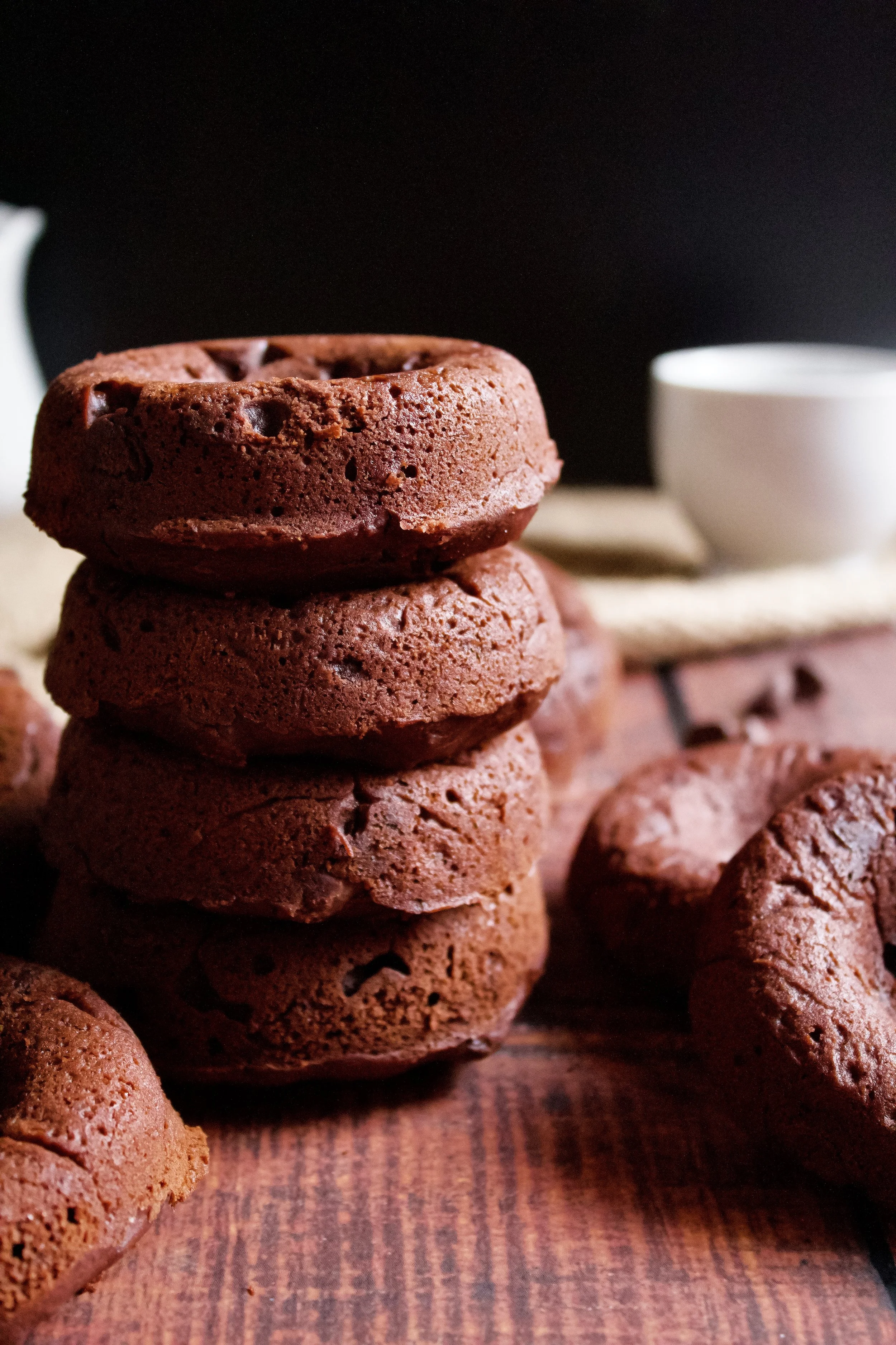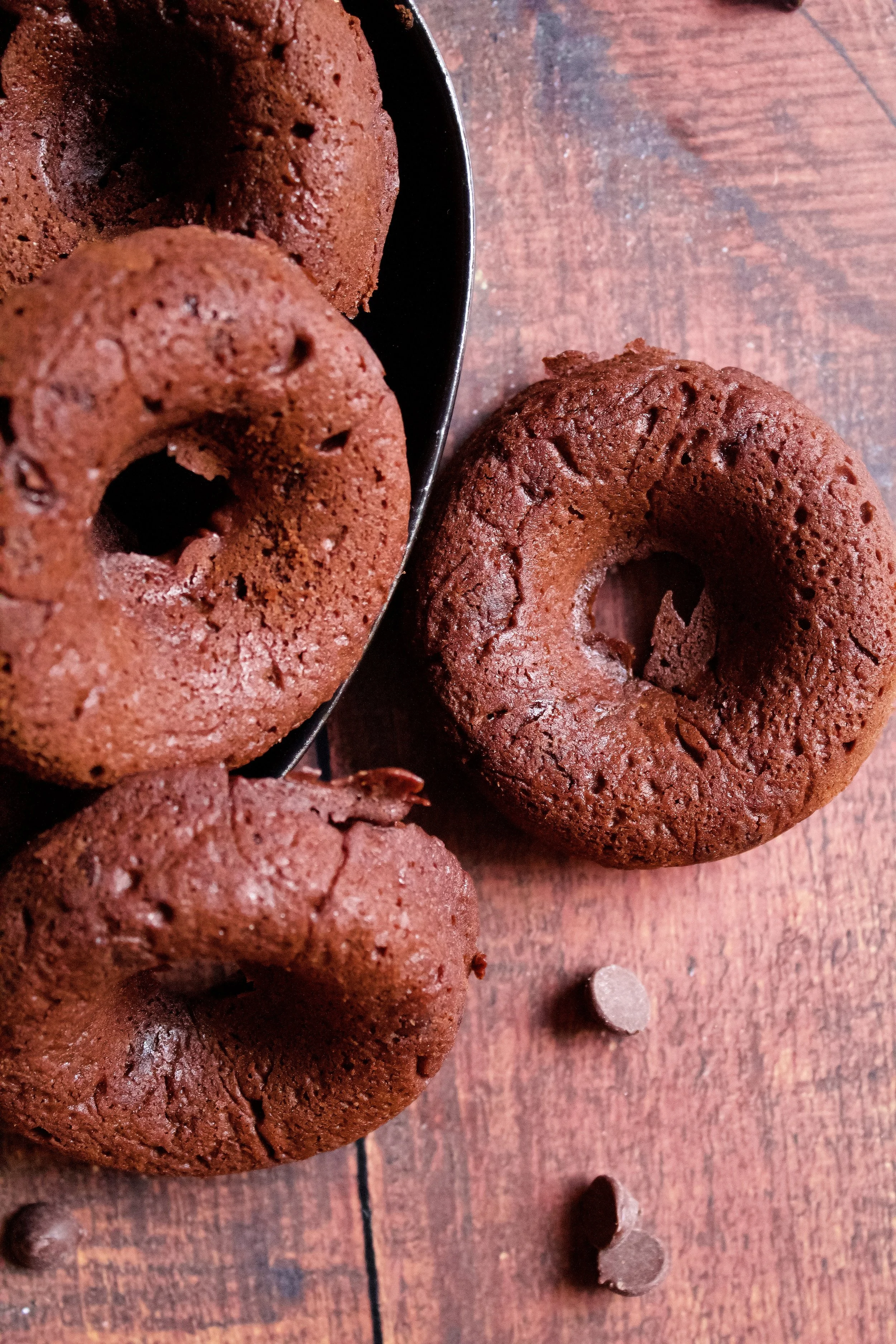 I based these off of my favorite pumpkin donuts, because I happened to have some pumpkin open and those donuts have the perfect texture. I left out the spices and sugar coating and substituted some of the flour for cocoa powder. I then added in some chocolate chips and voila! Perfect double chocolate donuts.