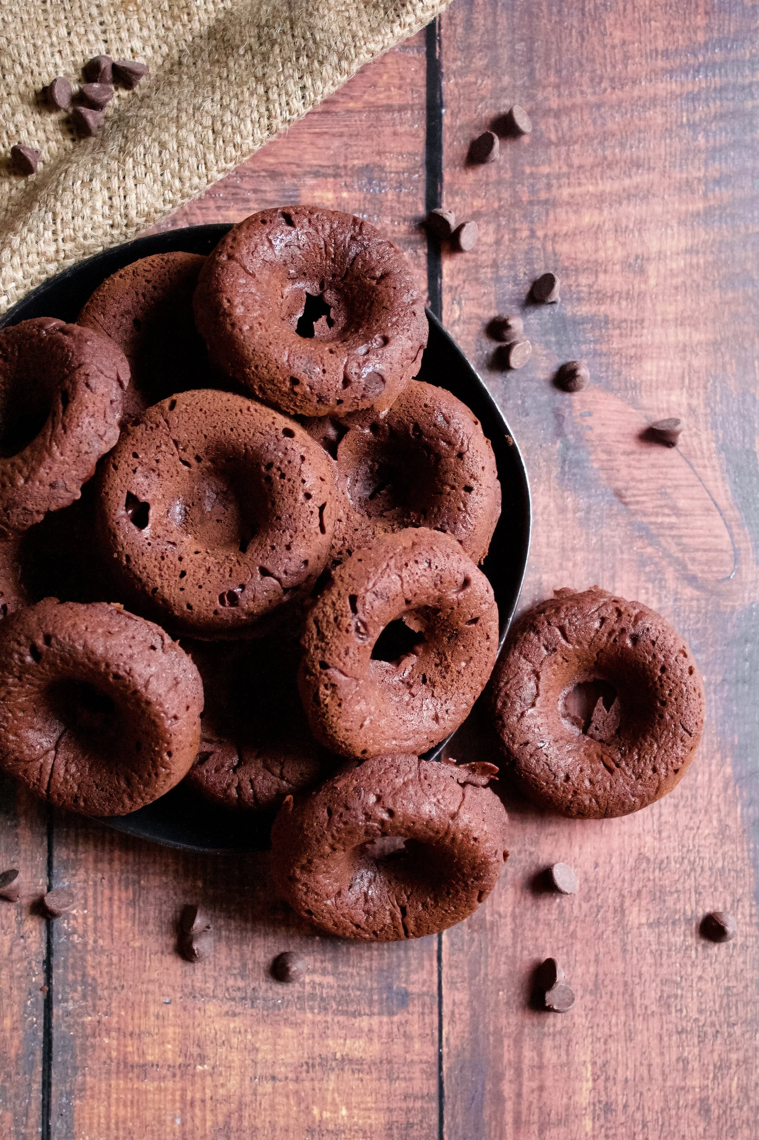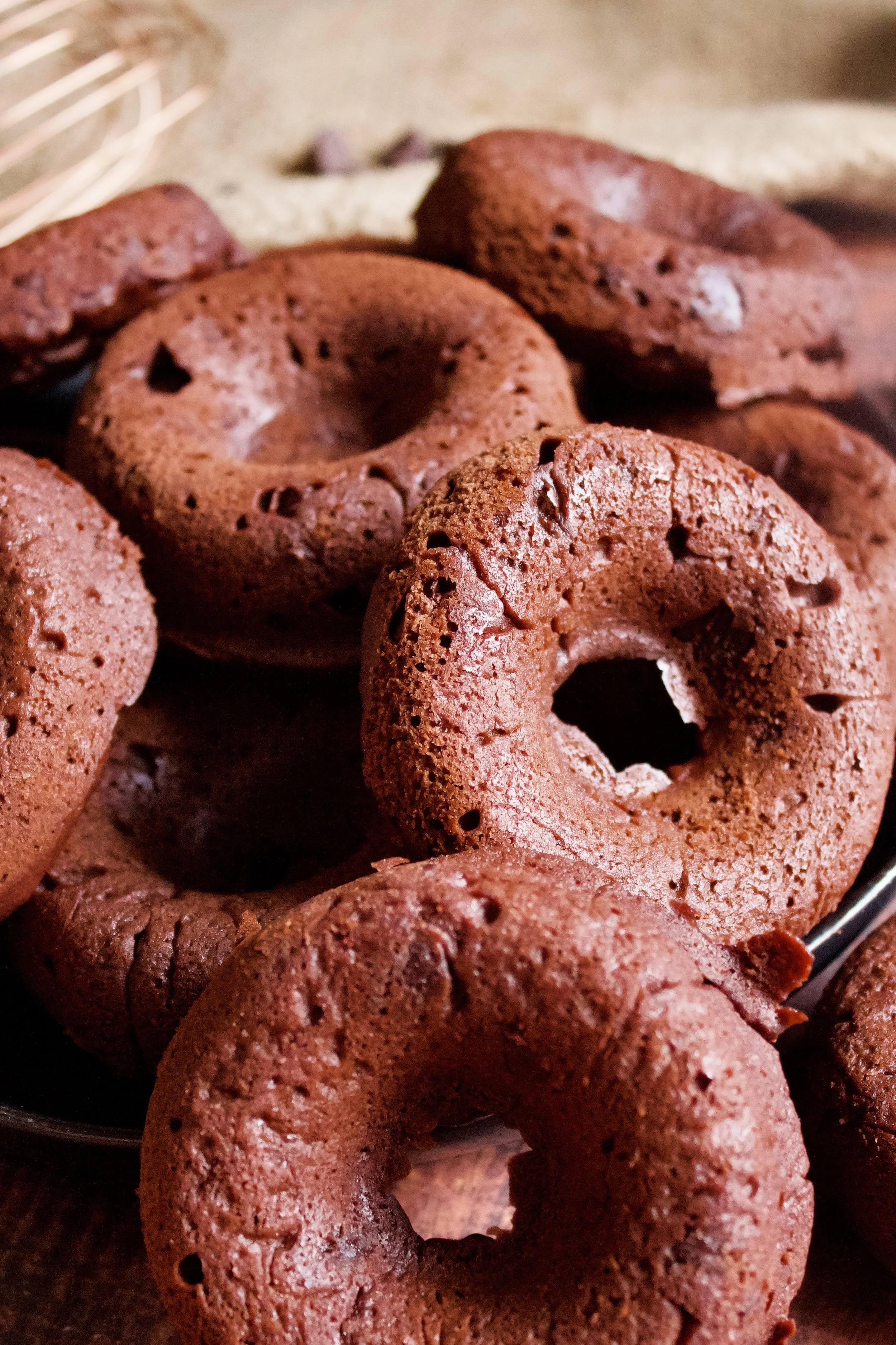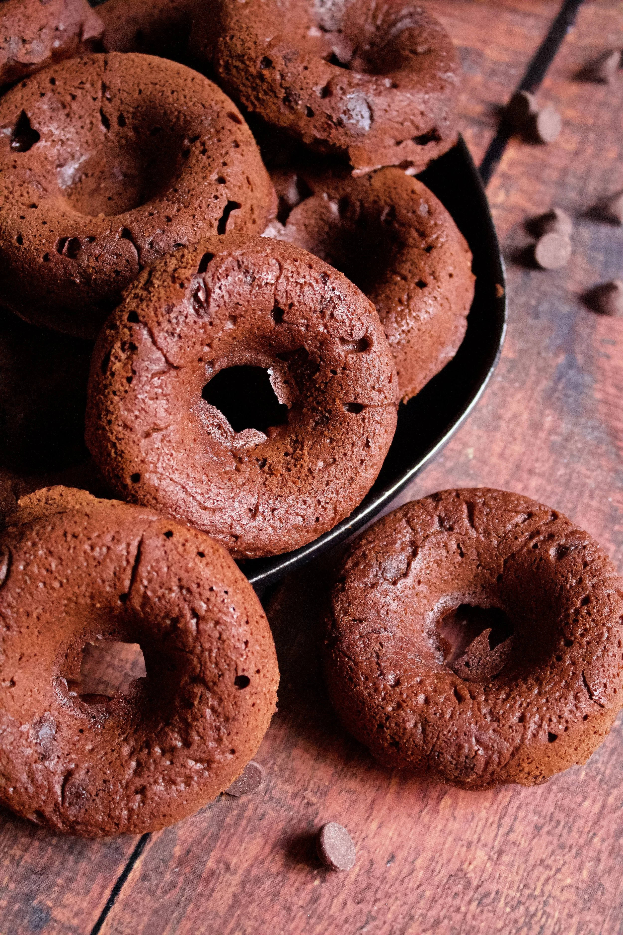 I based these off of my favorite pumpkin donuts, because I happened to have some pumpkin open and those donuts have the perfect texture. I left out the spices and sugar coating and substituted some of the flour for cocoa powder. I then added in some chocolate chips and voila! Perfect double chocolate donuts.
