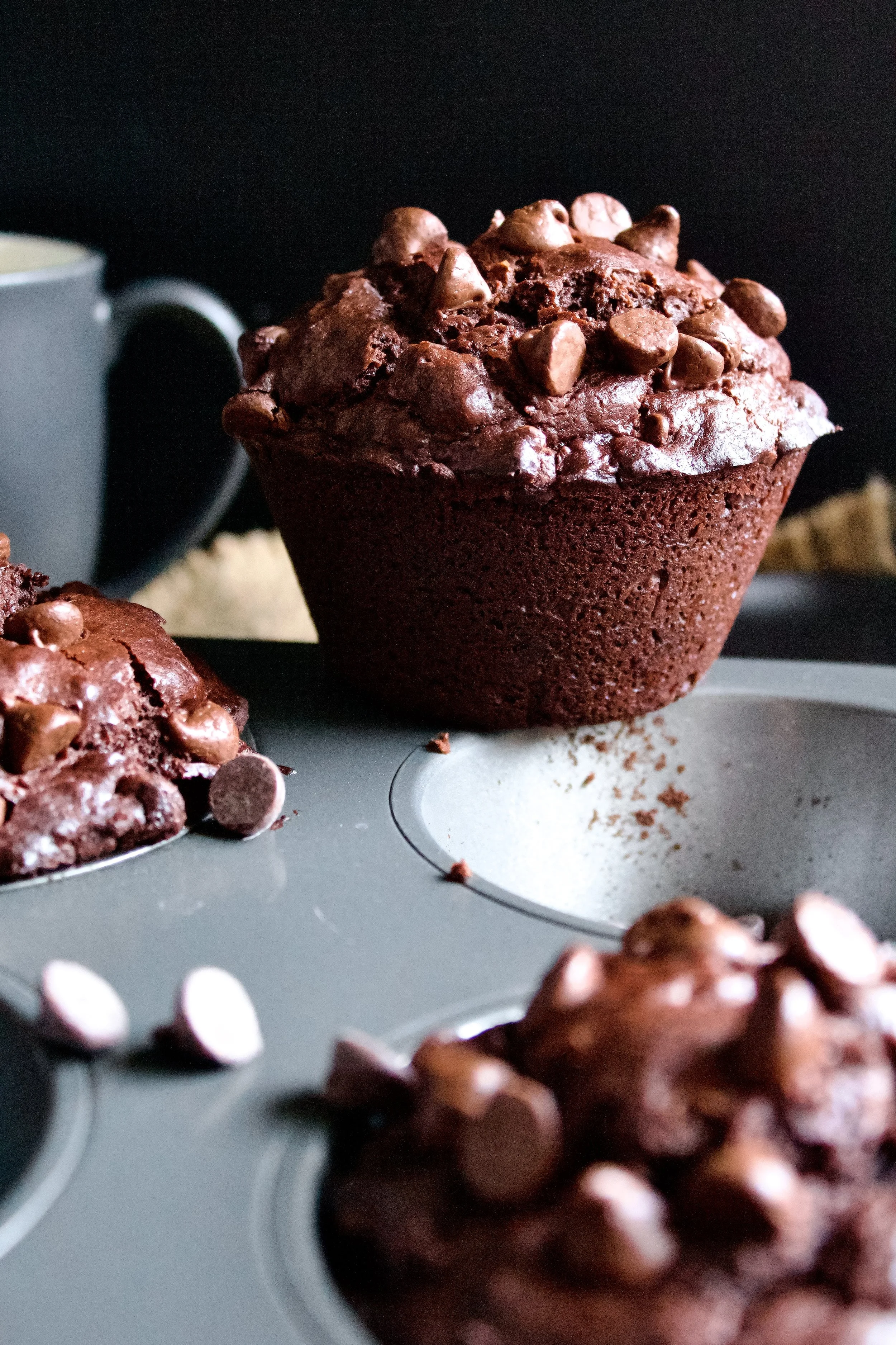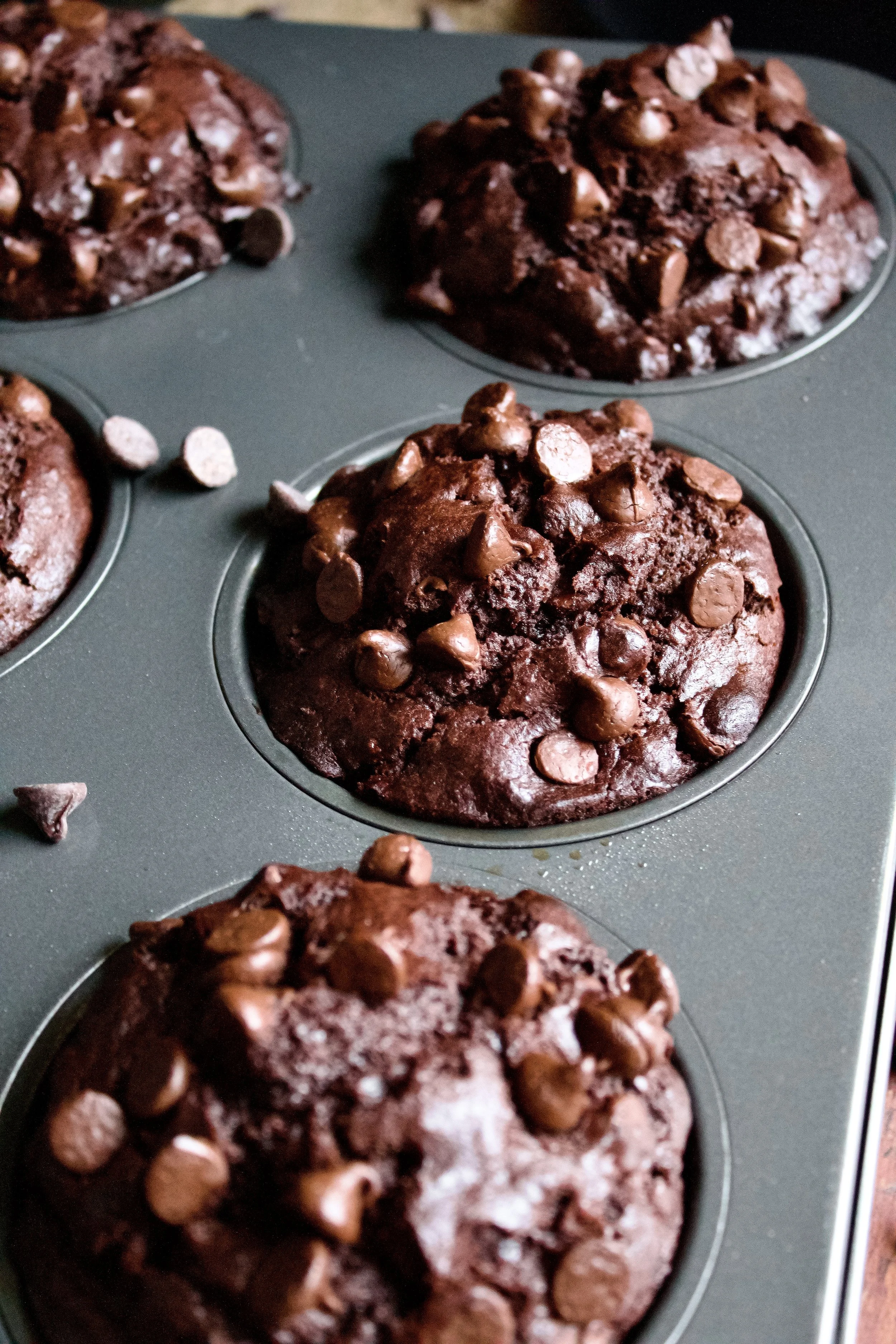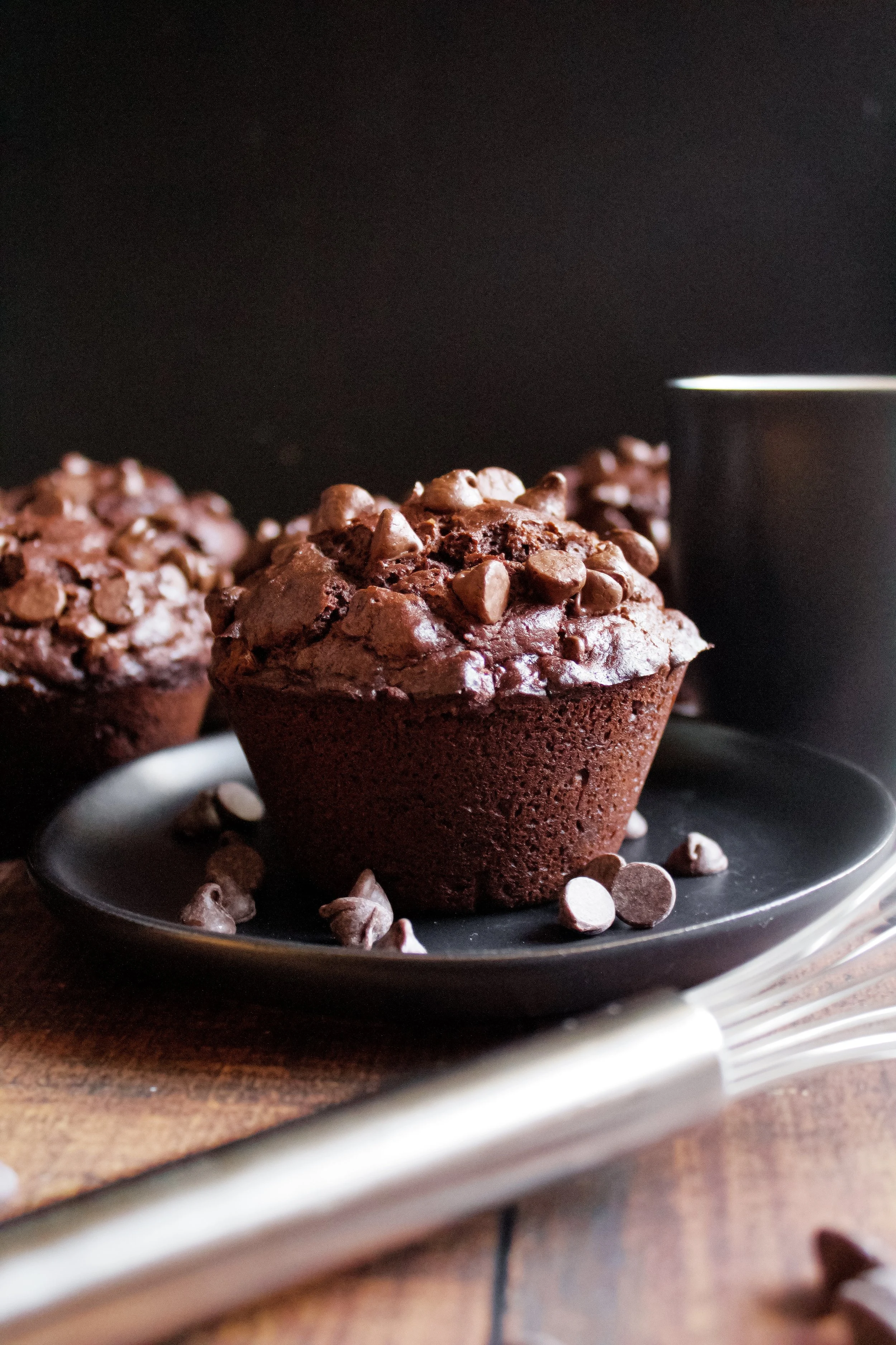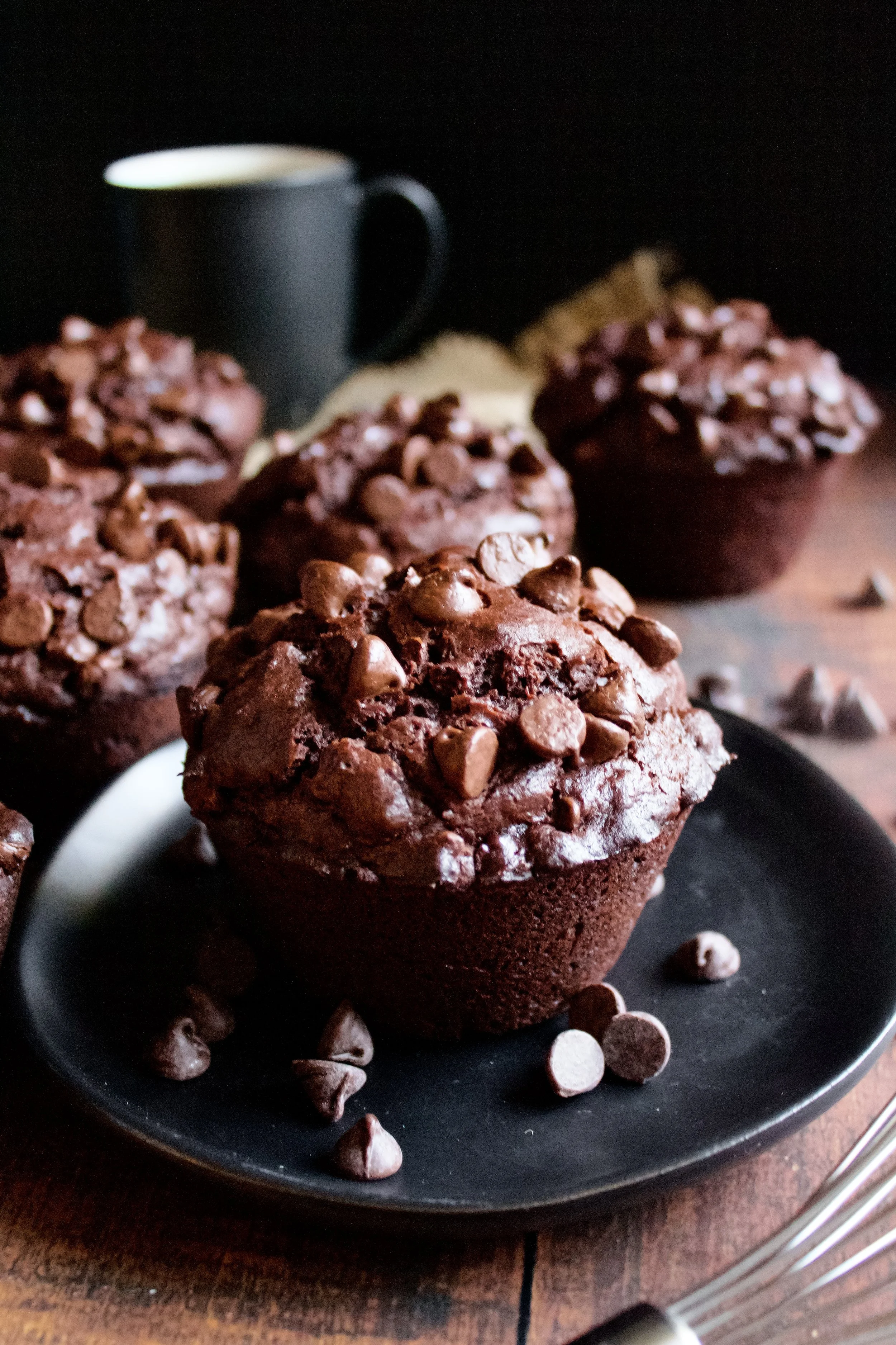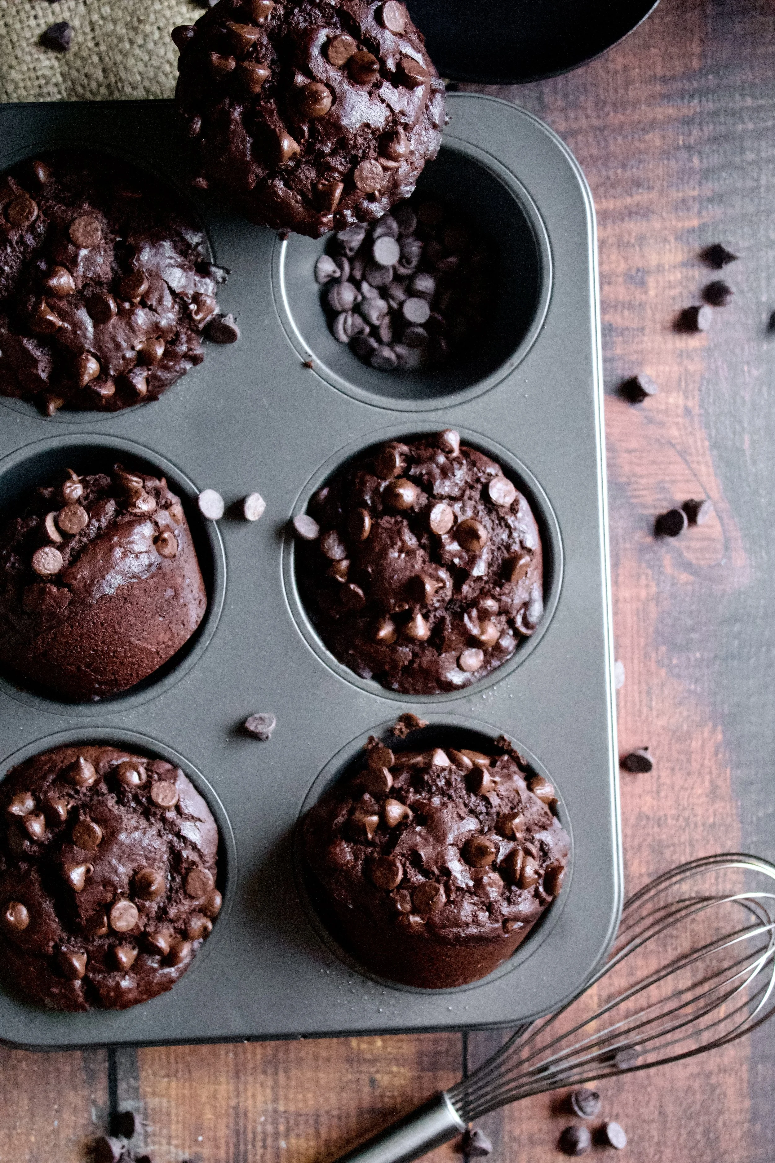 Finally, the chocolate flavor. I experimented with how much cocoa to add. You can’t simply substitute cocoa for flour, so I had to try a few ratios to get it exact. This ratio is just enough to give a rich chocolate flavor without being overly bitter or super dark (nothing against super dark muffins, I just know my daughter won’t eat them). Plus, the chocolate chips. I mean, you can’t have double chocolate without lots of chocolate chips. They add flavor and texture to these muffins, and are probably my favorite part.