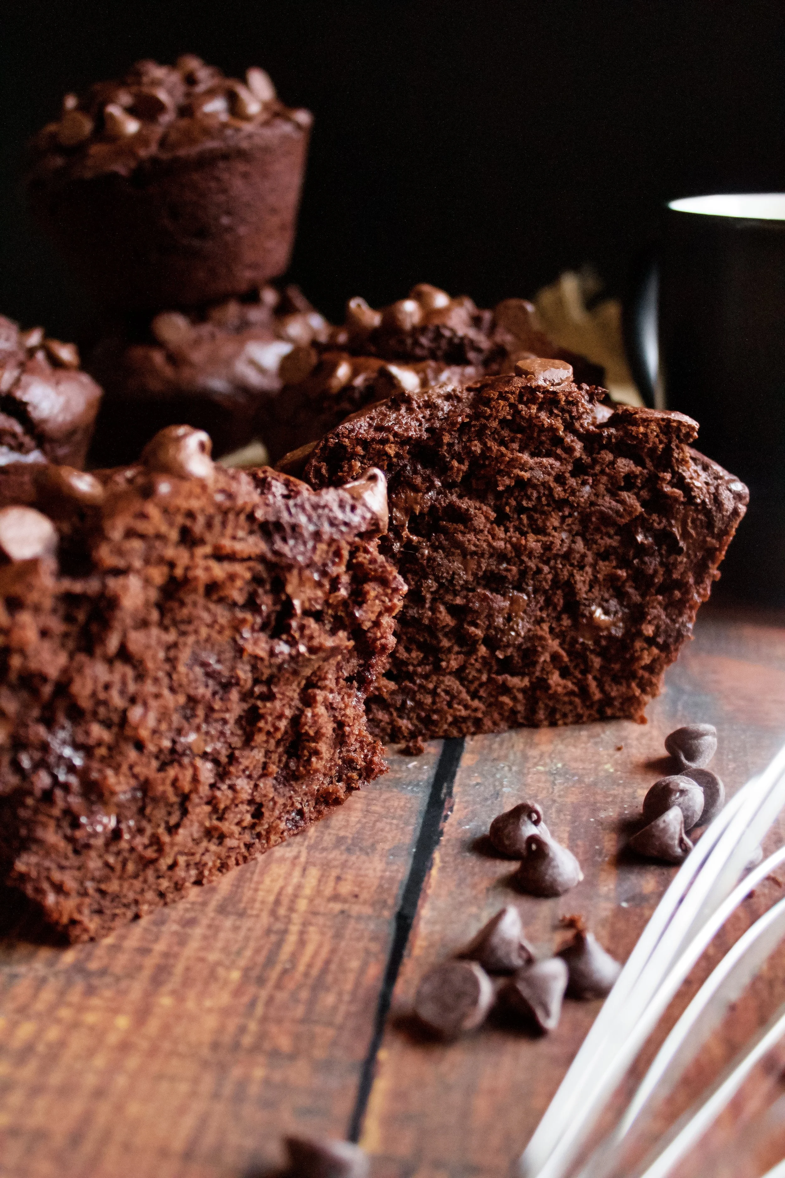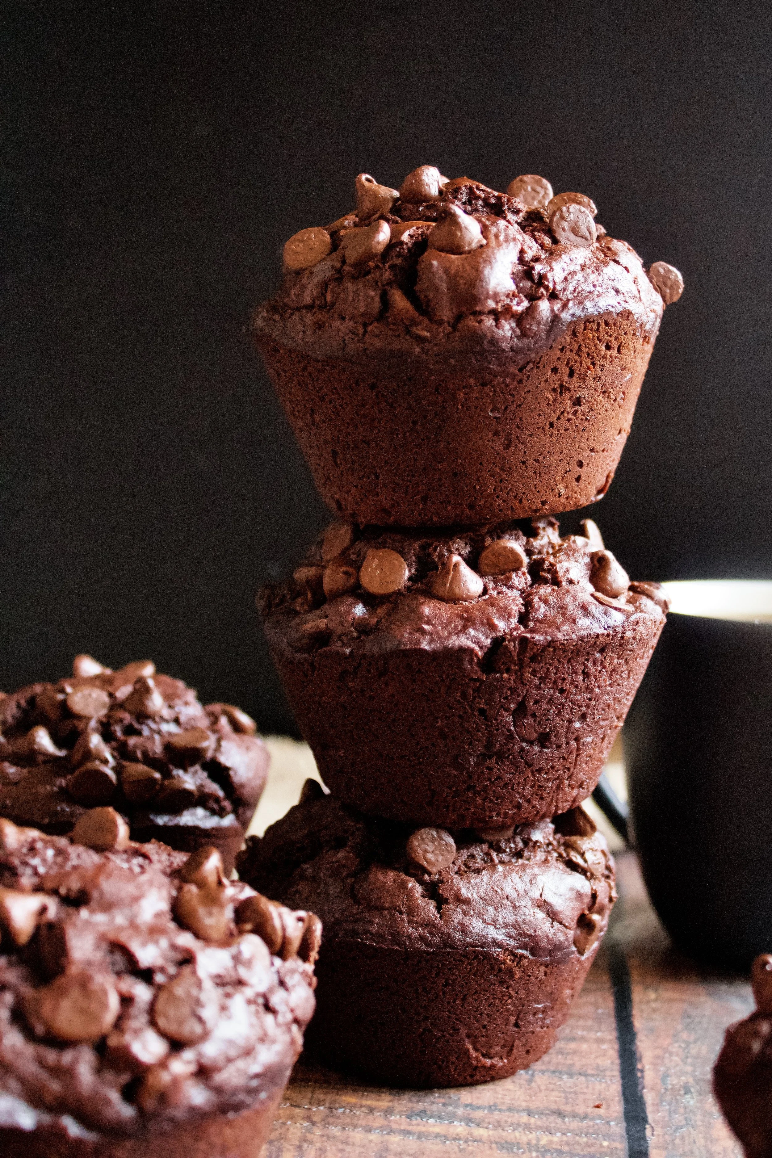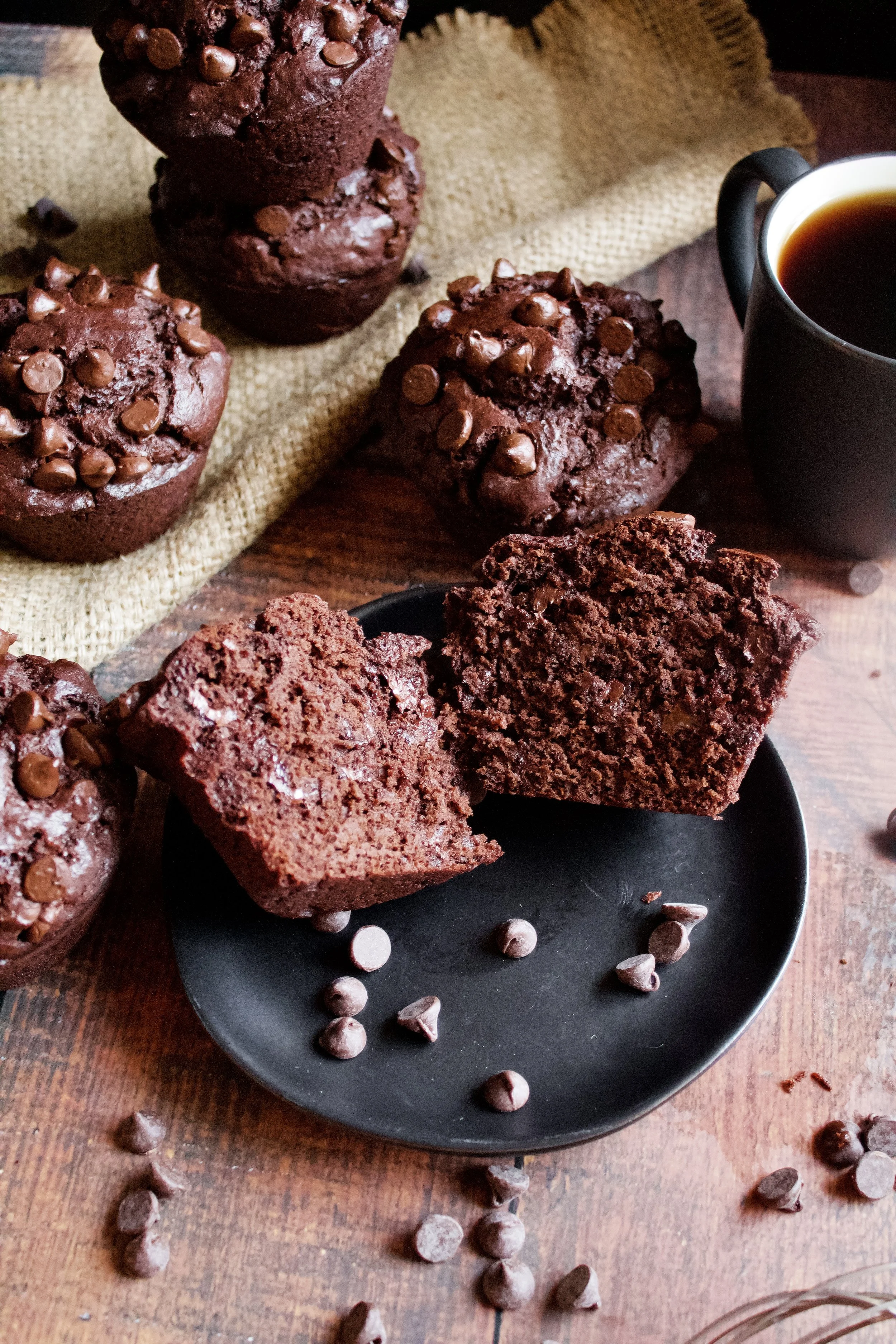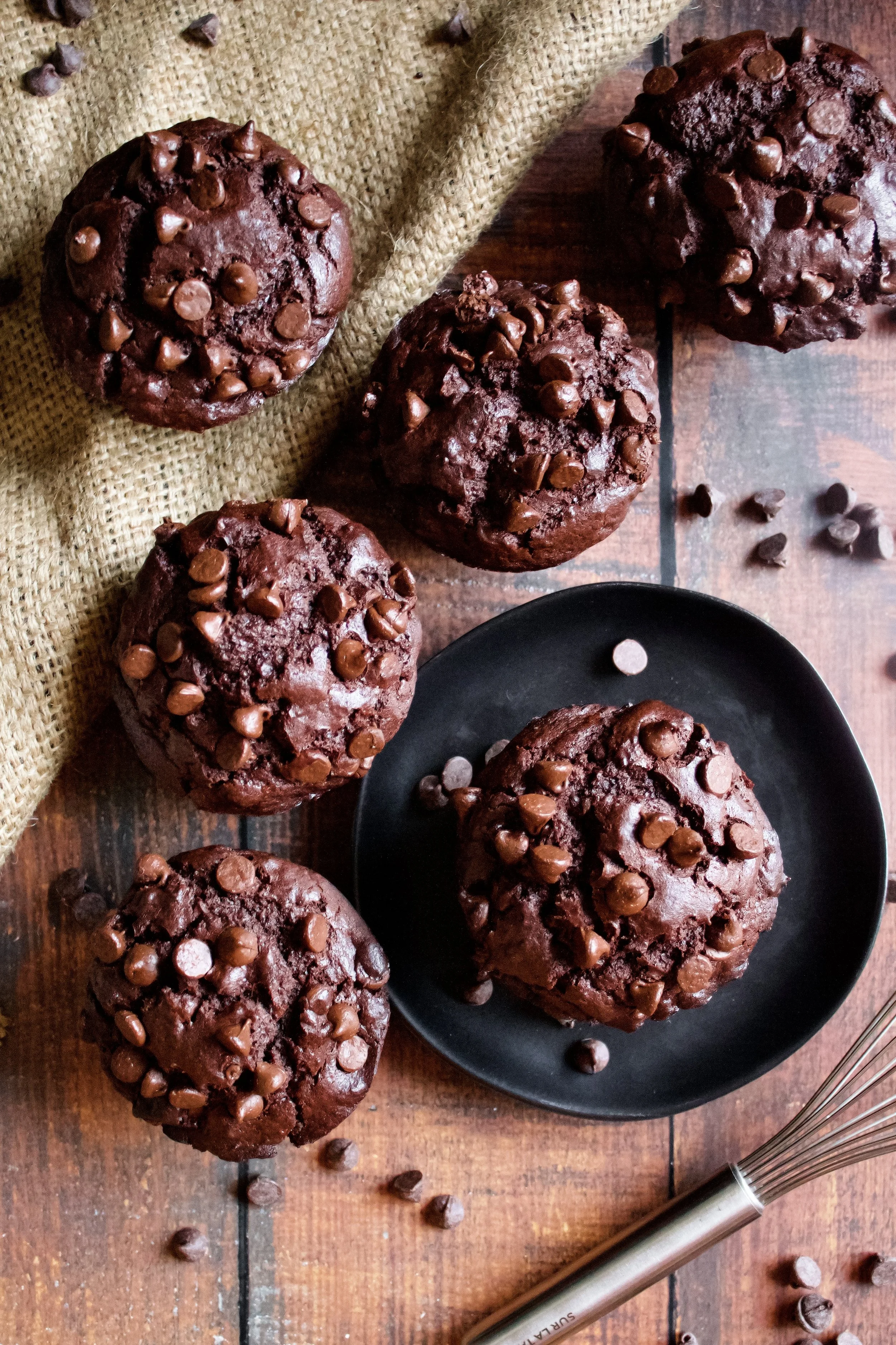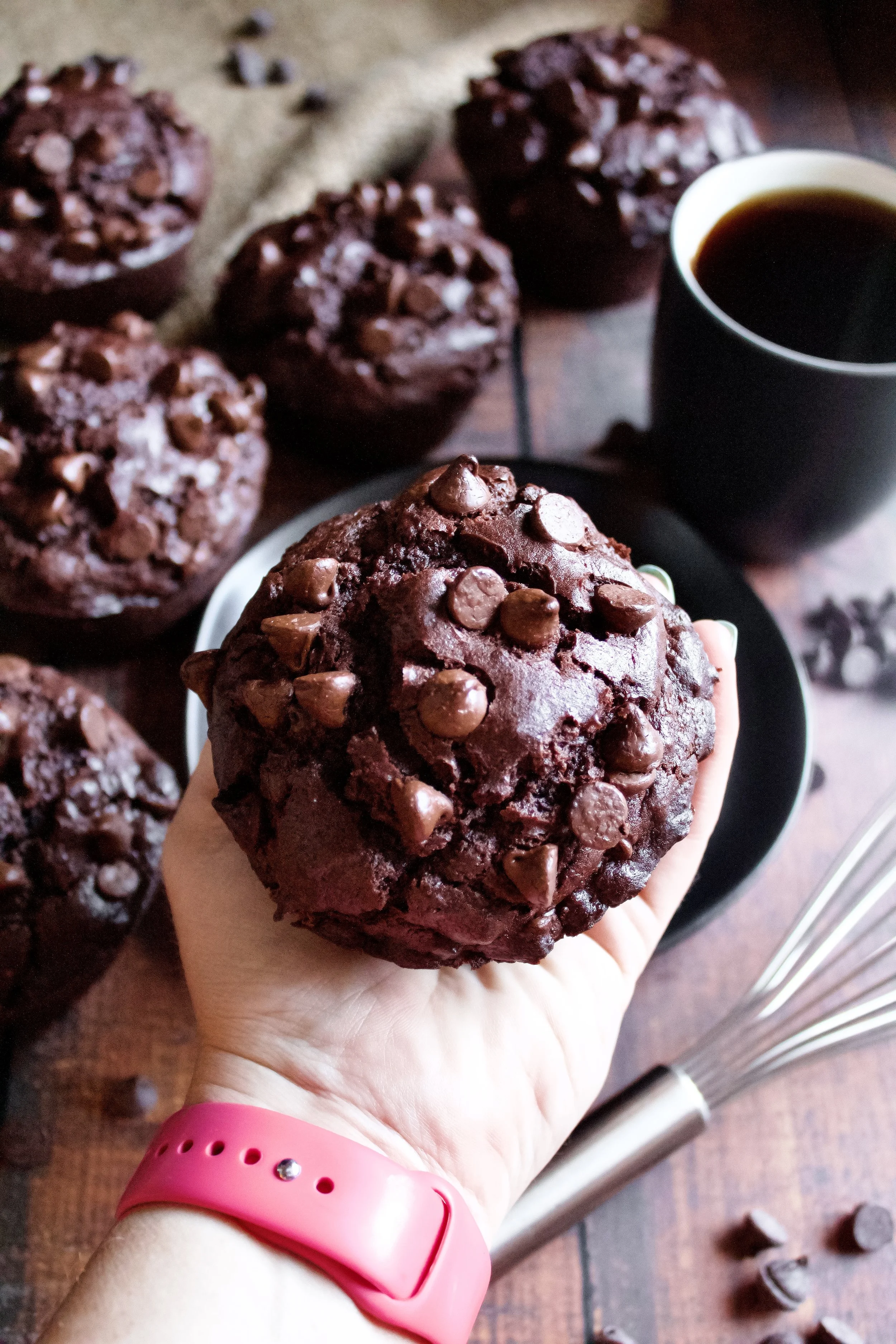 Finally, the chocolate flavor. I experimented with how much cocoa to add. You can’t simply substitute cocoa for flour, so I had to try a few ratios to get it exact. This ratio is just enough to give a rich chocolate flavor without being overly bitter or super dark (nothing against super dark muffins, I just know my daughter won’t eat them). Plus, the chocolate chips. I mean, you can’t have double chocolate without lots of chocolate chips. They add flavor and texture to these muffins, and are probably my favorite part.