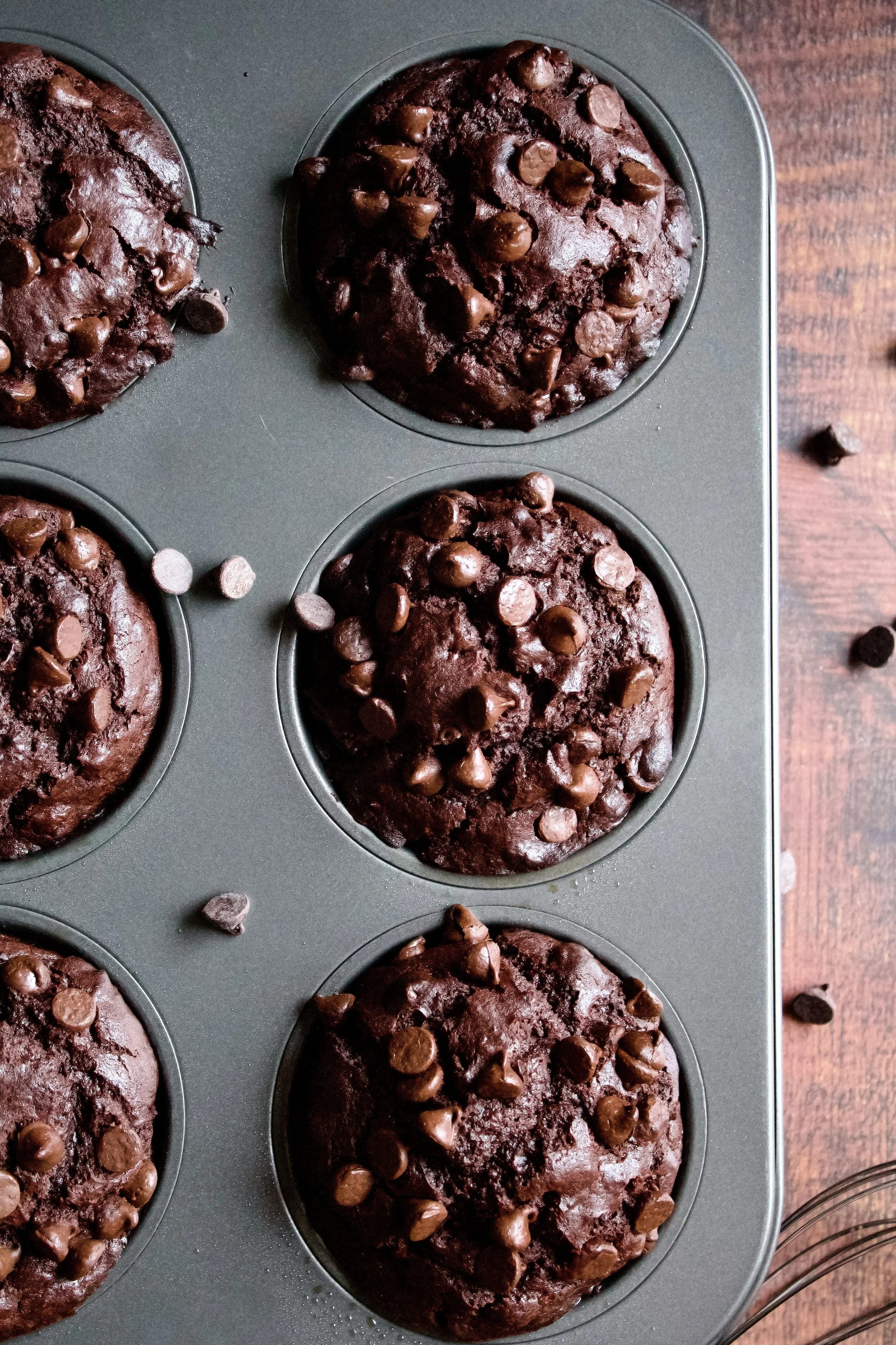 I always use a toothpick, but a small knife or kebab skewer will work, too. You want to catch the muffins when they just barely stop being raw, as they will cook a little more in the pan while they cool. The top will not change color as much as other muffins, since the chocolate is already dark. So try to use a toothpick to check for moist crumbs but no raw batter.