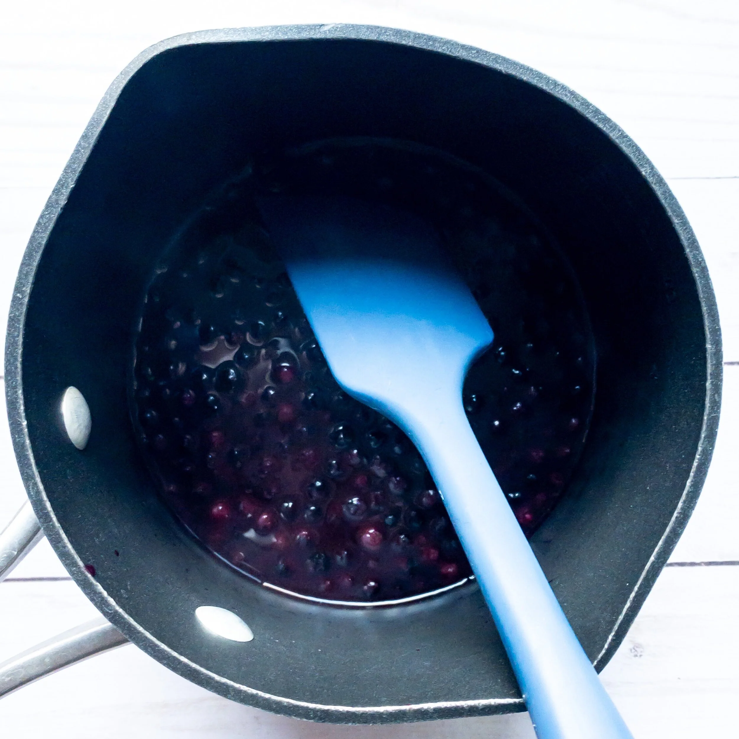 - Place blueberries, juice, salt, sugar, and cornstarch (if using) in a small saucepan. Cook over medium-low heat until the blueberries break down, about 5-10 minutes (closer to 10 if using cornstarch to cook it fully). Stir frequently with a rubber spatula, pressing on the blueberries to help middle them as they cook. See note about cooking to prevent a burnt taste.