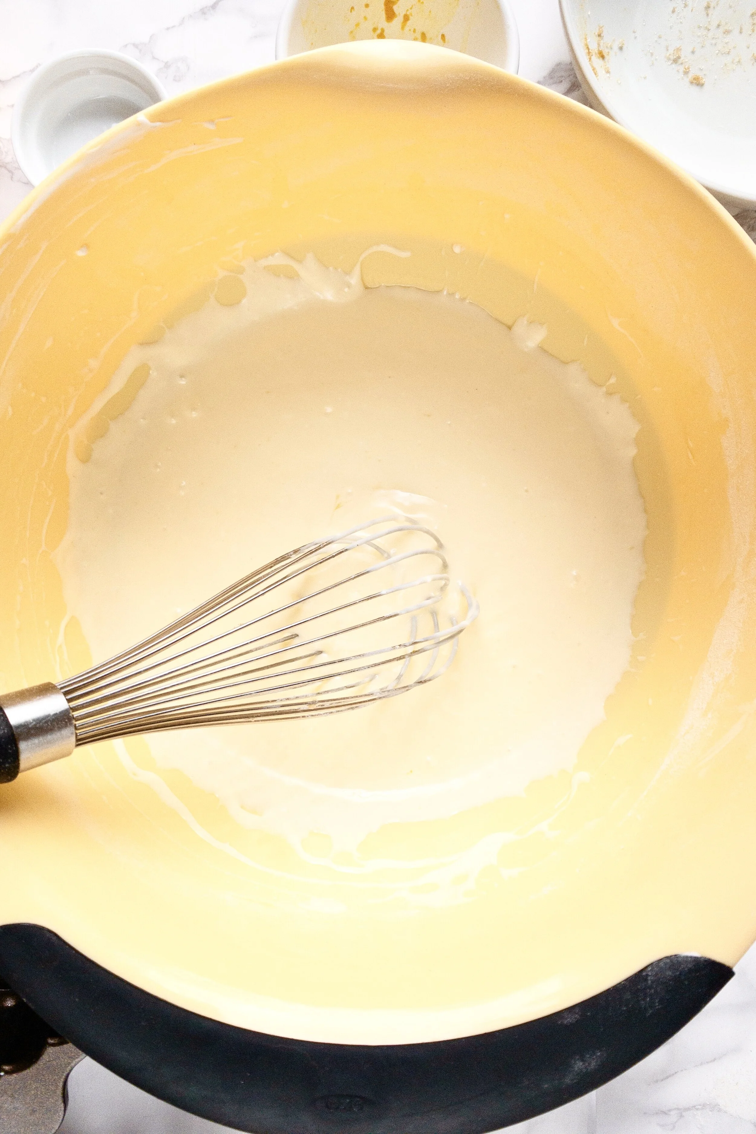 - In another, larger bowl, whisk together your melted butter, oil, yogurt, and orange juice until well combined. Whisk in your eggs until well combined and completely smooth (this helps prevent scrambling the eggs).