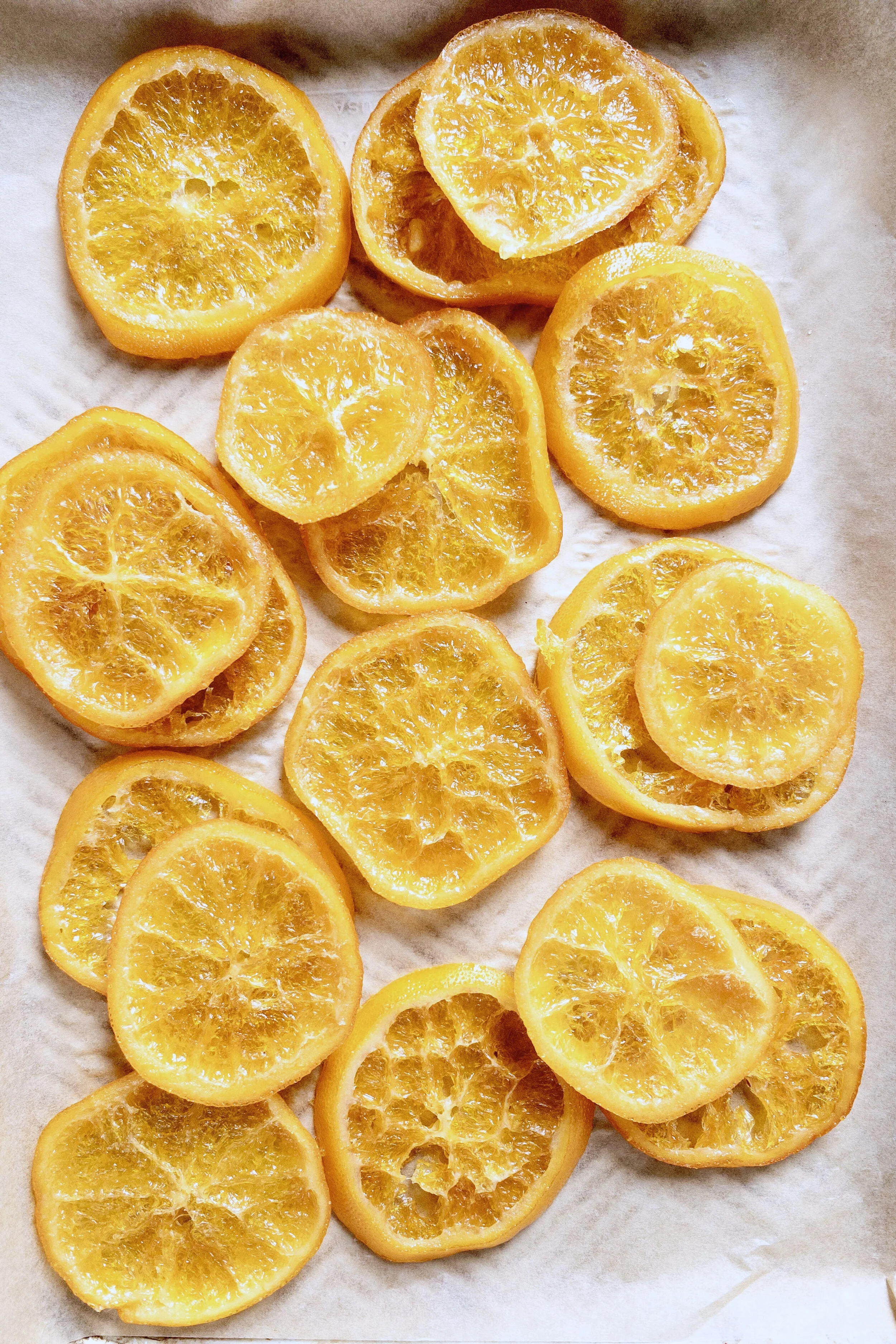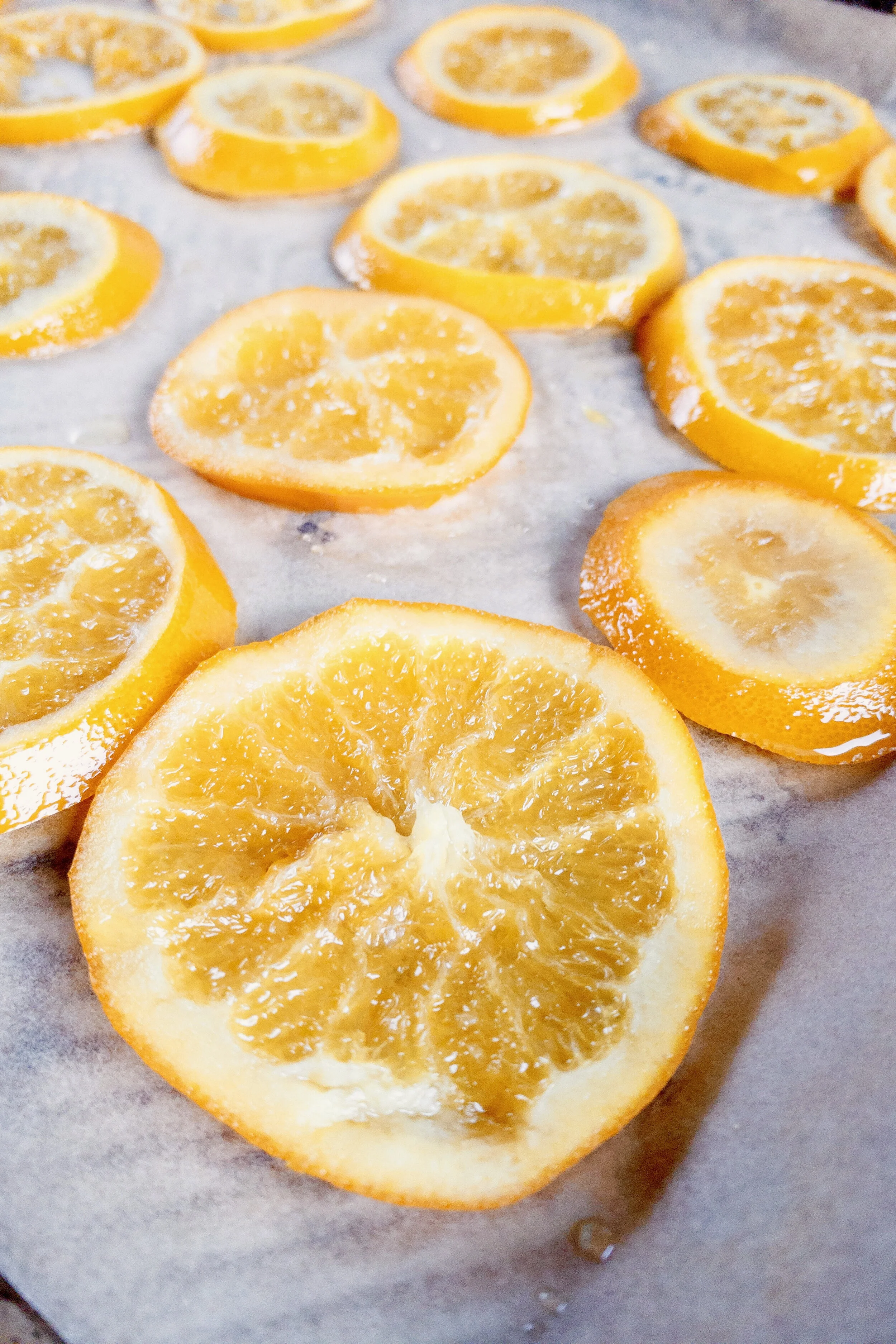 - Preheat oven to 175 (or lowest setting). Line two baking sheets with parchment paper. Gently remove the slices to the cookie sheets, leaving a little space between each slice to help them dry evenly. Bake for 1-2 hours, until dry but still slightly tacky. The oranges should haven hardened enough to keep their shape but not so much that they can’t be bent and shaped. Basically, dried like candied fruit. :)