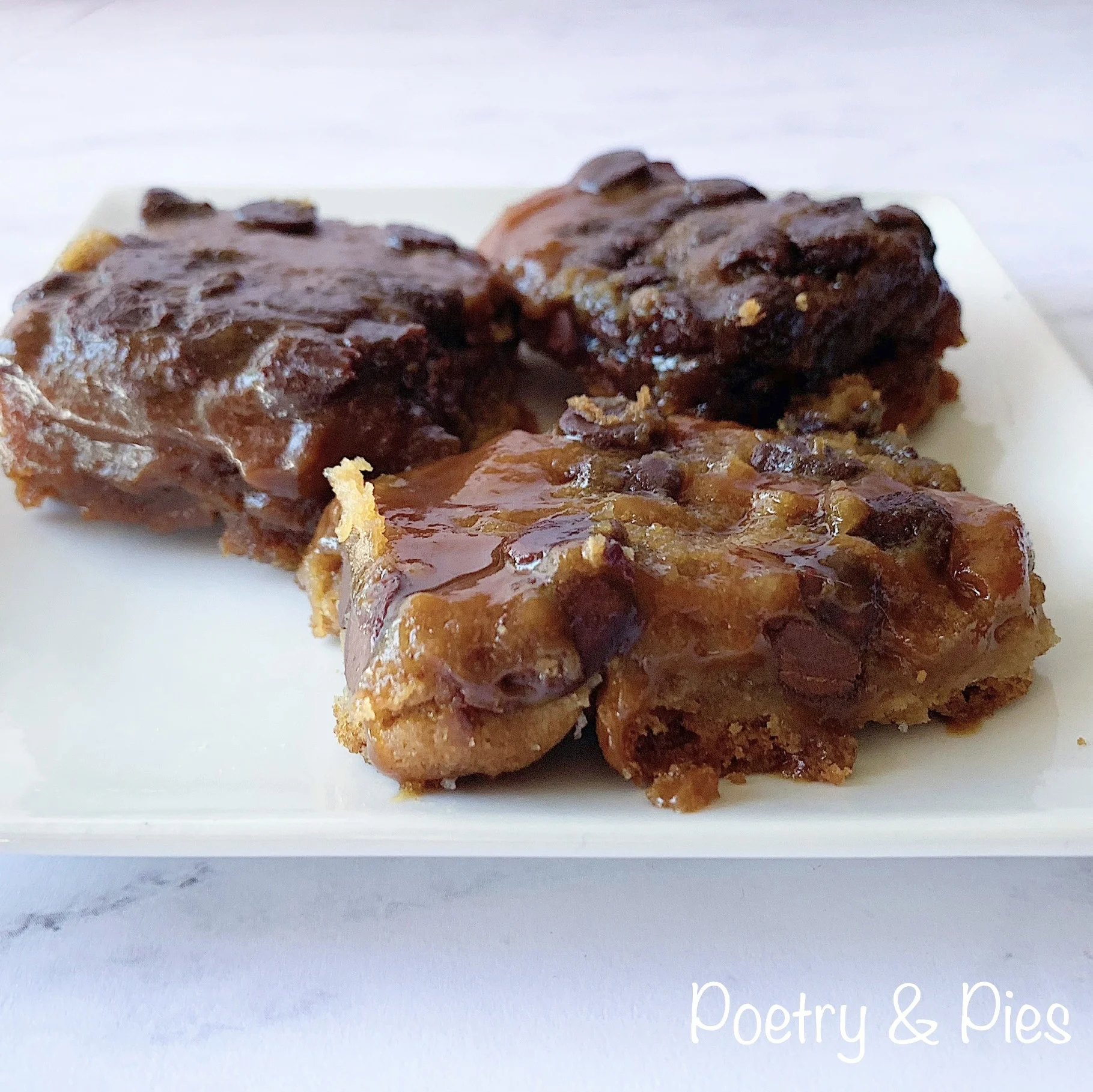 These gooey, chocolatey, salted caramel-y bars are one of the happiest accidents I’ve ever had in the kitchen. They’re a variation on caramel cookie bars, using the classic Nestle Tollhouse cookie recipe with caramel sauce sandwiched in between.