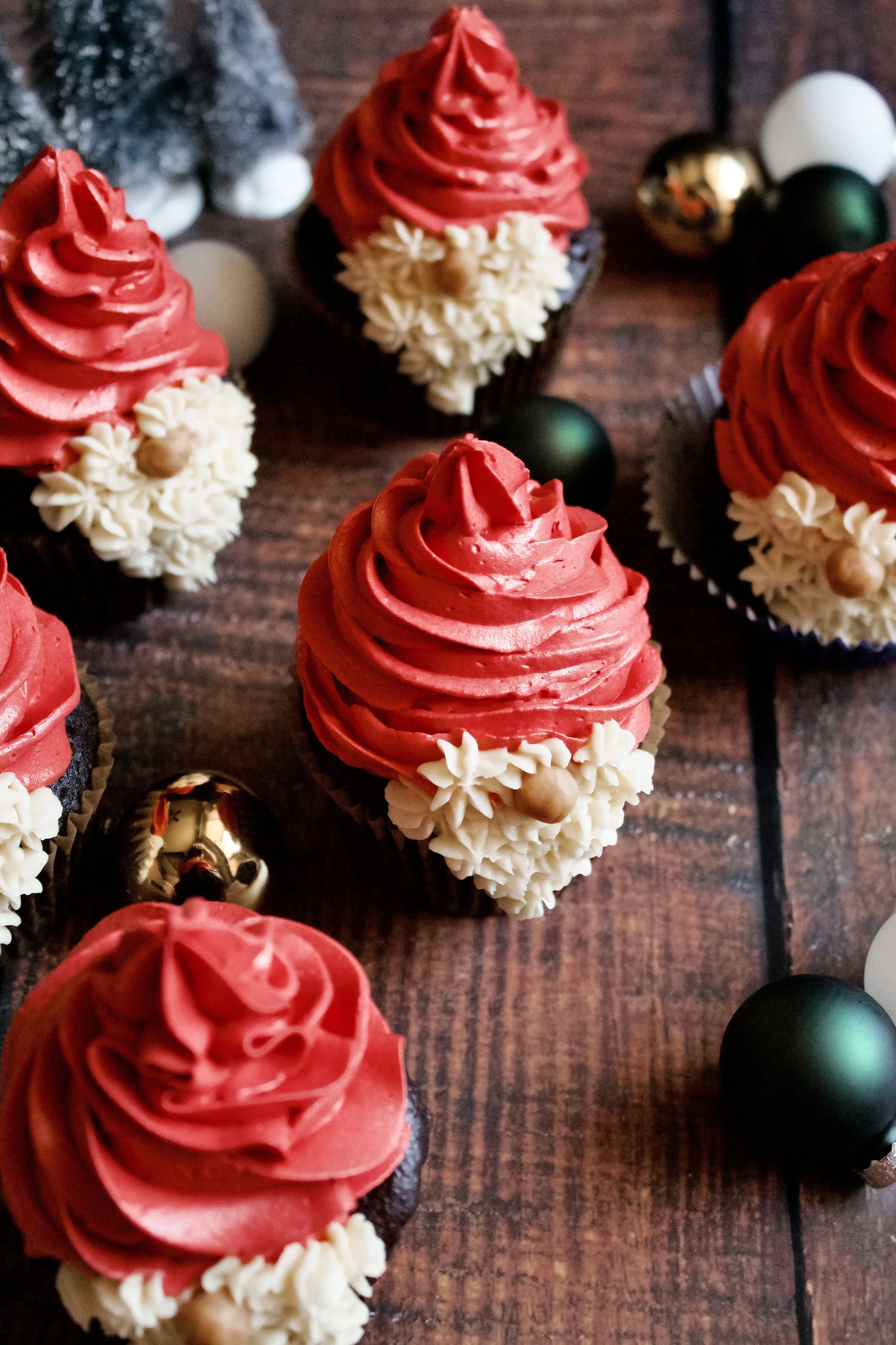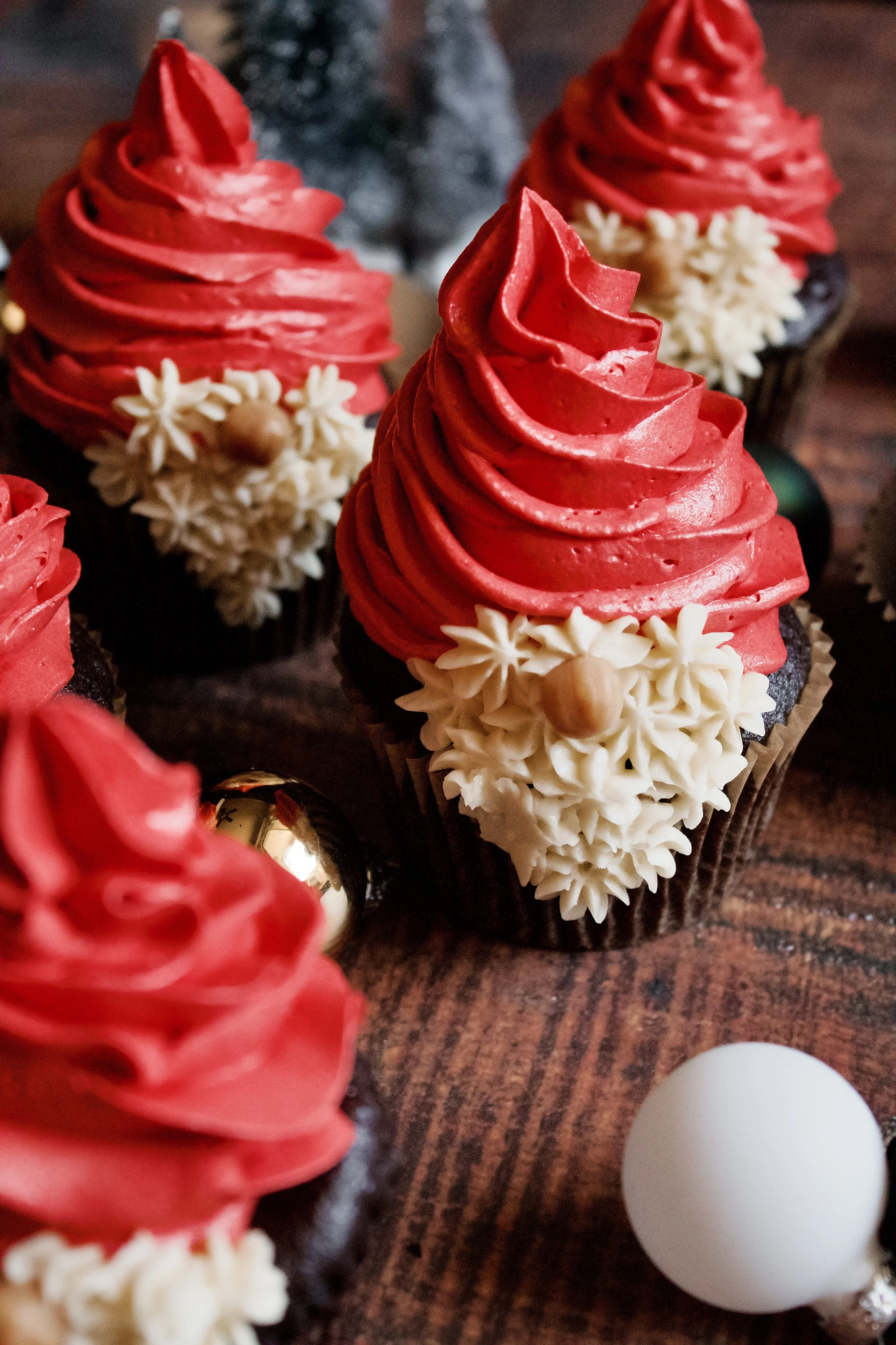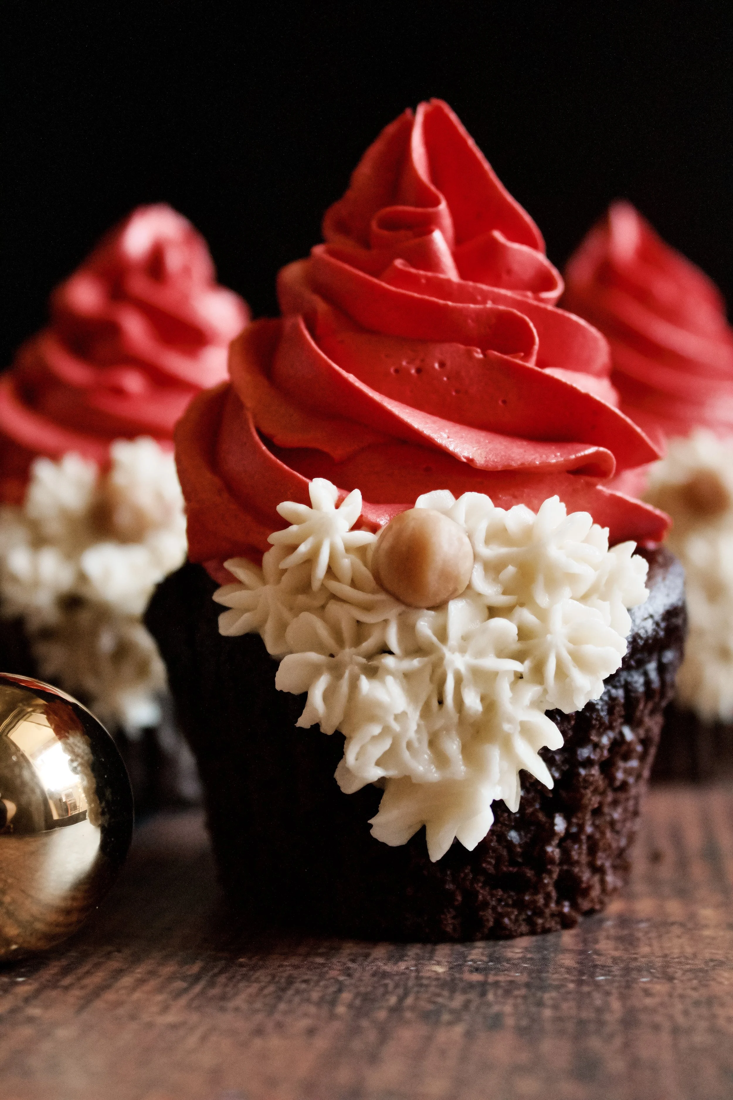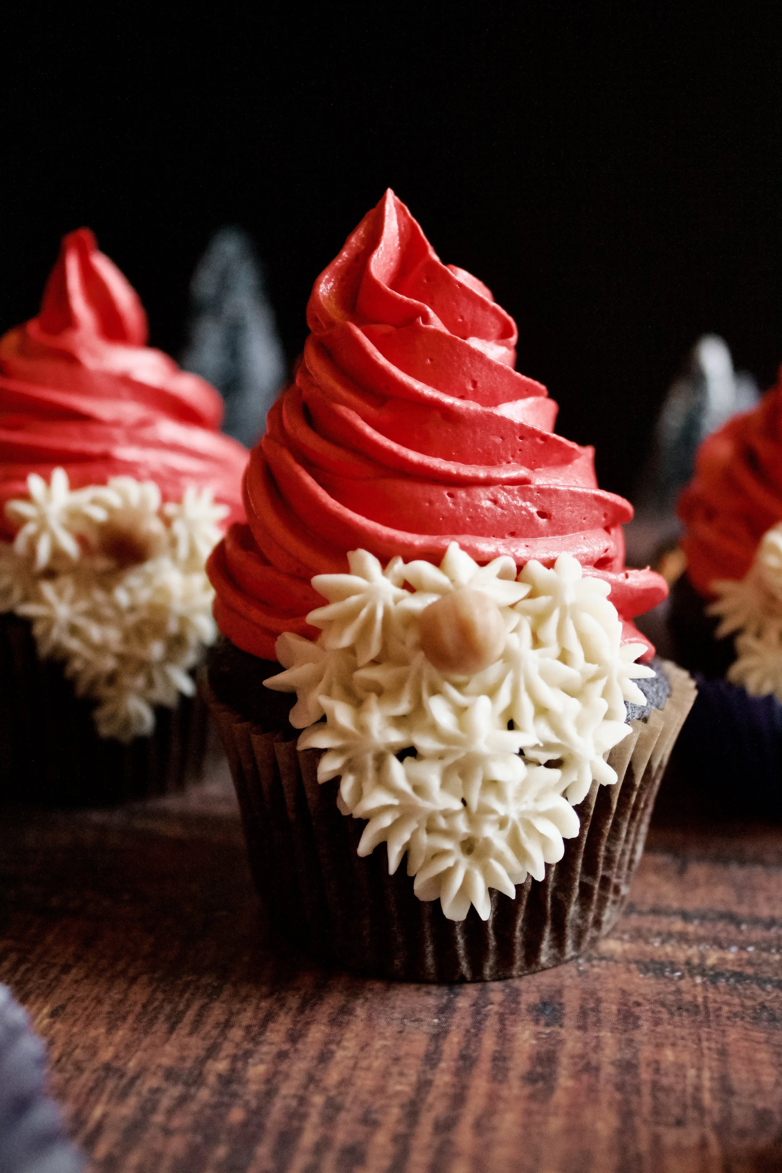 The hat is just a matter of practice. Feel free to practice on a plate, where you can scoop that hard-earned red frosting back into the piping bag afterward. I find it easiest to start at the outside, piping a swirl into the middle (in one single layer). Once you get to the middle, just continue piping up onto the second layer, this time working your way outward (but not all the way to the edge). For these, I did one small third layer that tapered into the pointy hat top.