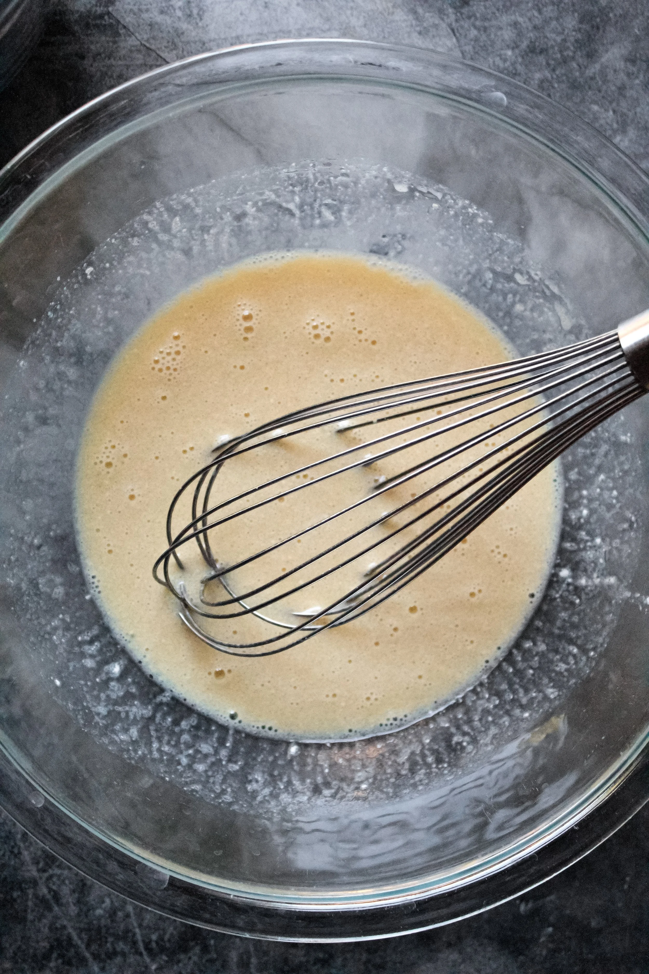 4. Slowly whisk hot coffee into wet ingredients. Whisk very quickly and pour slowly to avoid scrambling the eggs. If you do think you scrambled some, you can run it through your fine mesh sieve.