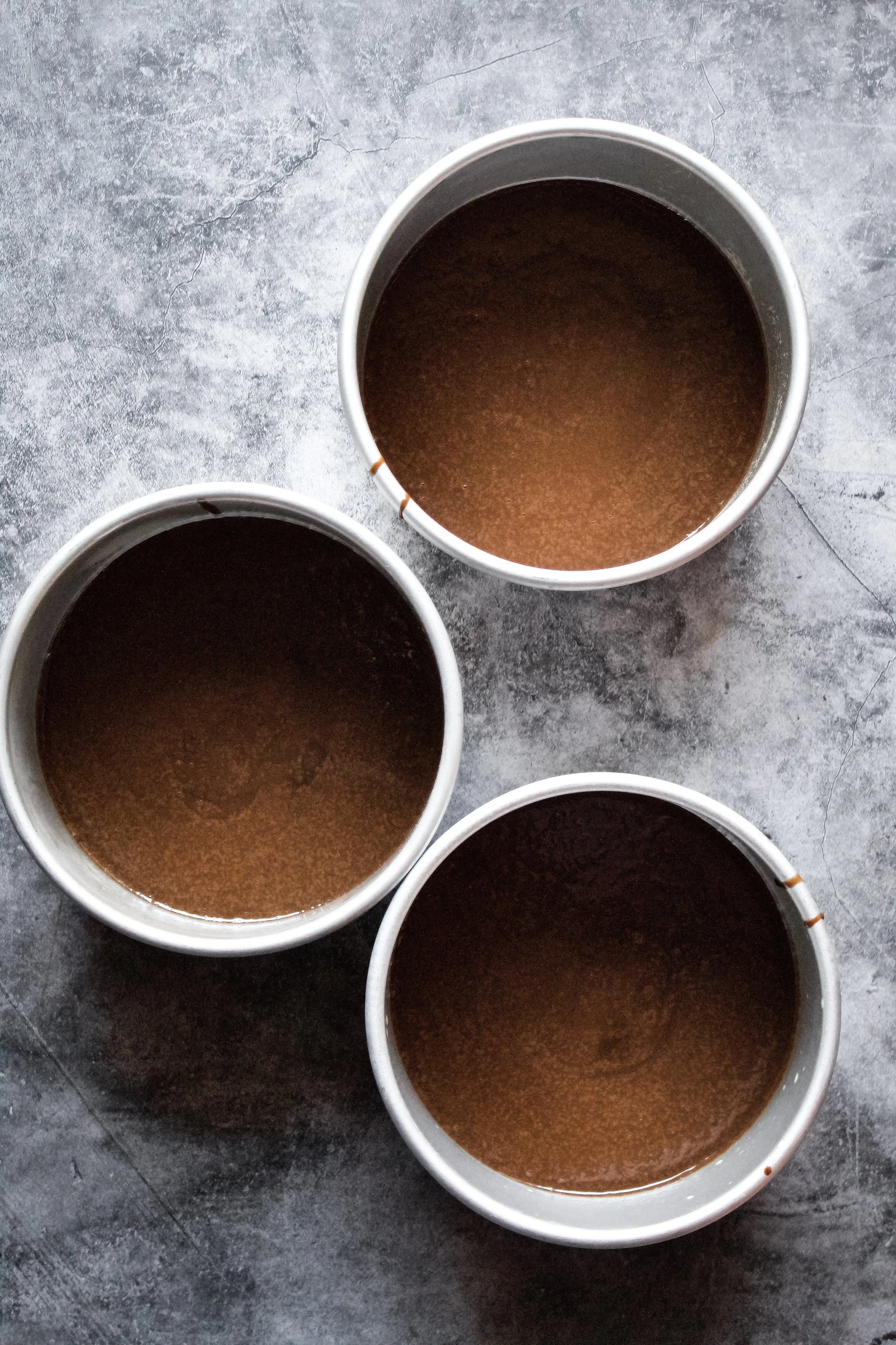 - Preheat your oven to 325F/165C. Lightly grease and flour two 8” or 9” cake pans or three 6” cake pans (or use baking spray) and line the bottom with parchment paper or silicone baking mats. This is also a great time to set your coffee to percolate (unless using hot water or espresso and hot water, which is what I do).