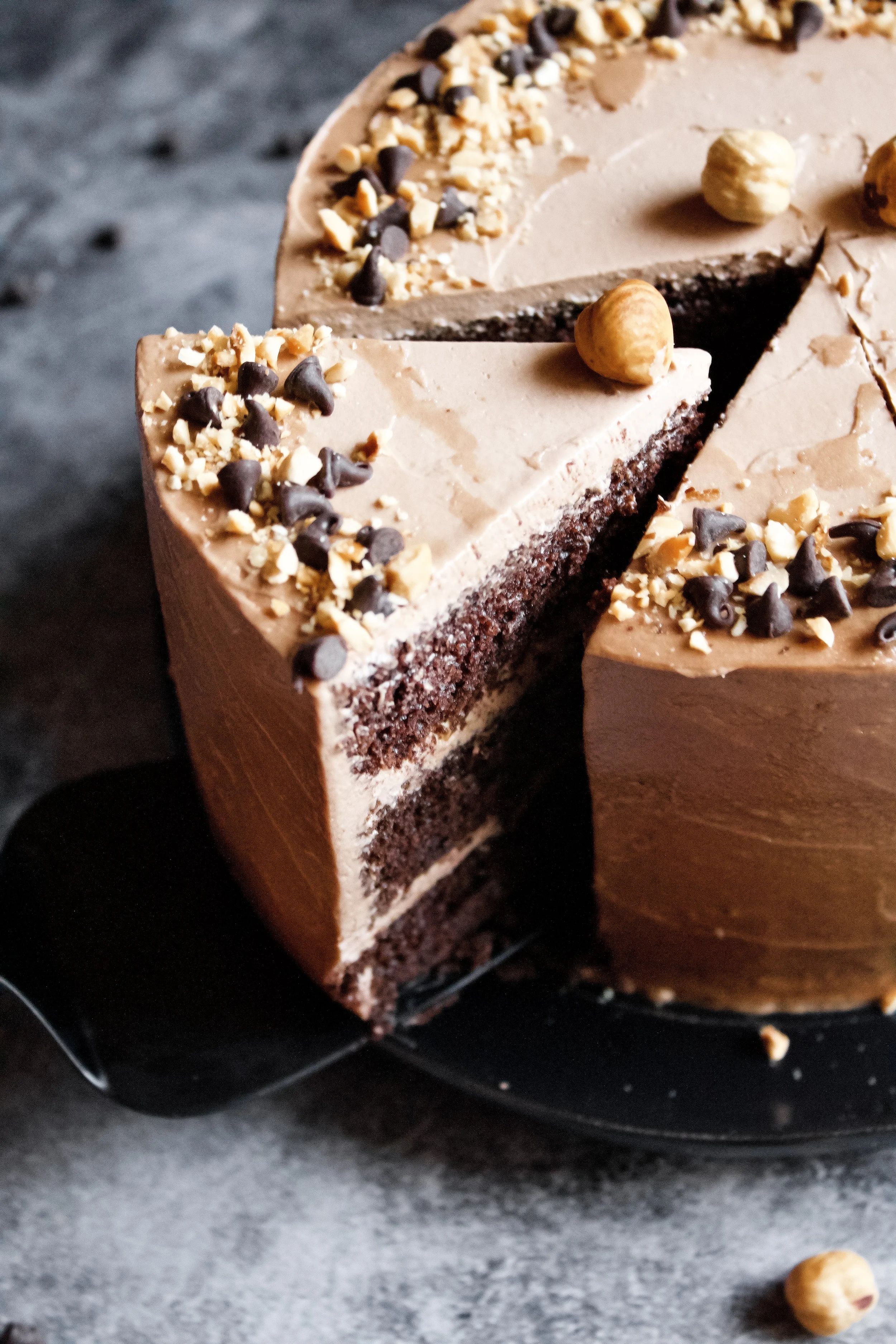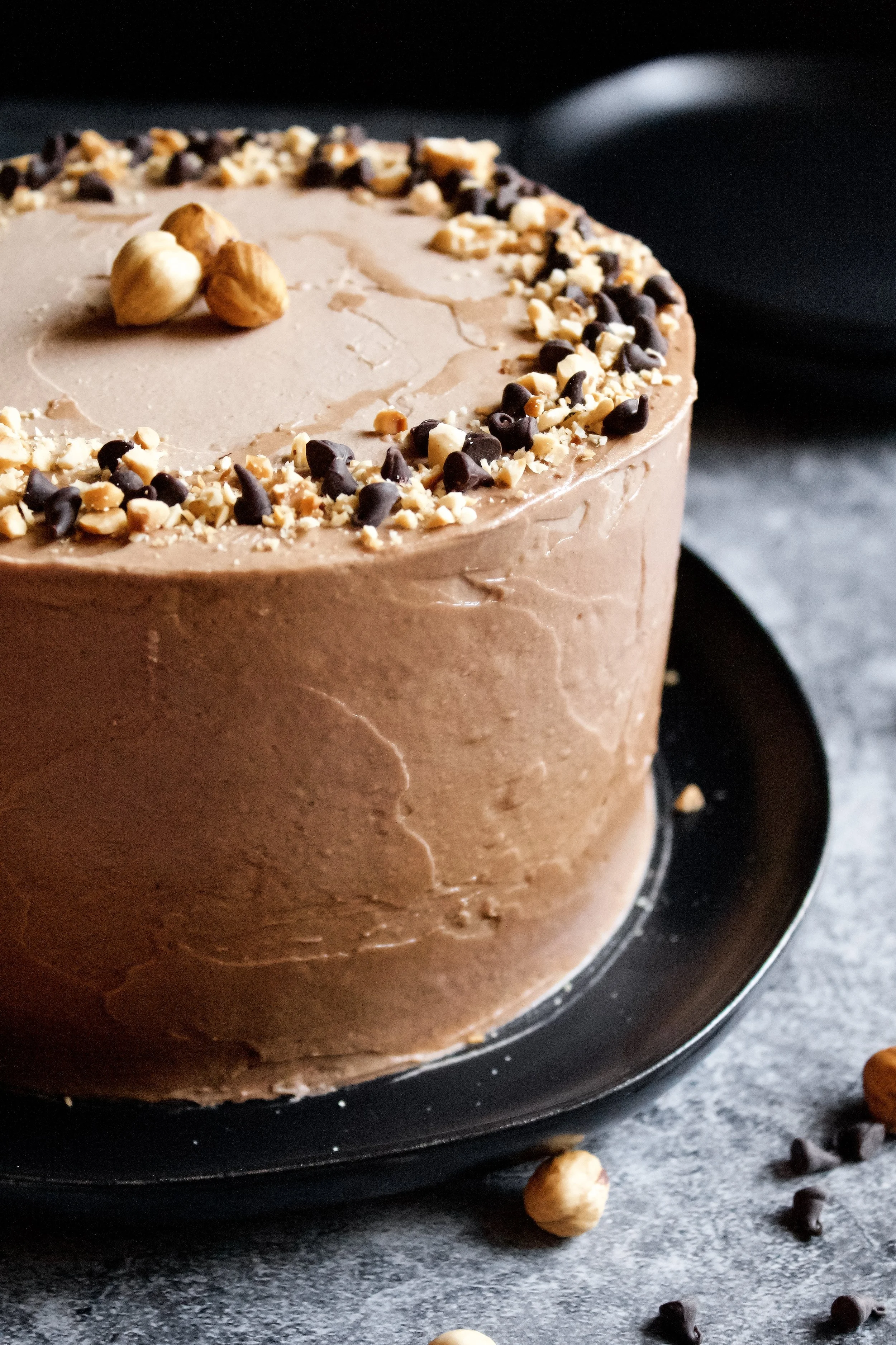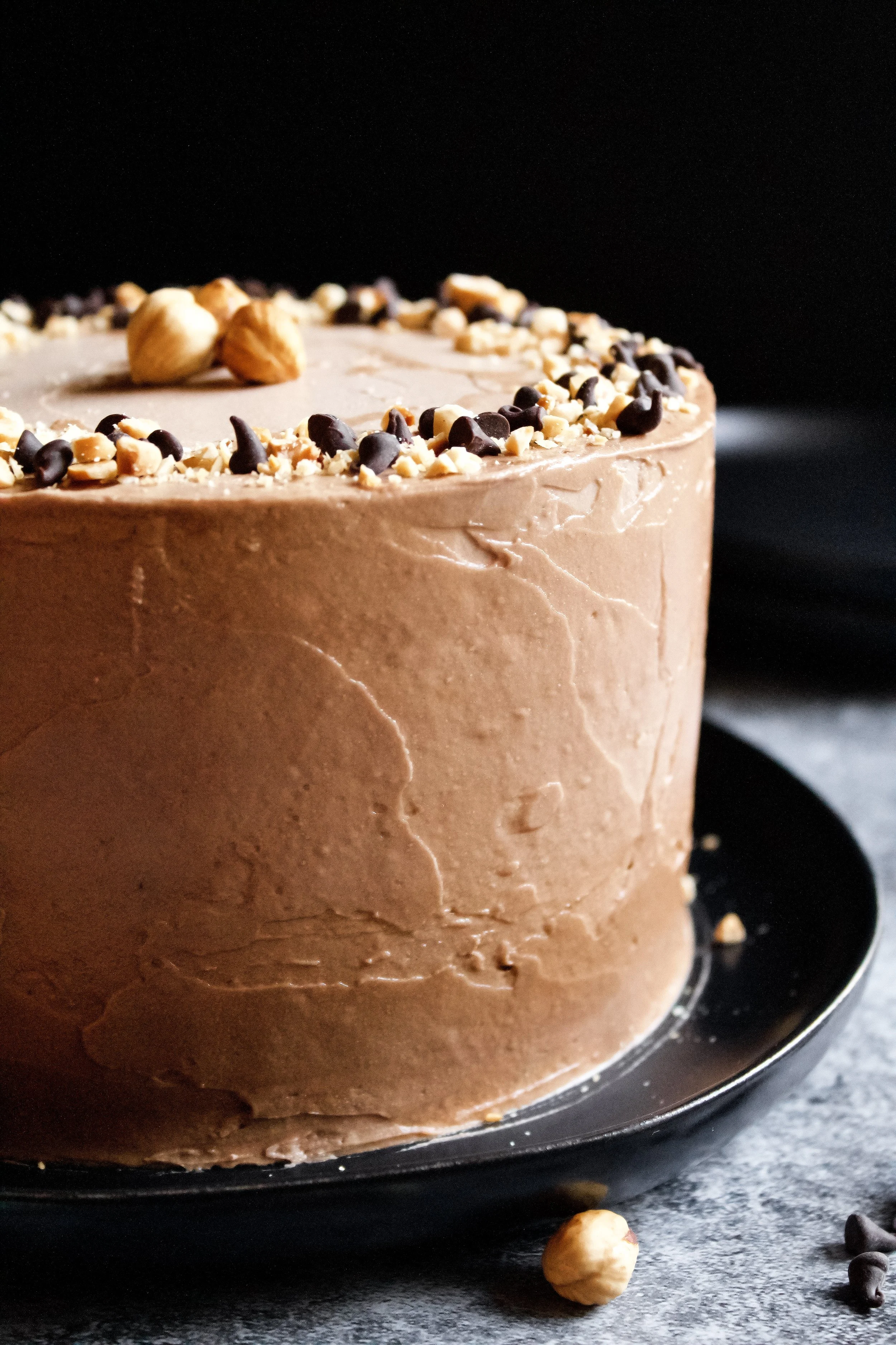 - Next, trim any rounded tops off of the cake layers with a long serrated knife or cake leveler. If desired, carefully cut each layer in half to make room for more filling. Place the first layer on a cake plate or board. Frost generously with the buttercream then add ⅓ to ½ of the hazelnuts (depending on how many layers you made and if you want to add some to the top for decoration). Add some mini chocolate chips, then continue stacking your cake. Optionally, you can also drizzle some chocolate hazelnut spread on each layer of filling/nuts. Once the whole cake is stacked, frost to desired thickness and decorate with more chopped nuts and mini chocolate chips.