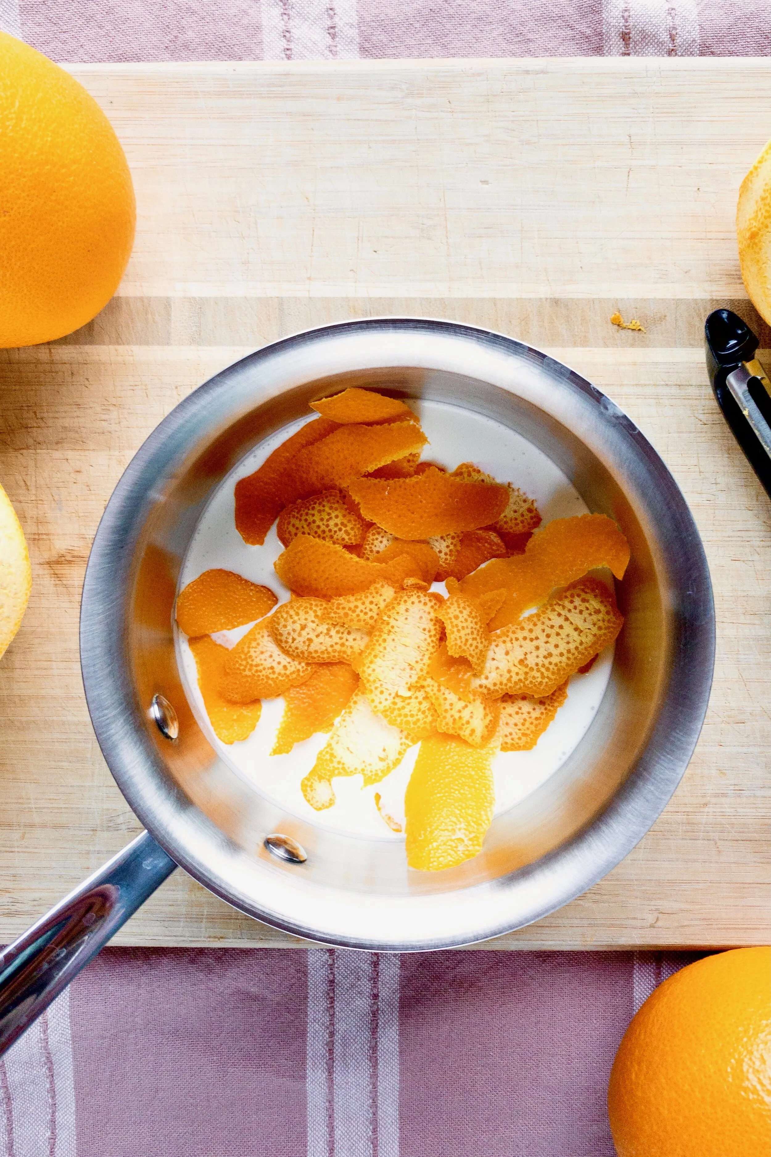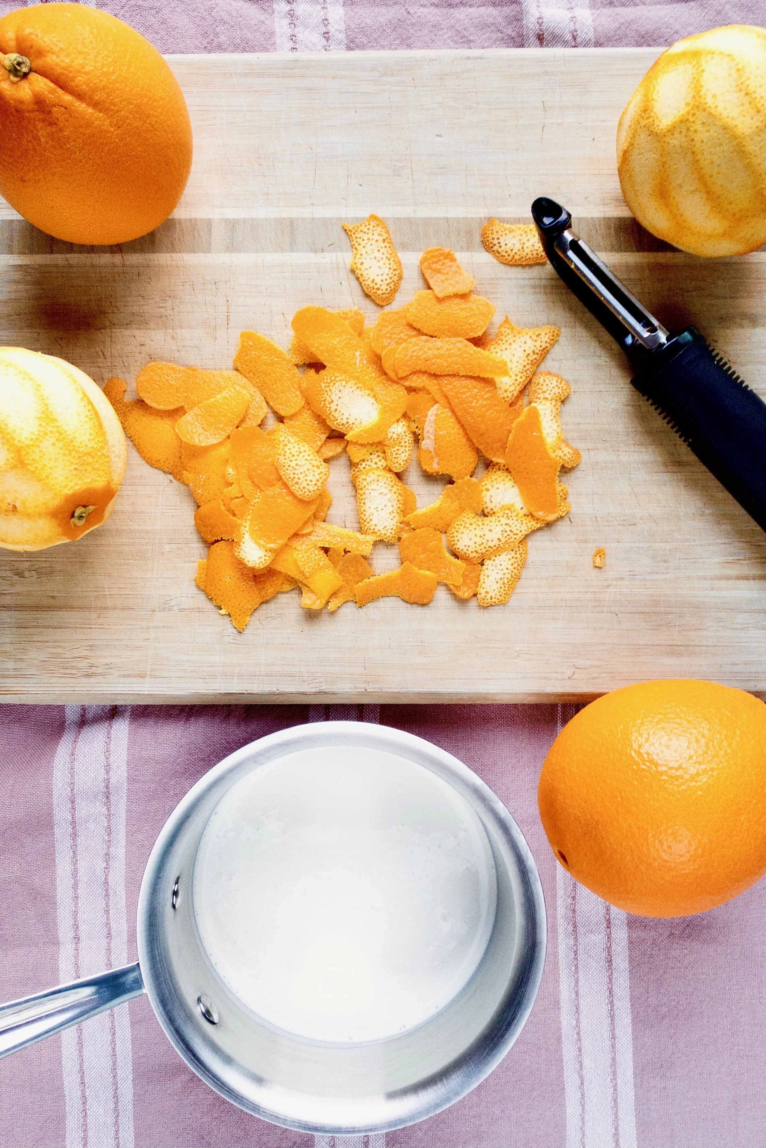 - First, be sure to wash the oranges with fruit and vegetable wash or diluted white vinegar to remove wax, dirt, and pesticides, since you’ll be using the zest. Use a potato peeler to peel the zest of 2 oranges, trying to avoid getting a lot of the pith (white part). Use a zester or grater to grade the zest of the third orange. Juice half of one orange (you can reserve the rest of the fruit/juice for something else).