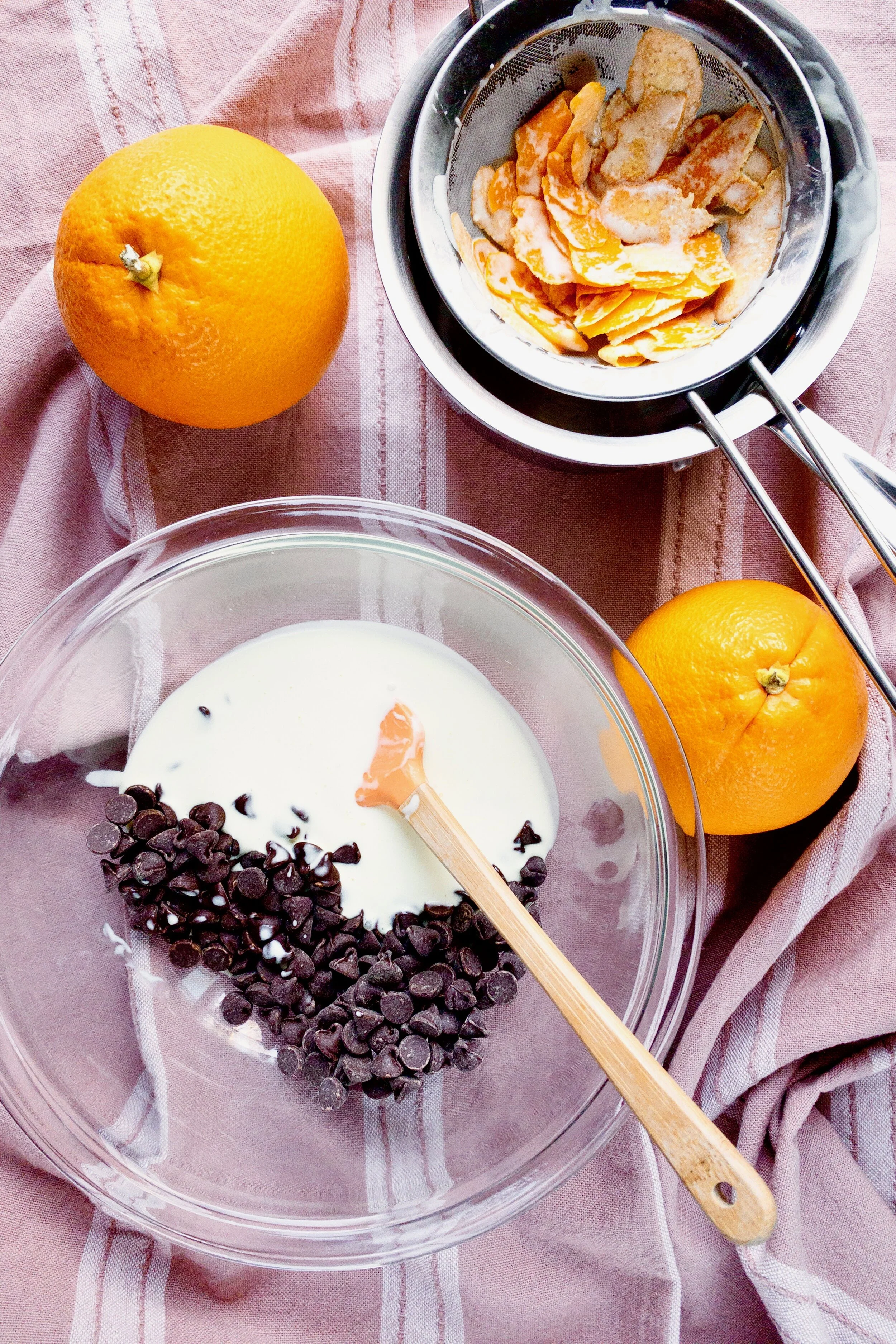 - Steep the oranges. Place the peeled zest and heavy whipping cream in a small saucepan. Over medium heat, bring the cream to a simmer, stirring constantly to avoid scalding it. Once simmering, remove from heat and set aside. Stir frequently for the first few minutes after removing it so it doesn’t form a skin. Let steep 1 hour. This is a great time to take your butter out to soften.