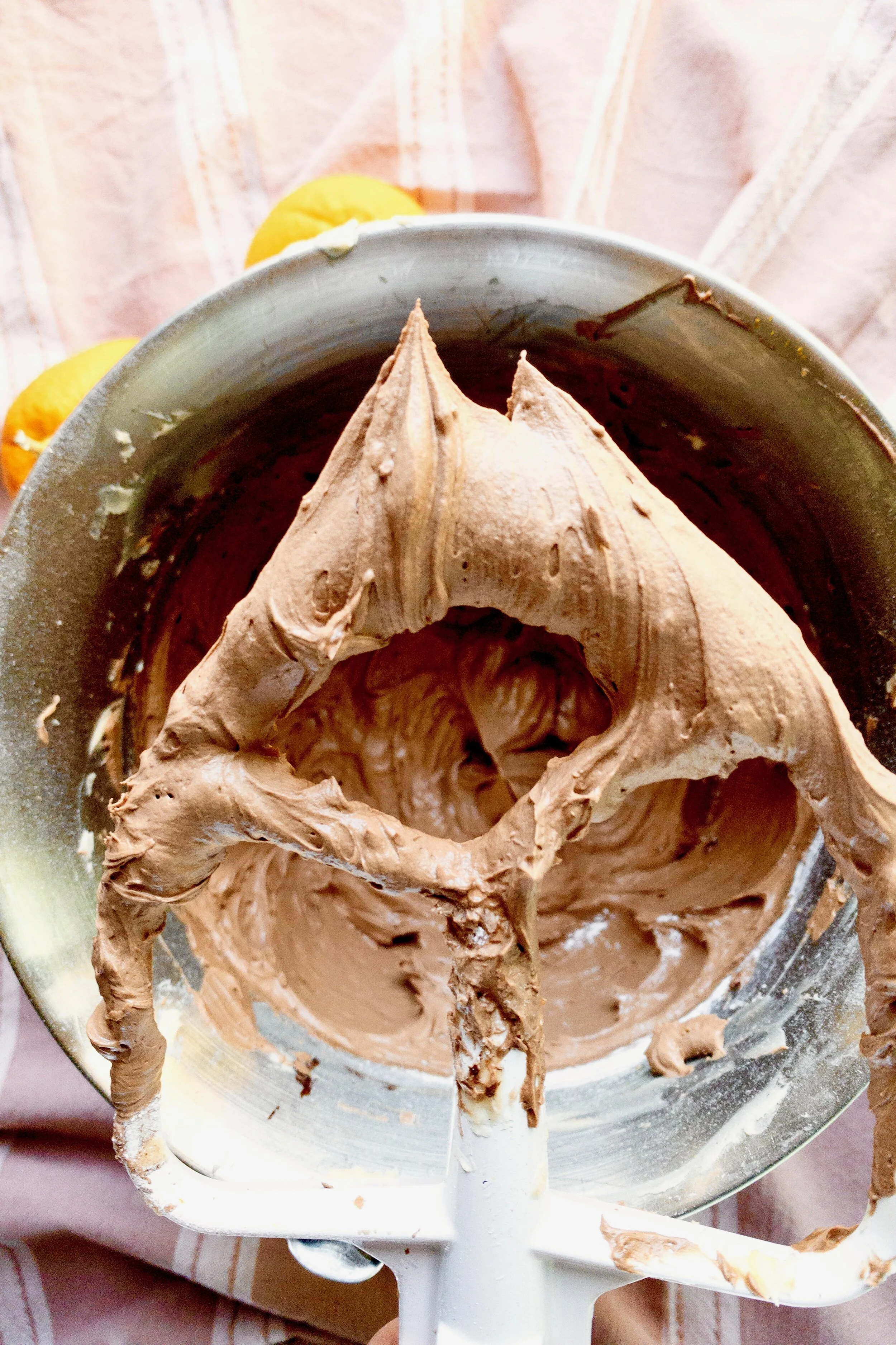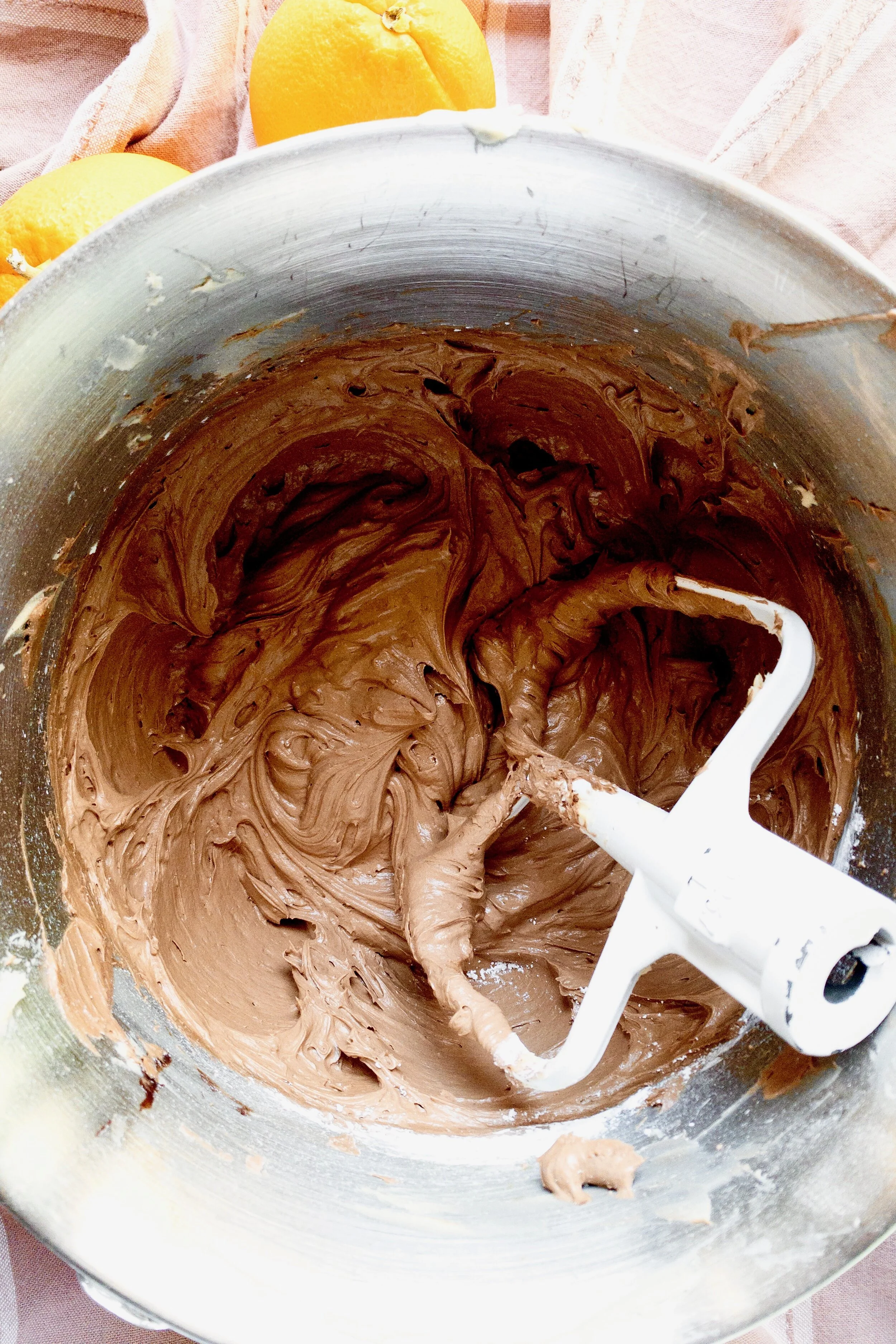 Add the grated zest, cocoa powder, vanilla, salt, and orange extract (if using—I didn’t find it necessary). Beat until smooth. Add the cooled ganache (refrigerate it for 5 minutes if it’s not cooled yet). Beat on high until smooth.