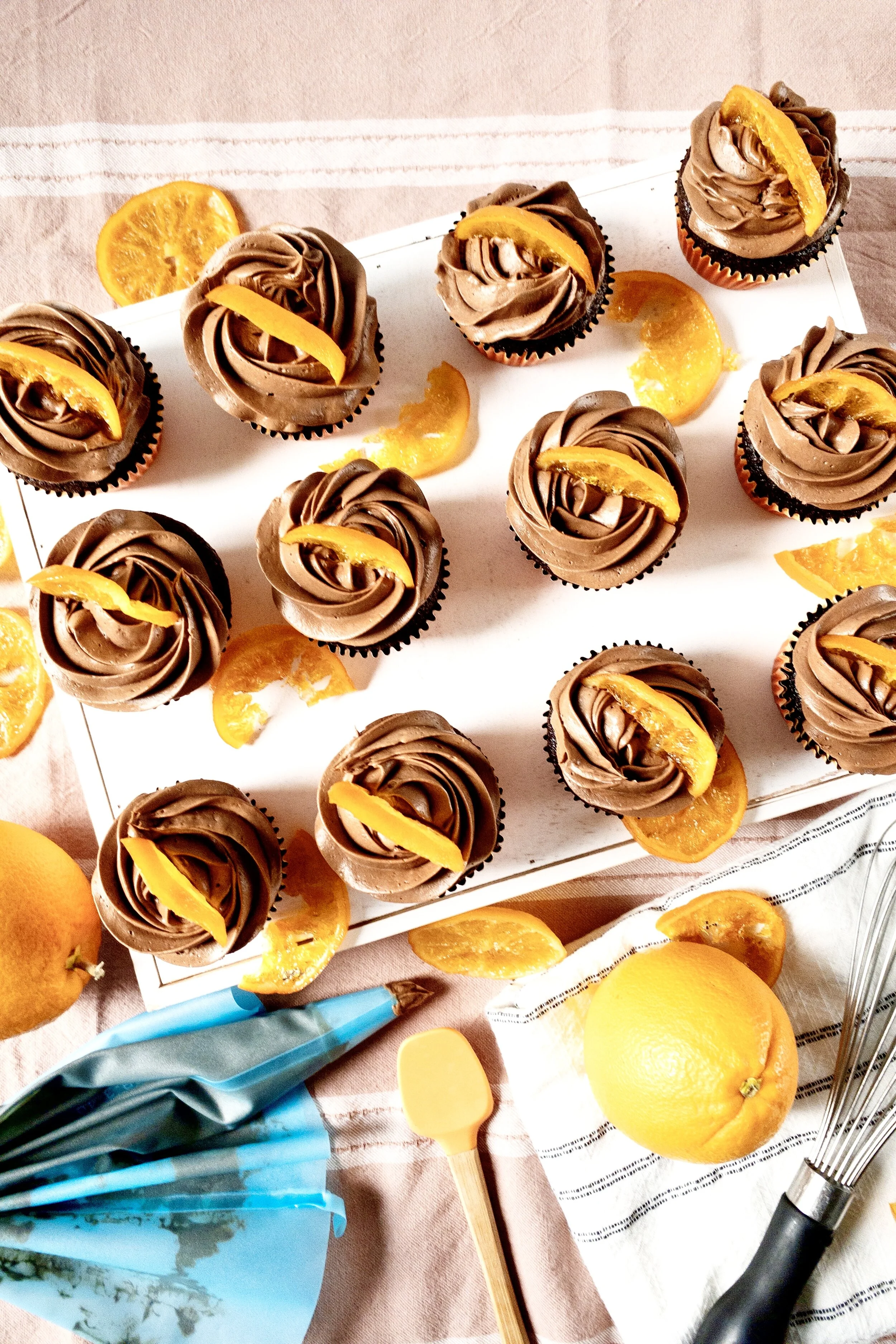 - Let cool in pan 5-10 minutes then remove to cool completely. While cupcakes cool, make the buttercream. Frost or pipe buttercream on cooled cupcakes. Top with half a candied orange.