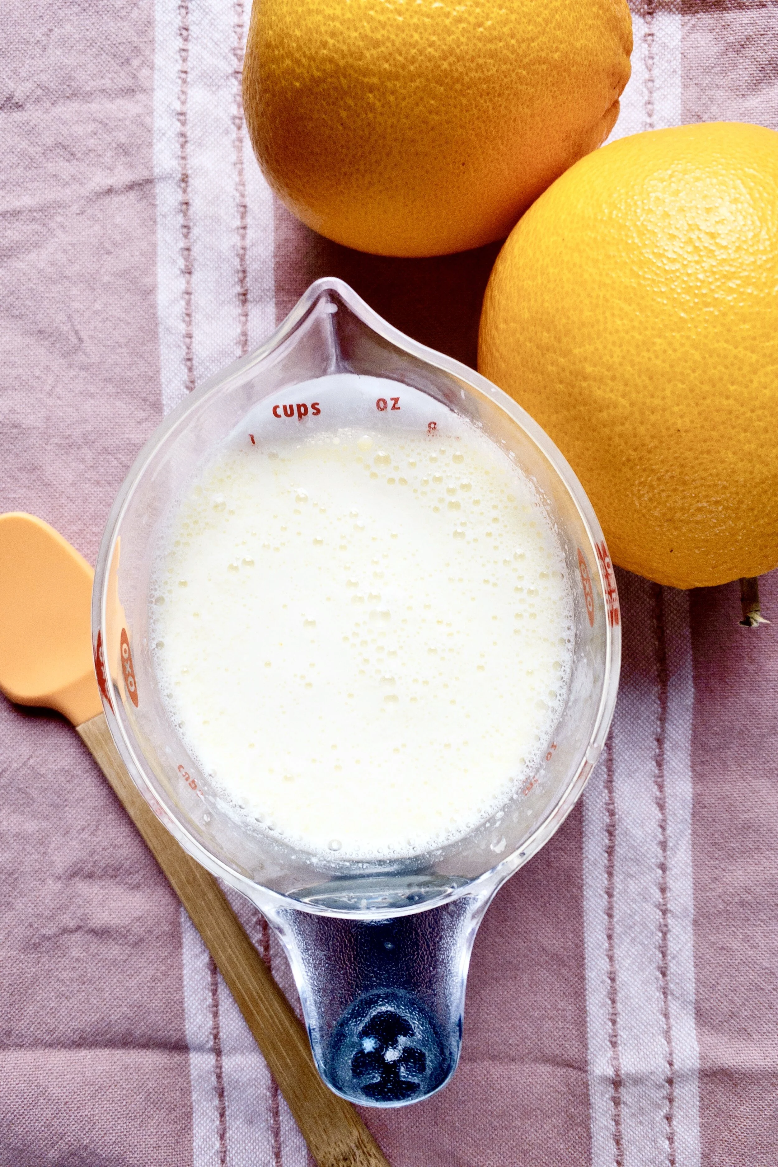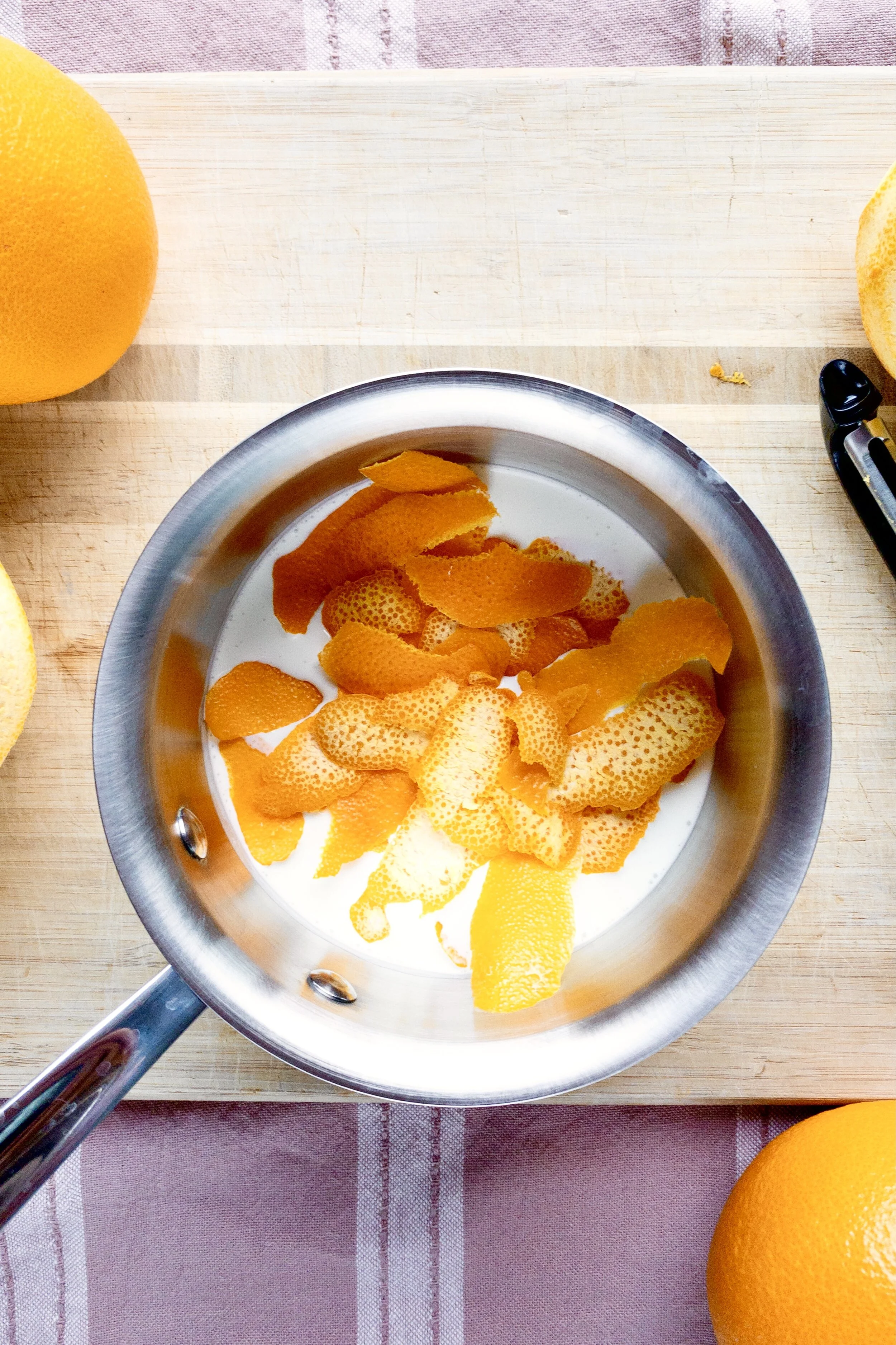 - Steep the zest. Place the peeled zest and milk in a small saucepan. Over medium heat, bring the milk to a simmer, stirring constantly to avoid scalding it. Once simmering, remove from heat and set aside. Stir frequently for the first few minutes after removing it so it doesn’t form a skin. Let steep 1 hour. This is a great time to take your butter and eggs out to warm up as well as to heat and steep the heavy cream and soften the butter for the buttercream.