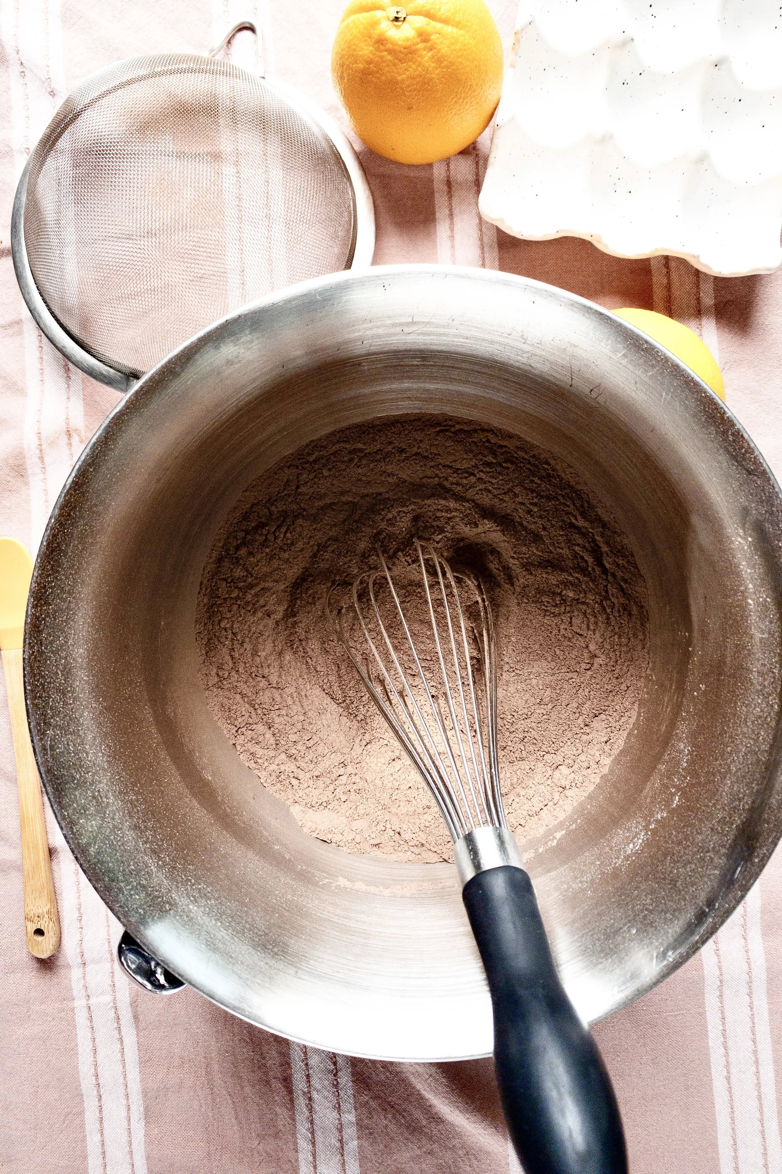 - Sift then whisk together the sugar, flour, cocoa powder, baking powder, baking soda, and salt in the bowl of your stand mixer or a large mixing bowl. Don’t skip the sifting! Fit to the mixer with the paddle attachment.