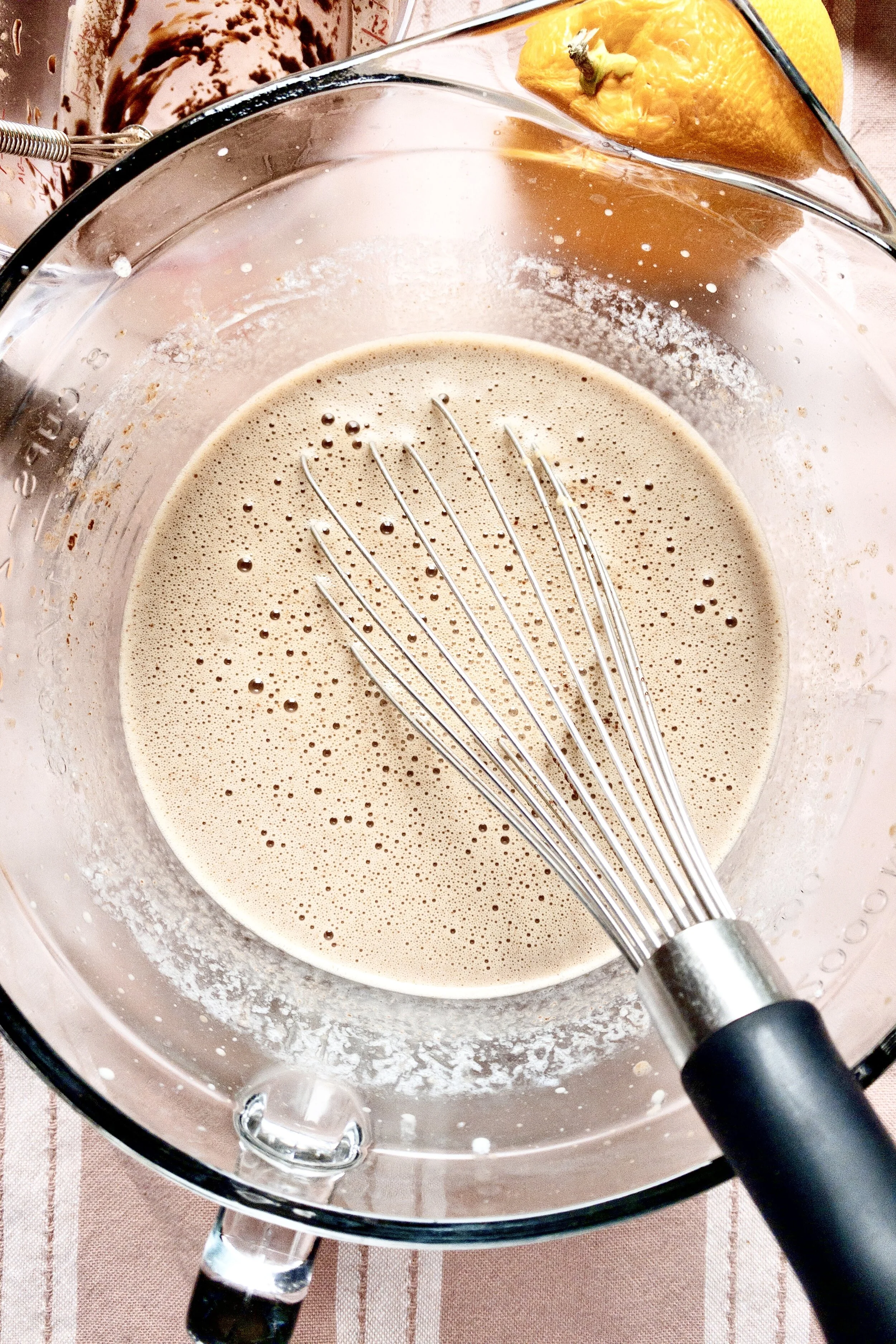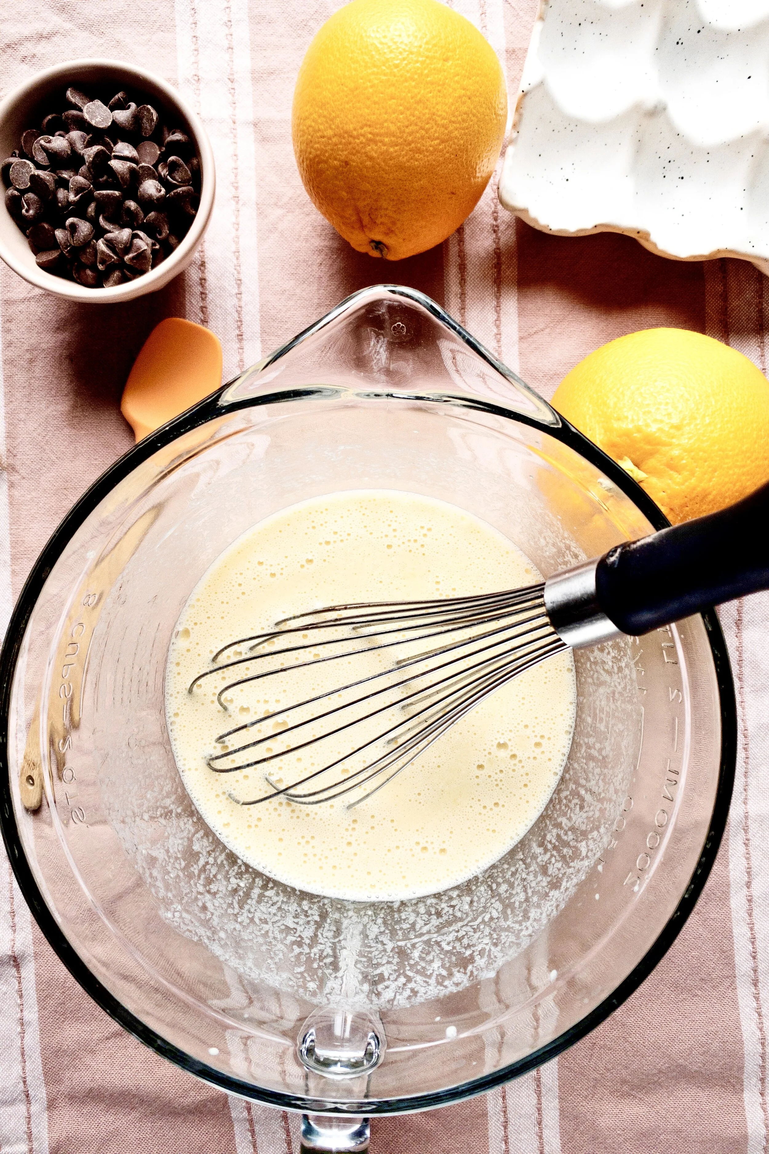 - Vigorously whisk the eggs, oil, vanilla, and milk/juice for about 30 seconds until very well combined.