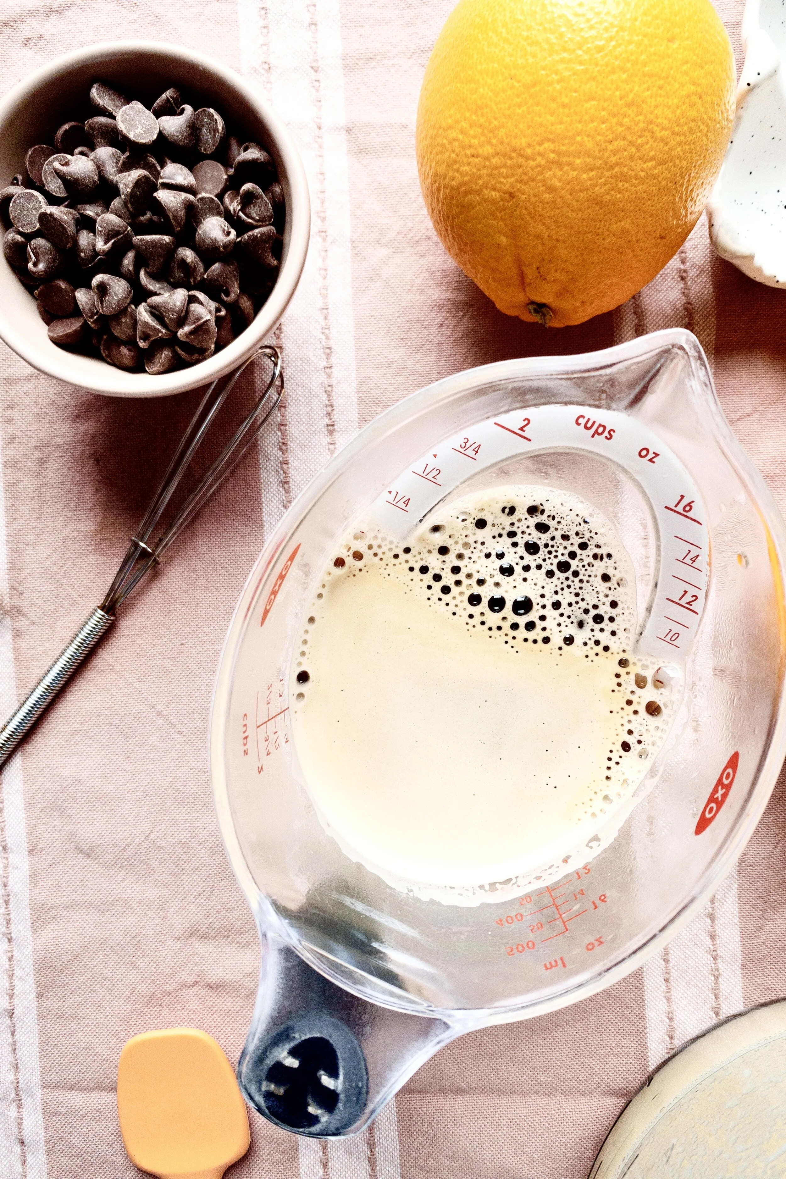 Once that’s steeped for at least an hour, add enough fresh orange juice to equal 1 cup of milk/juice (depends how much milk evaporated in the heating and cooling process). Let that sit 5-10 minutes while you prep the rest of the ingredients as well as your cupcake pans.