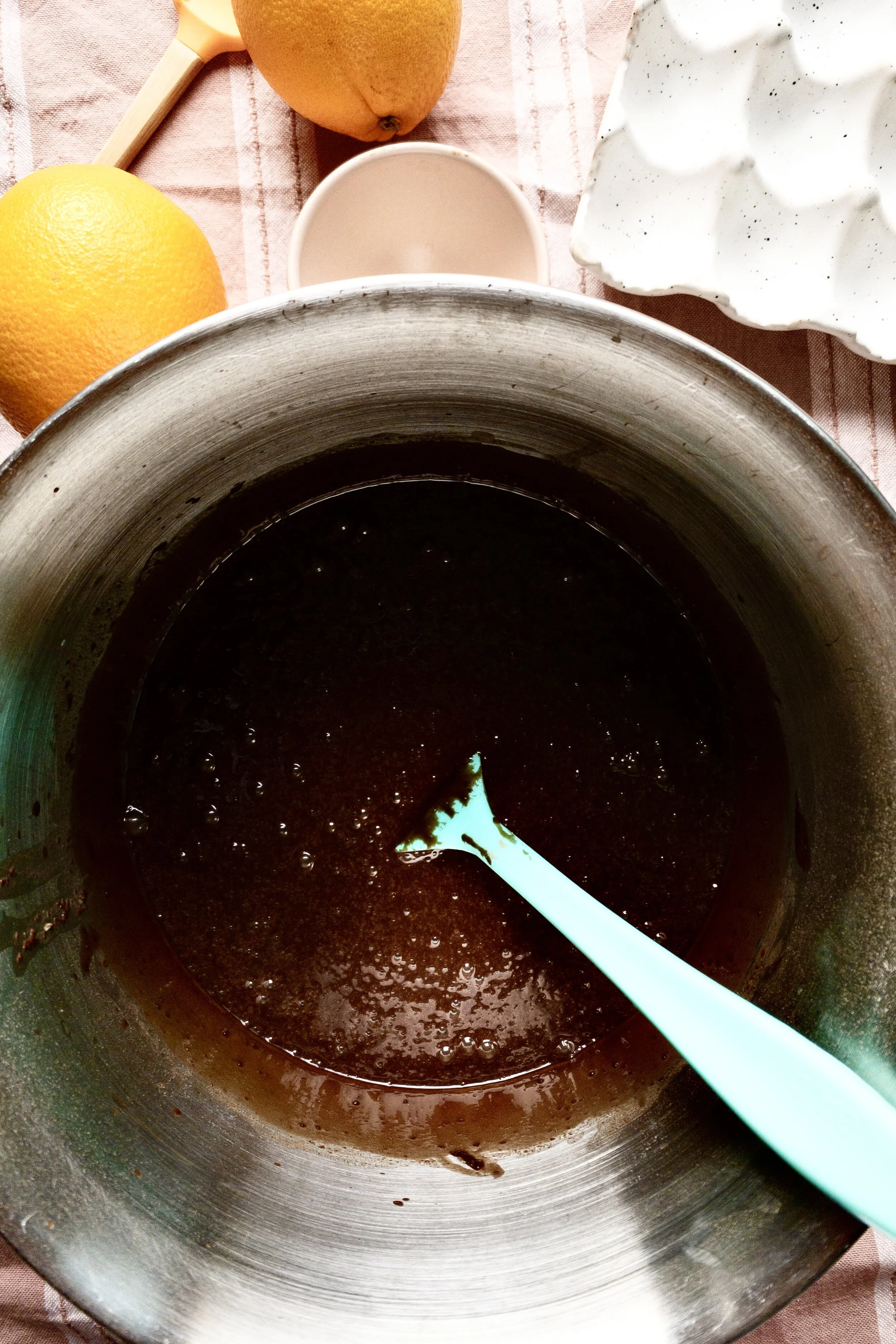 - First, be sure to wash the oranges with fruit and vegetable wash or diluted white vinegar to remove wax, dirt, and pesticides, since you’ll be using the zest. Use a potato peeler to peel the zest of 2-3 oranges, trying to avoid getting a lot of the pith (white part). Juice half of one of the oranges (save remaining fruit or juice for another bake or to get your vitamin C boost!).
