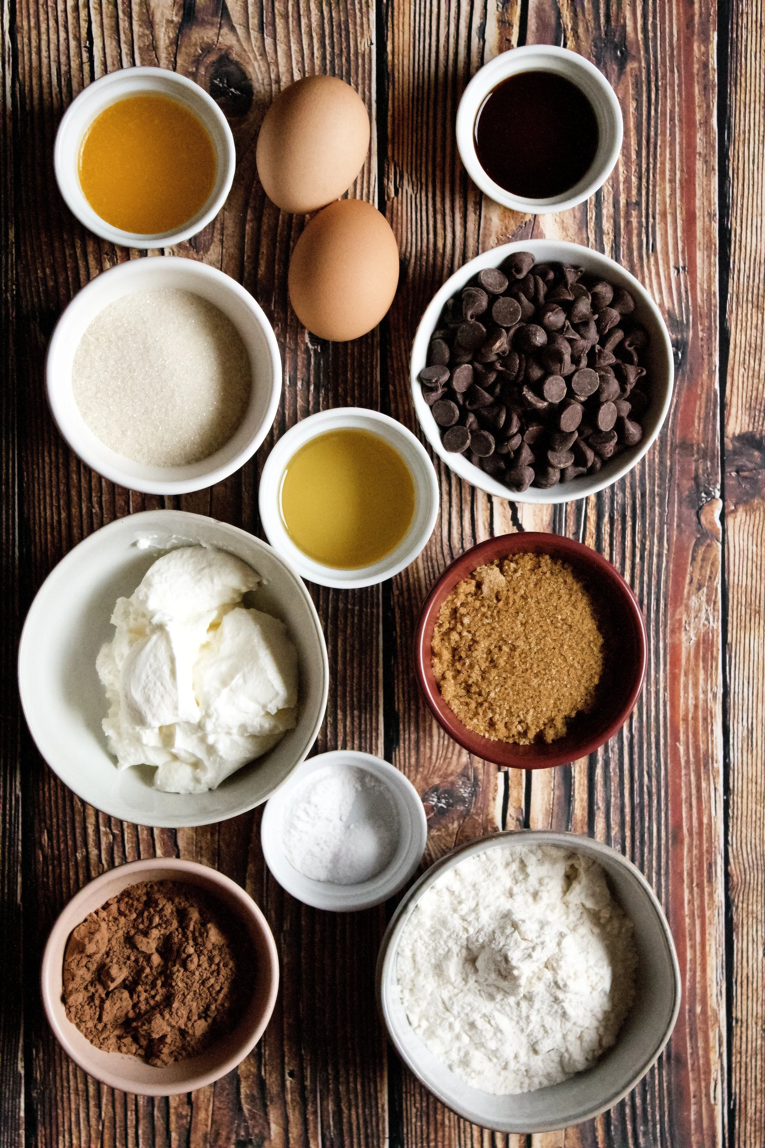 First, I decided to use greek yogurt instead of applesauce, to keep these from crumbling and also ensure a more consistent moisture balance. Applesauce can sometimes be too liquidy, meaning you need more flour, which in turn can make the muffin (or bread) dry out faster. Greek yogurt brings that moisture without requiring extra flour or cocoa.
