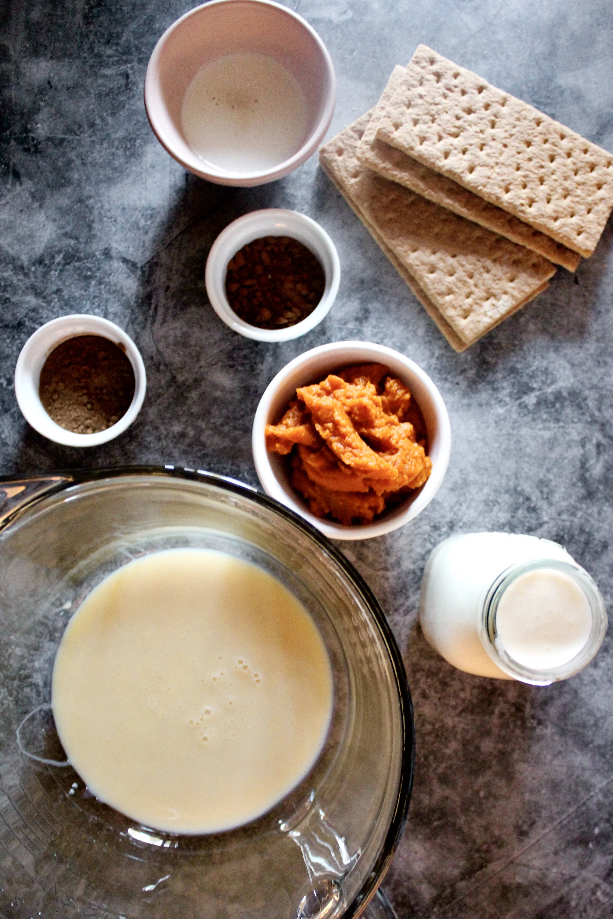- Make the pumpkin pie ice cream. Stir the sweetened condensed milk, pumpkin puree, vanilla, pumpkin pie spice, and cinnamon in a large bowl until well blended. Set aside.