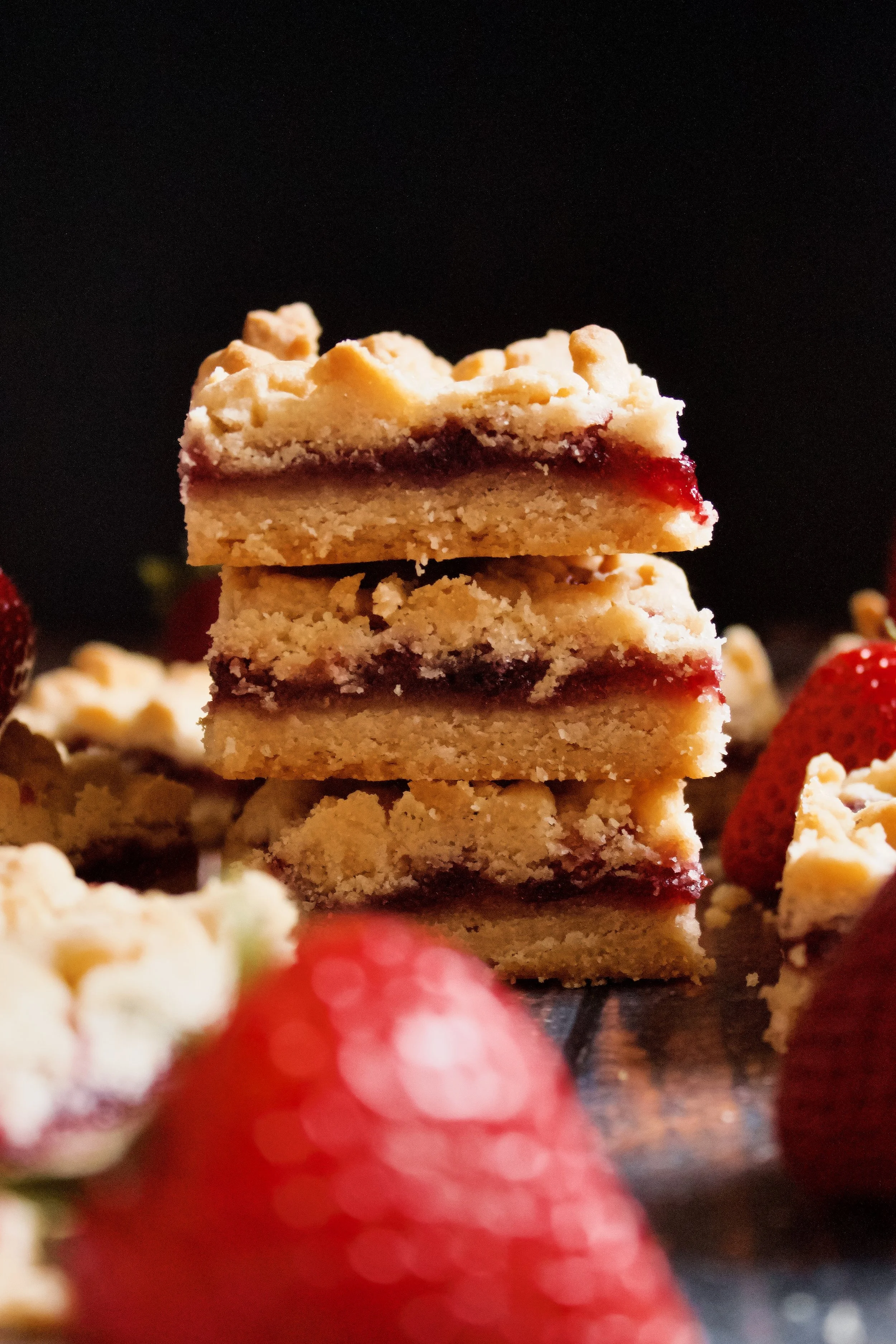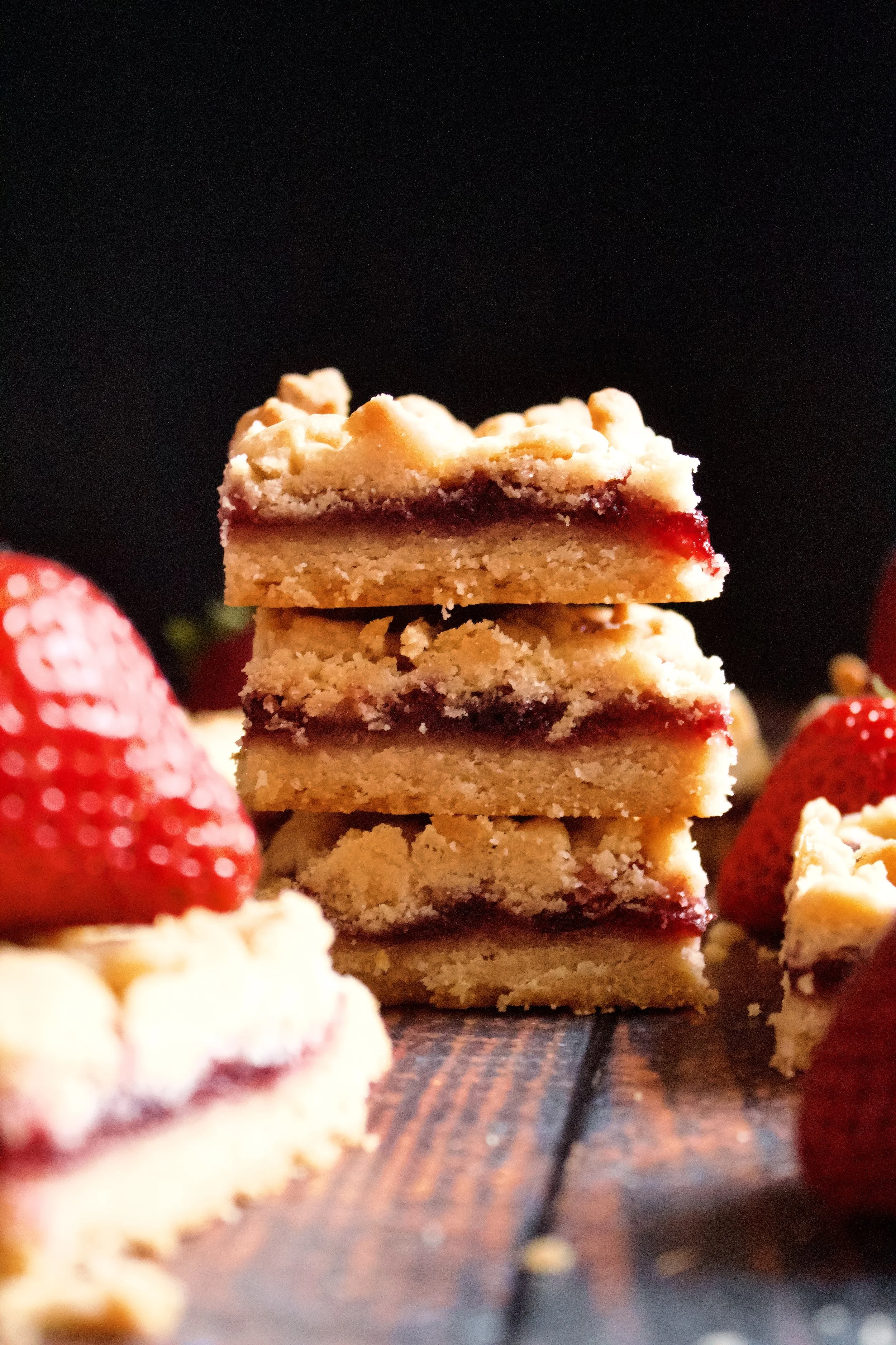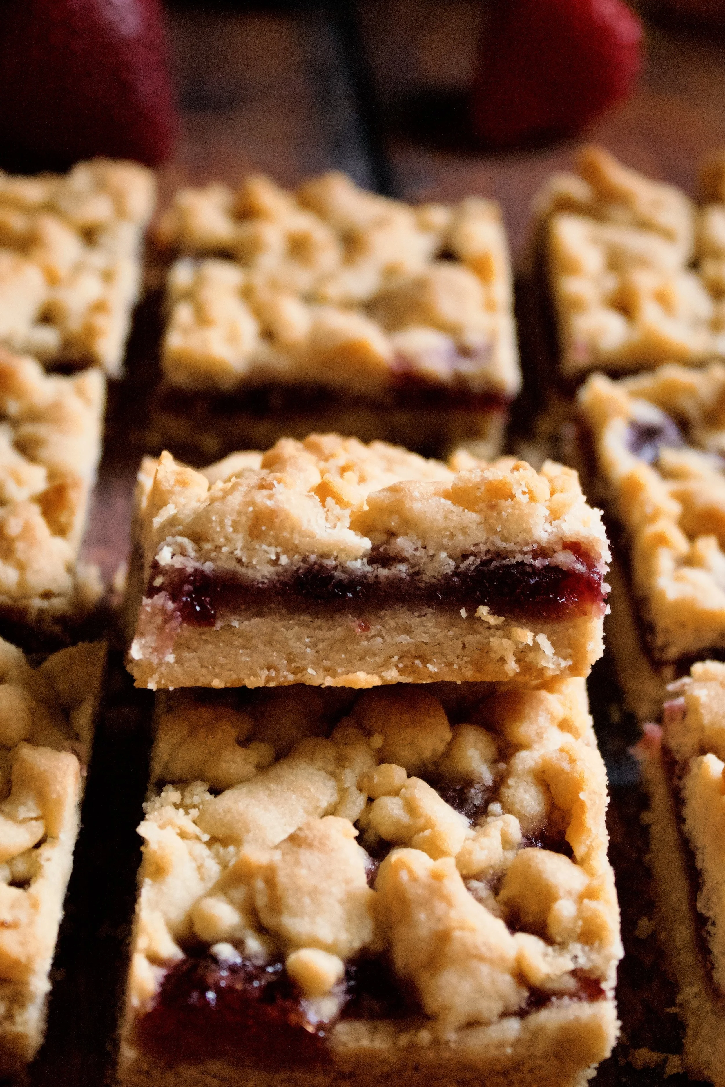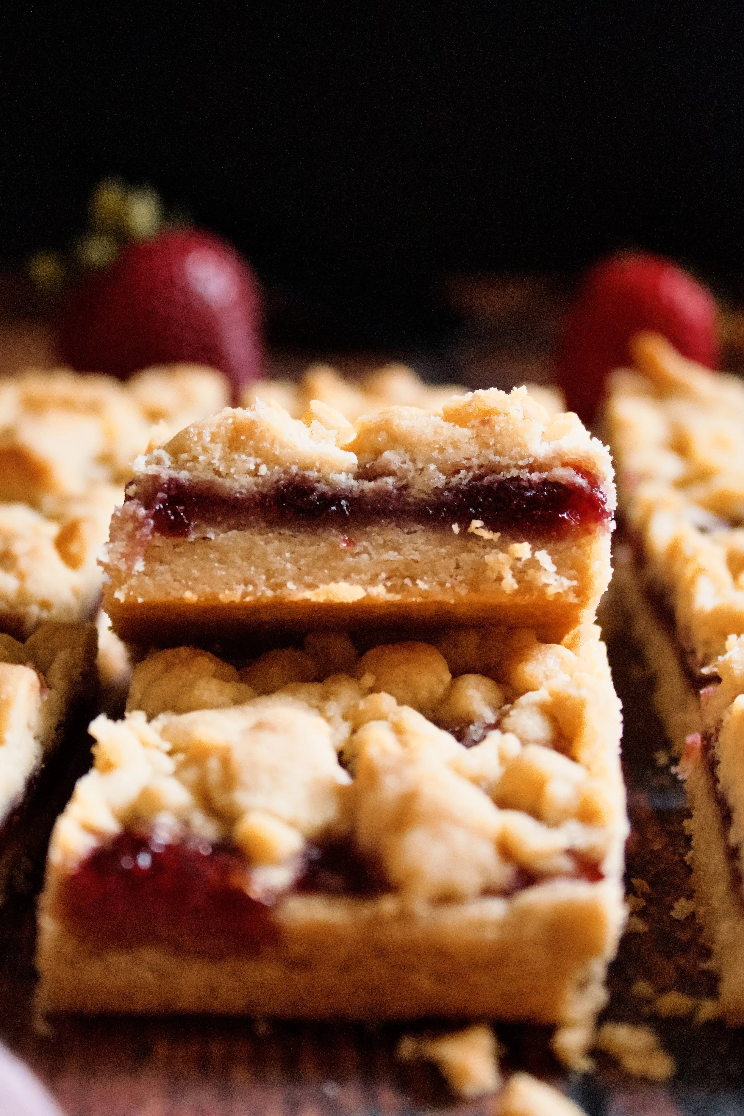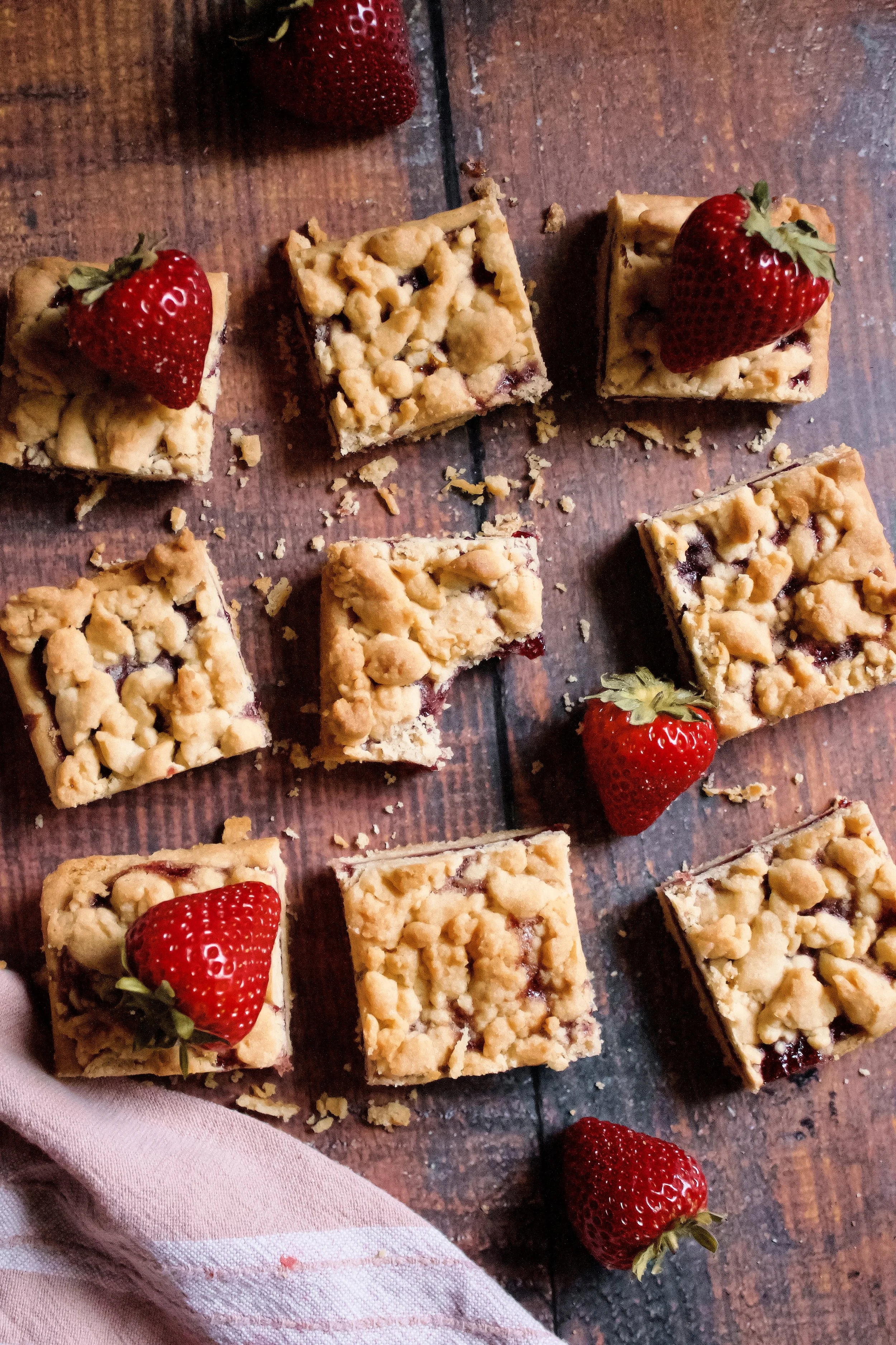 Tender peanut butter shortbread filled with homemade jam. These bars are quick and easy to make and are the perfect back-to-school snack!