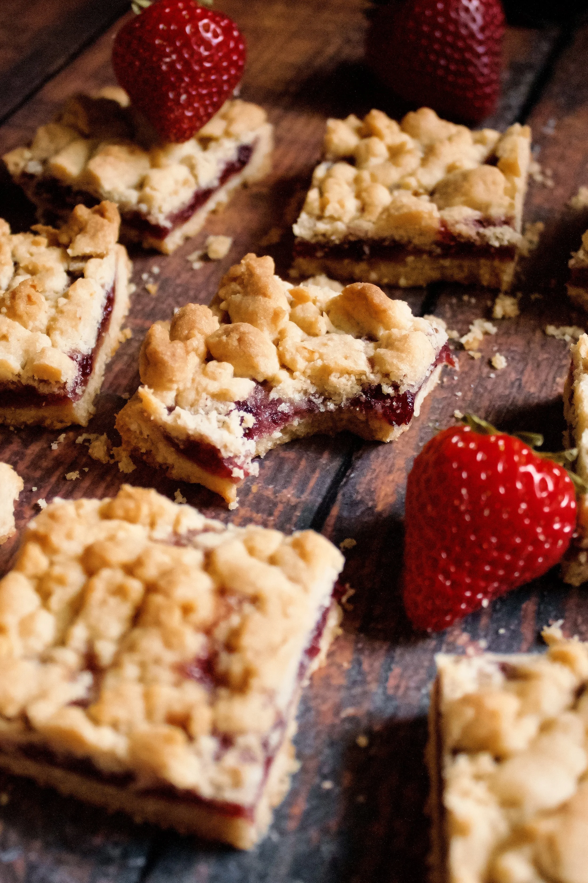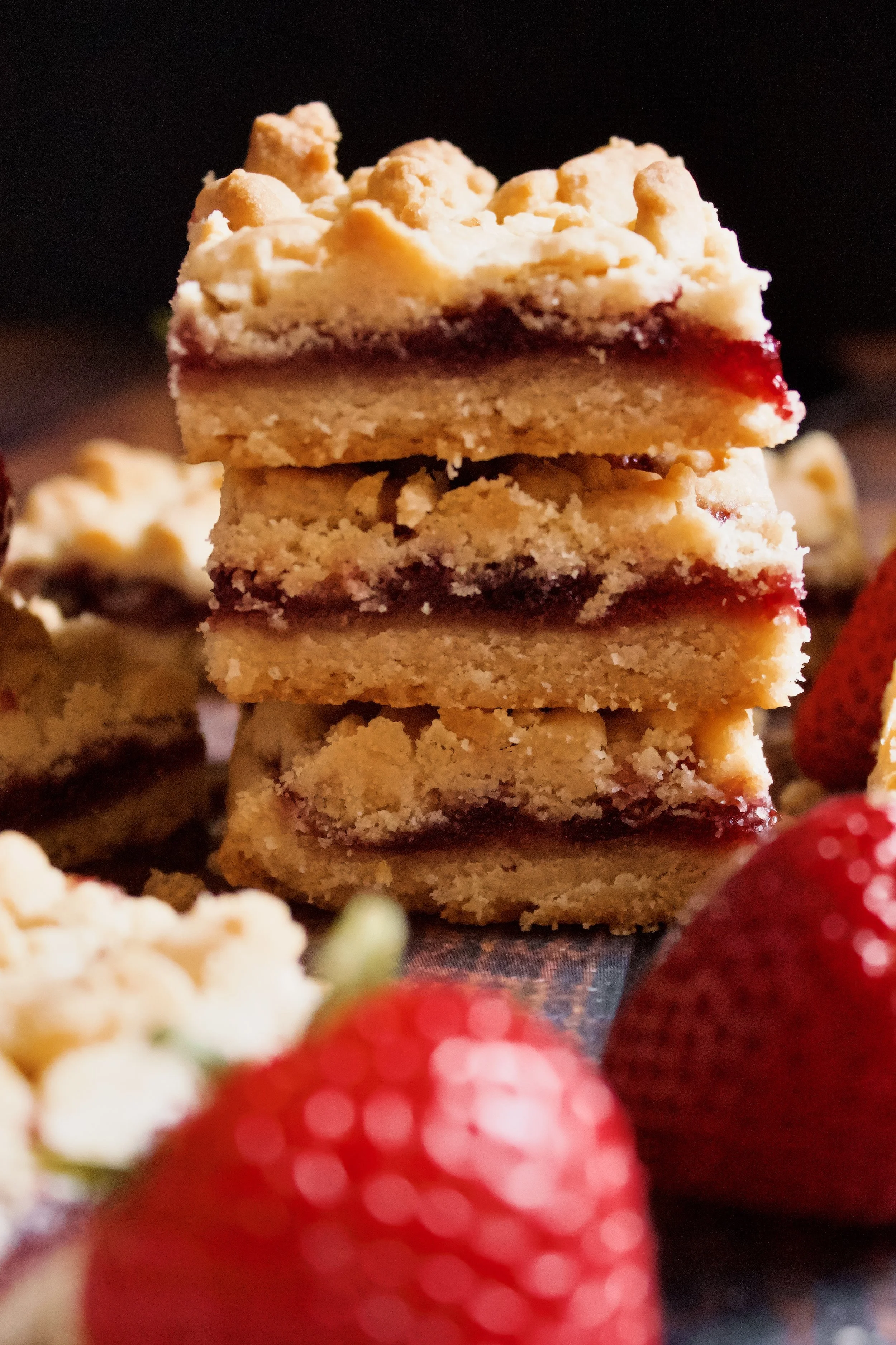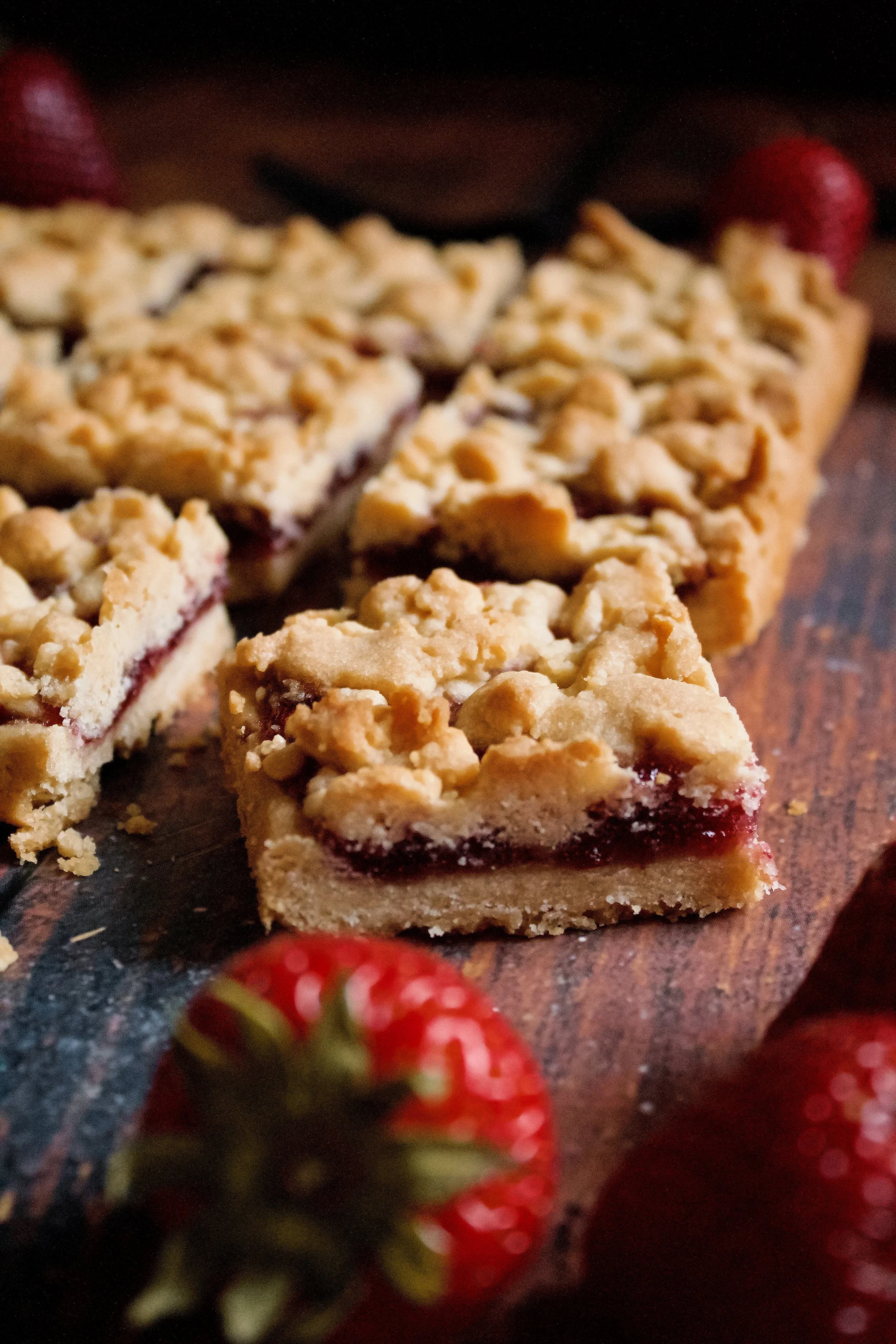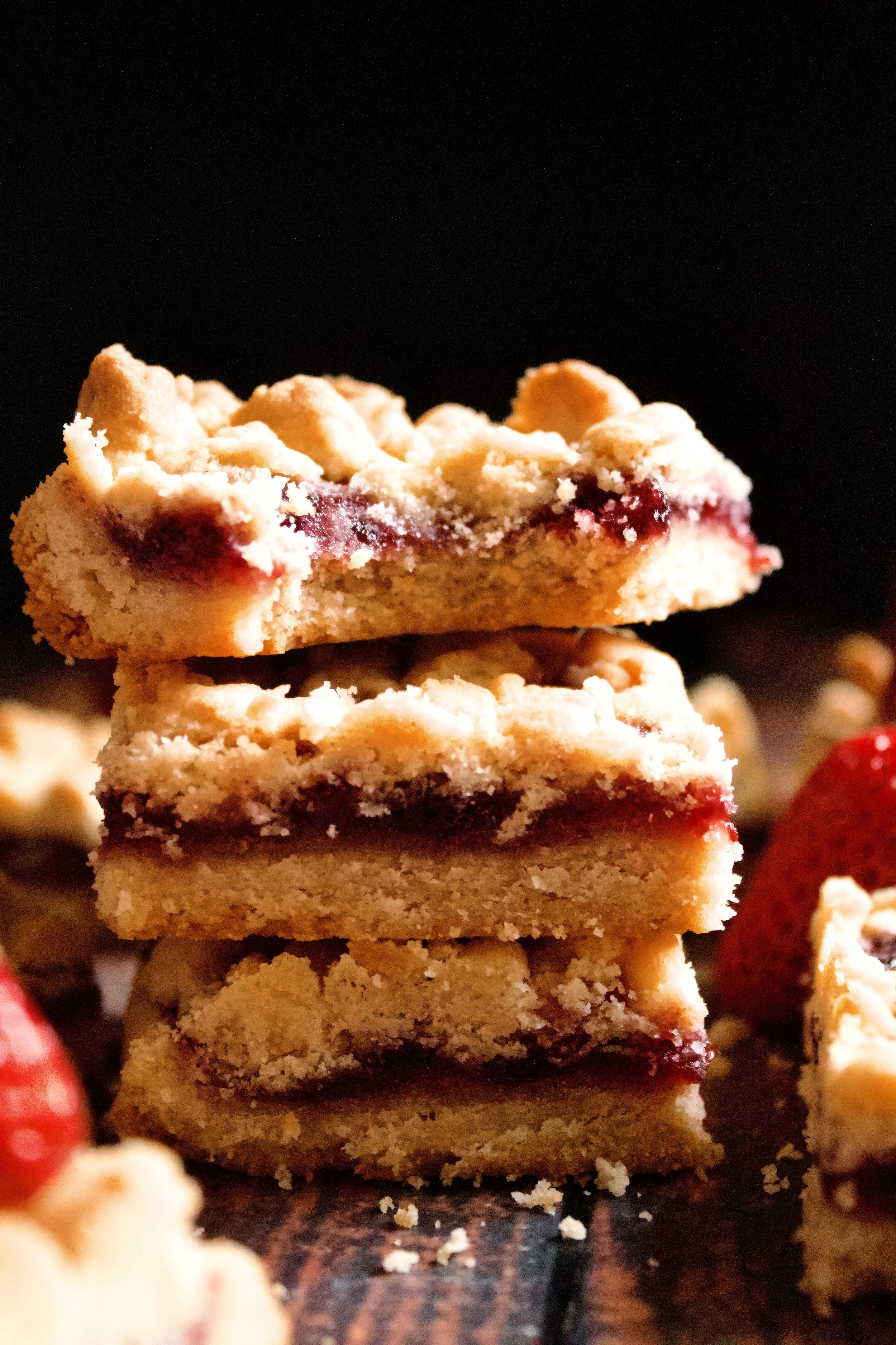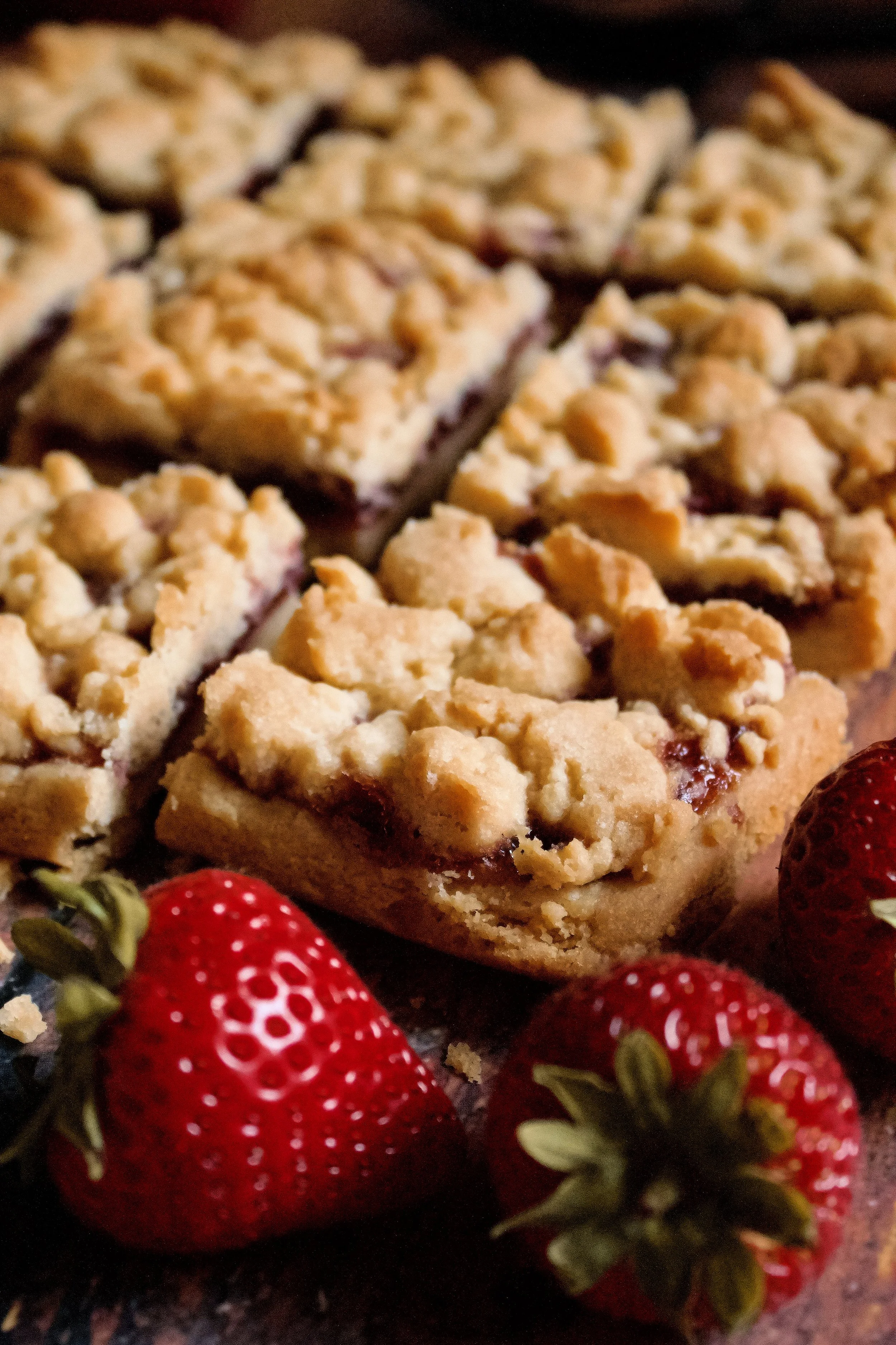 Tender peanut butter shortbread filled with homemade jam. These bars are quick and easy to make and are the perfect back-to-school snack!