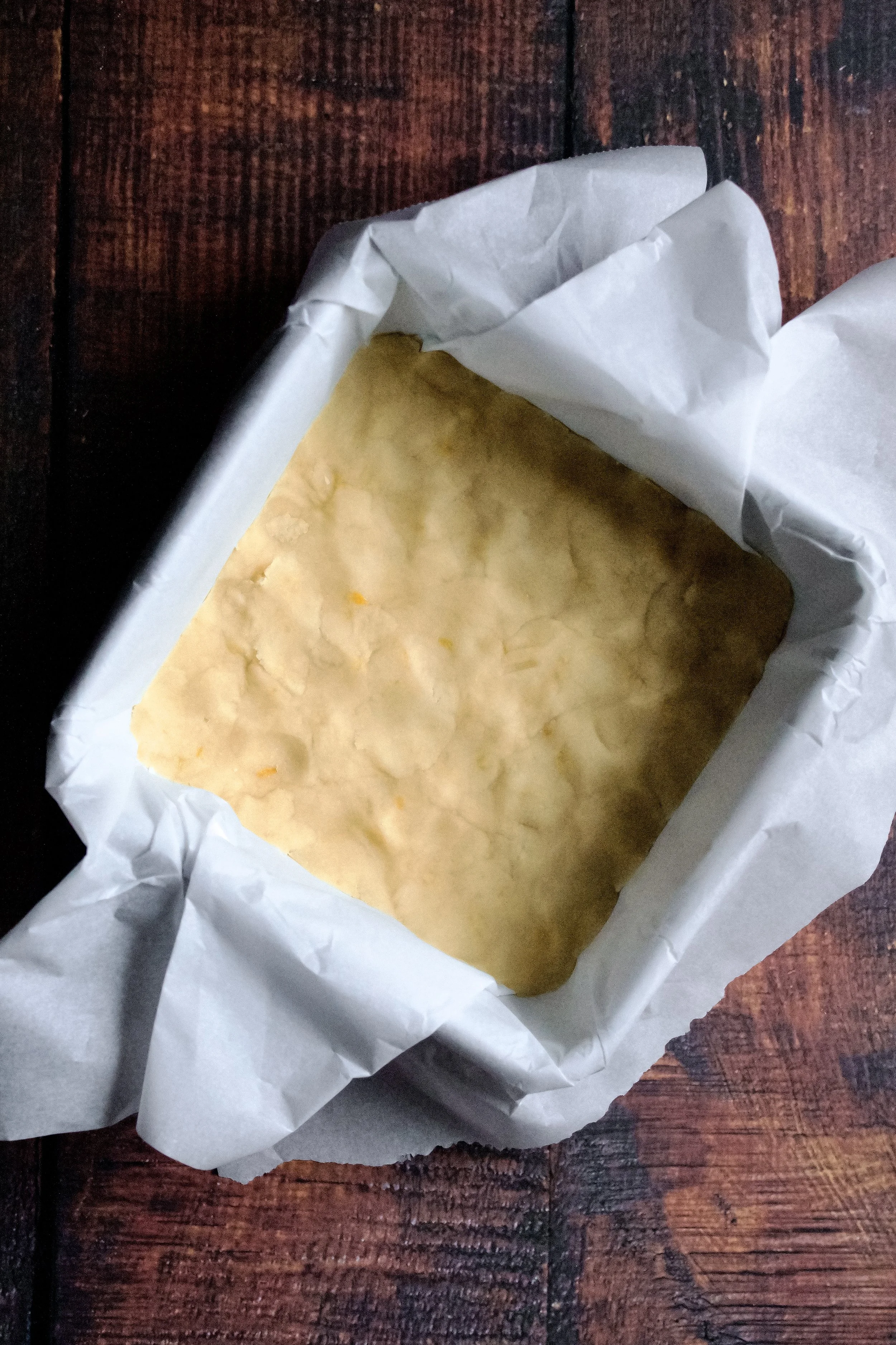 - Press about ⅔ to ¾ of the doug into your prepared pan. Optionally, you can freeze the dough for 10 minutes or refrigerate for 20 minutes. You can chill it longer, but be sure to cover it so it doesn’t absorb any smells from your fridge (which happens in even the cleanest of fridges or freezers!).