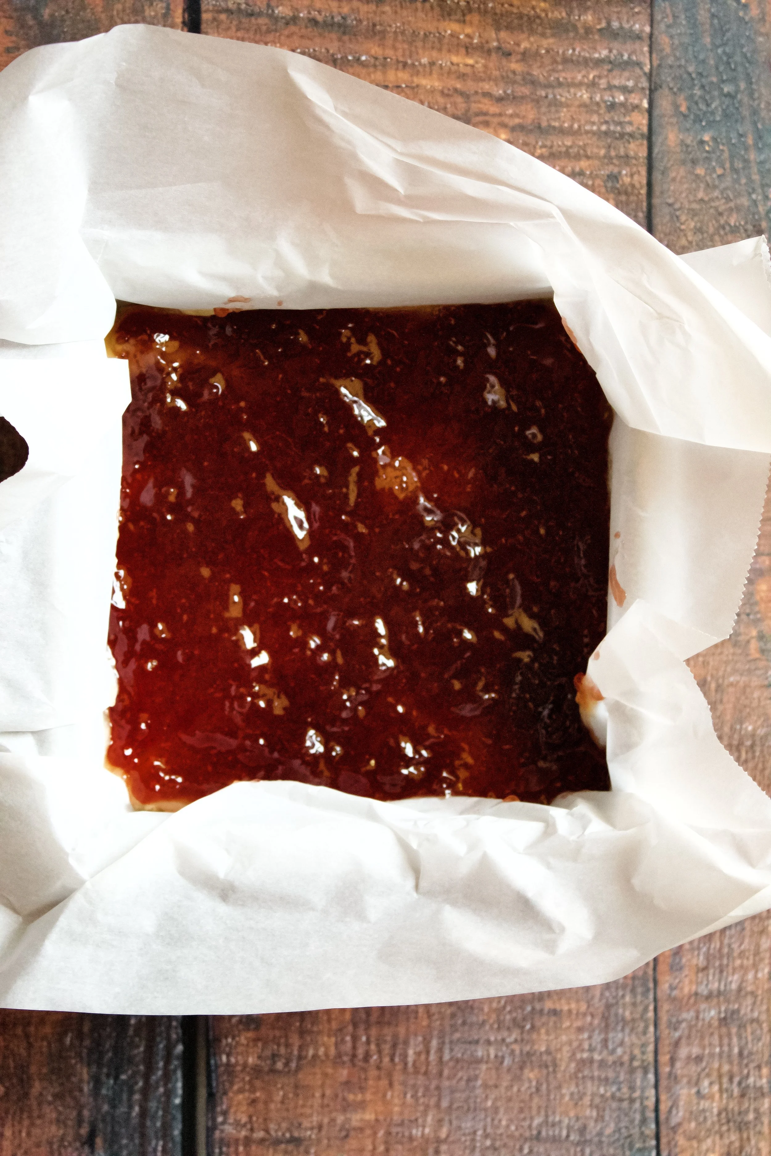 - Let cool for a few minutes, then gently spoon your jam over the baked shortbread, gently spreading it to the very edges. Avoid pressing too firmly to keep the bottom layer intact.