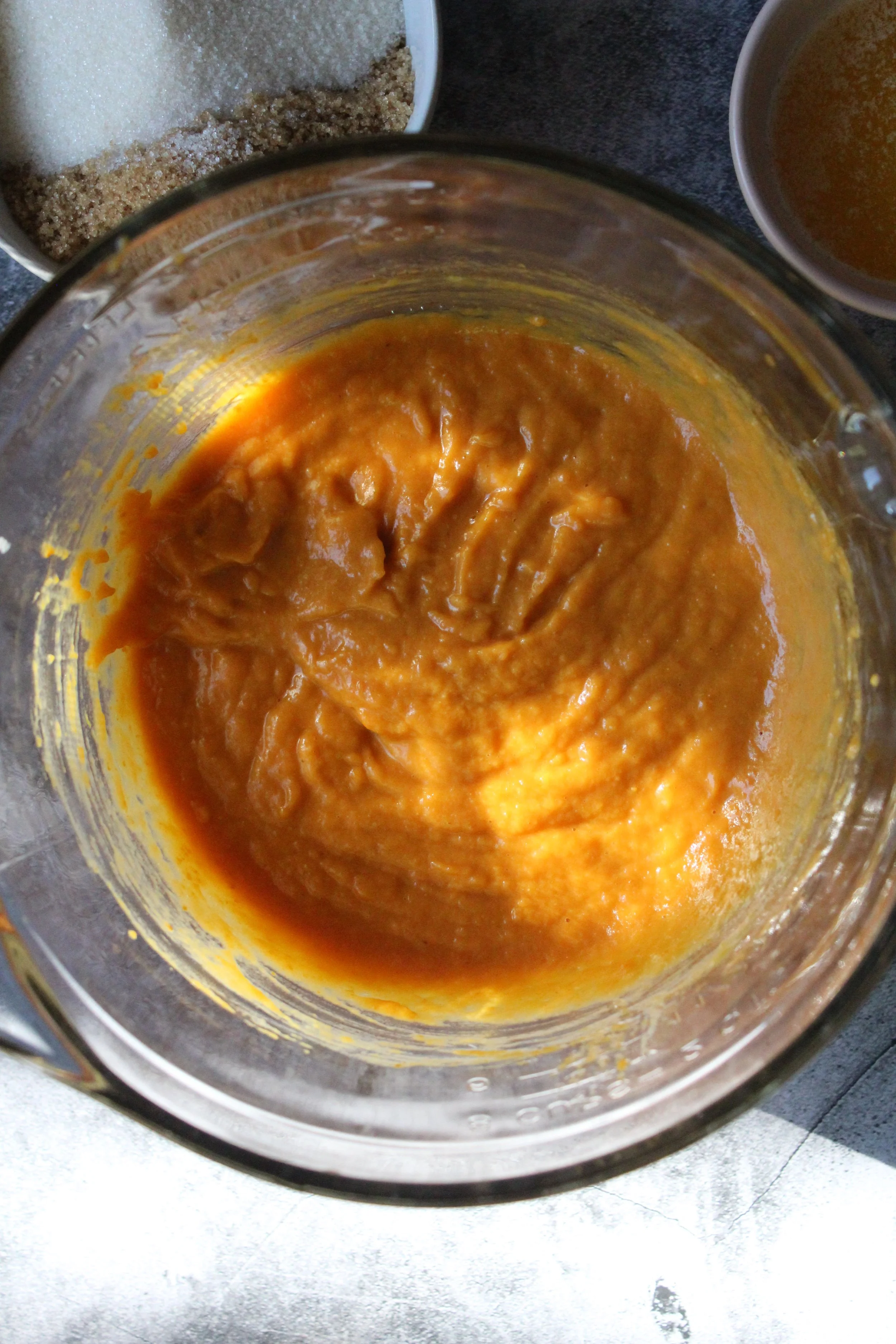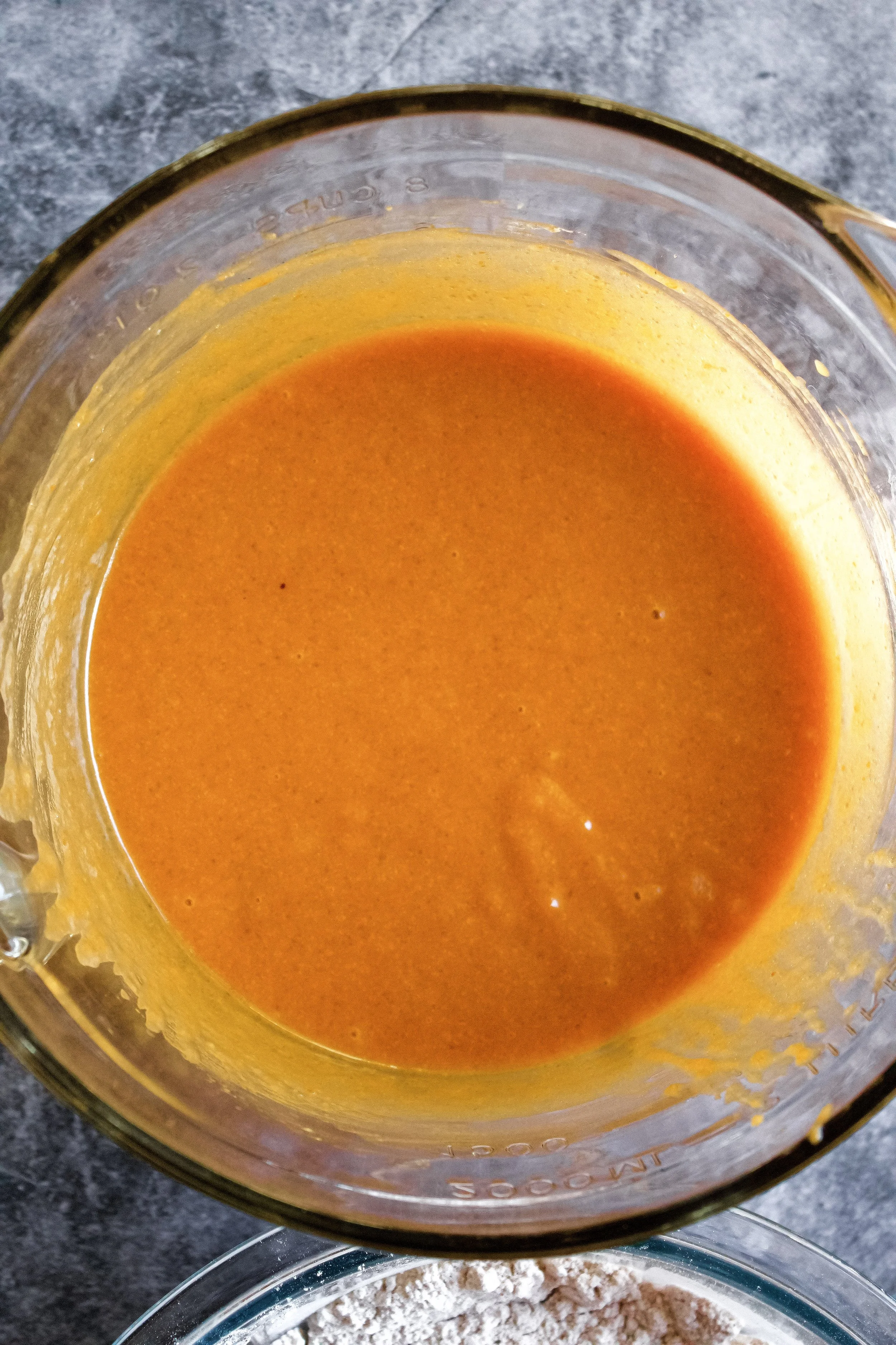 - In a large bowl (or using a stand mixer and paddle attachment), whisk the pumpkin puree together with the vanilla, eggs, and oil until well combined. Slowly stream in the melted butter while whisking quickly (this prevents scrambling the eggs).