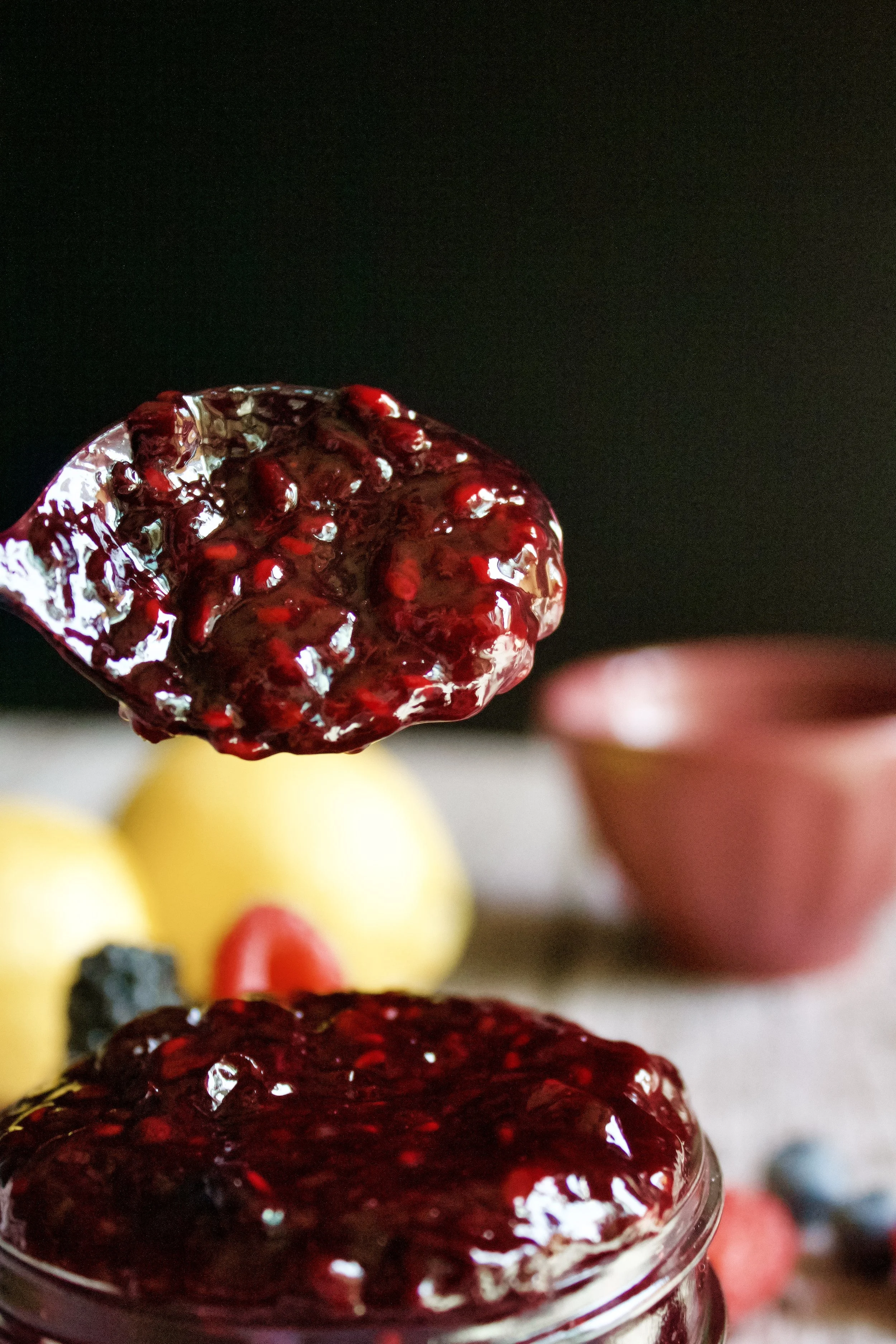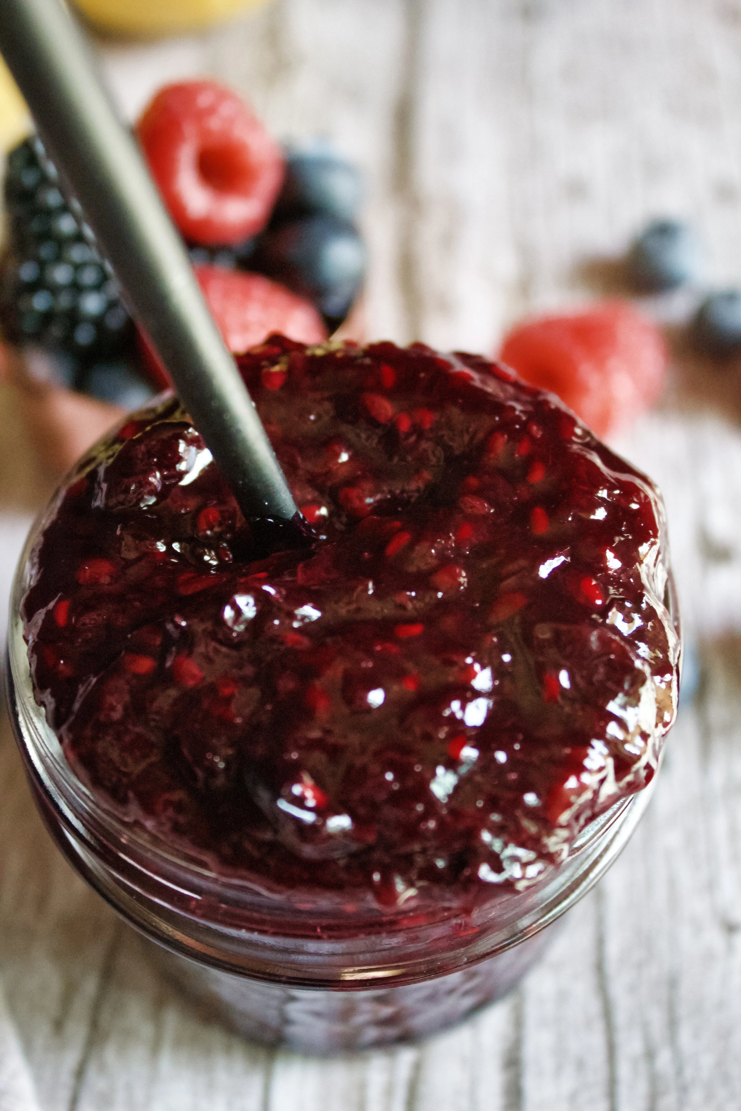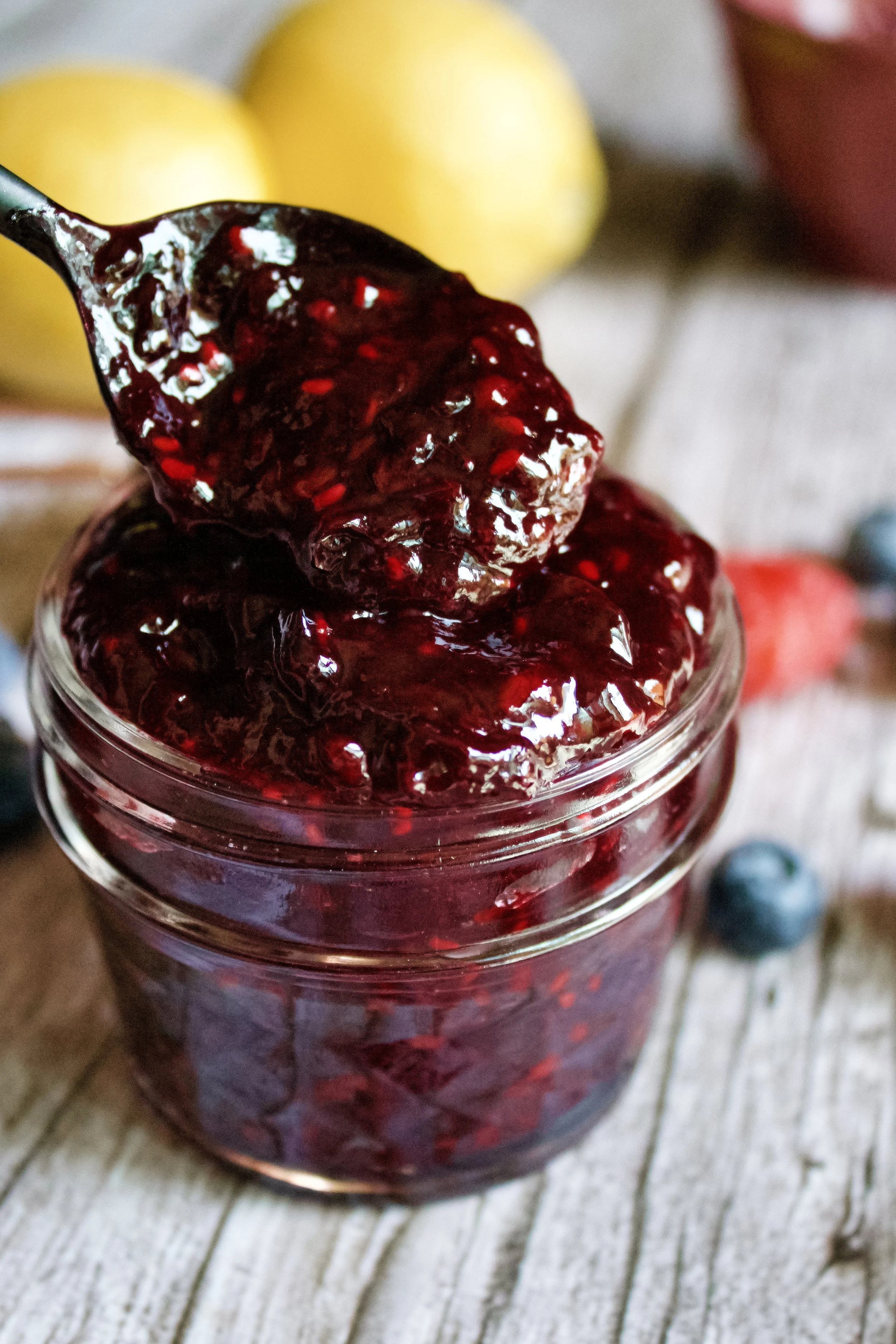 A simple mixture of raspberries, blackberries, and blueberries, cooked into the most delicious compote. Use this on biscuits or scones, to fill cakes, or swirl into ice cream. The possibilities are endless with this versatile, always yummy spread.