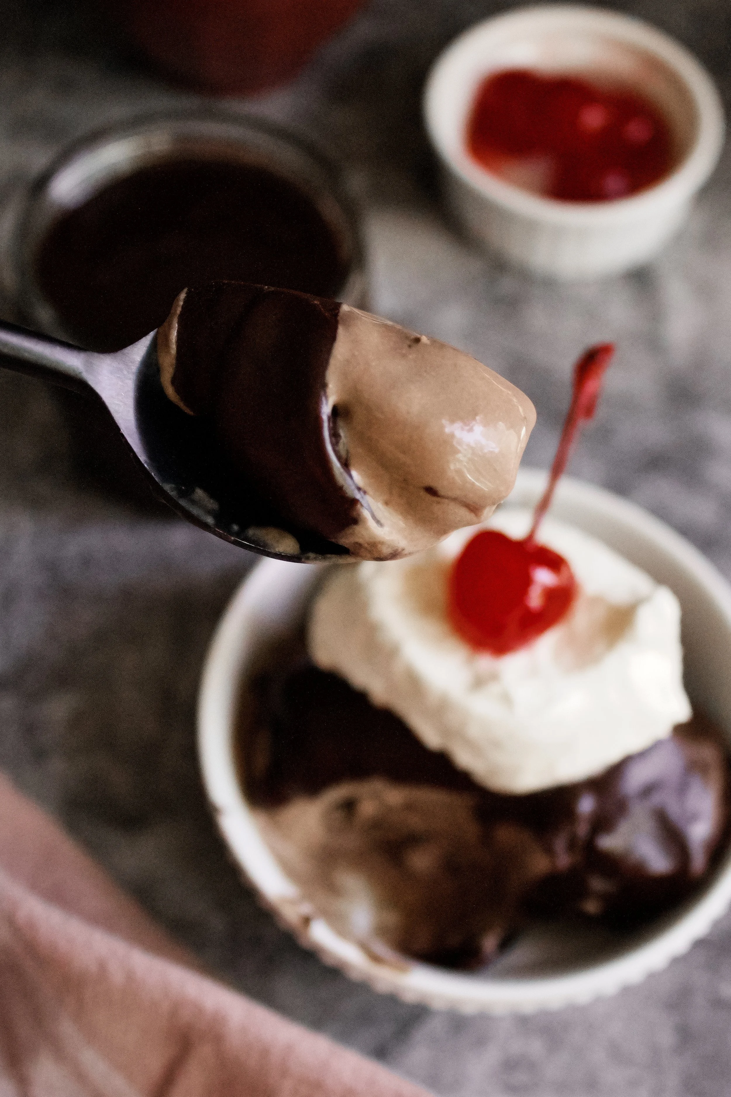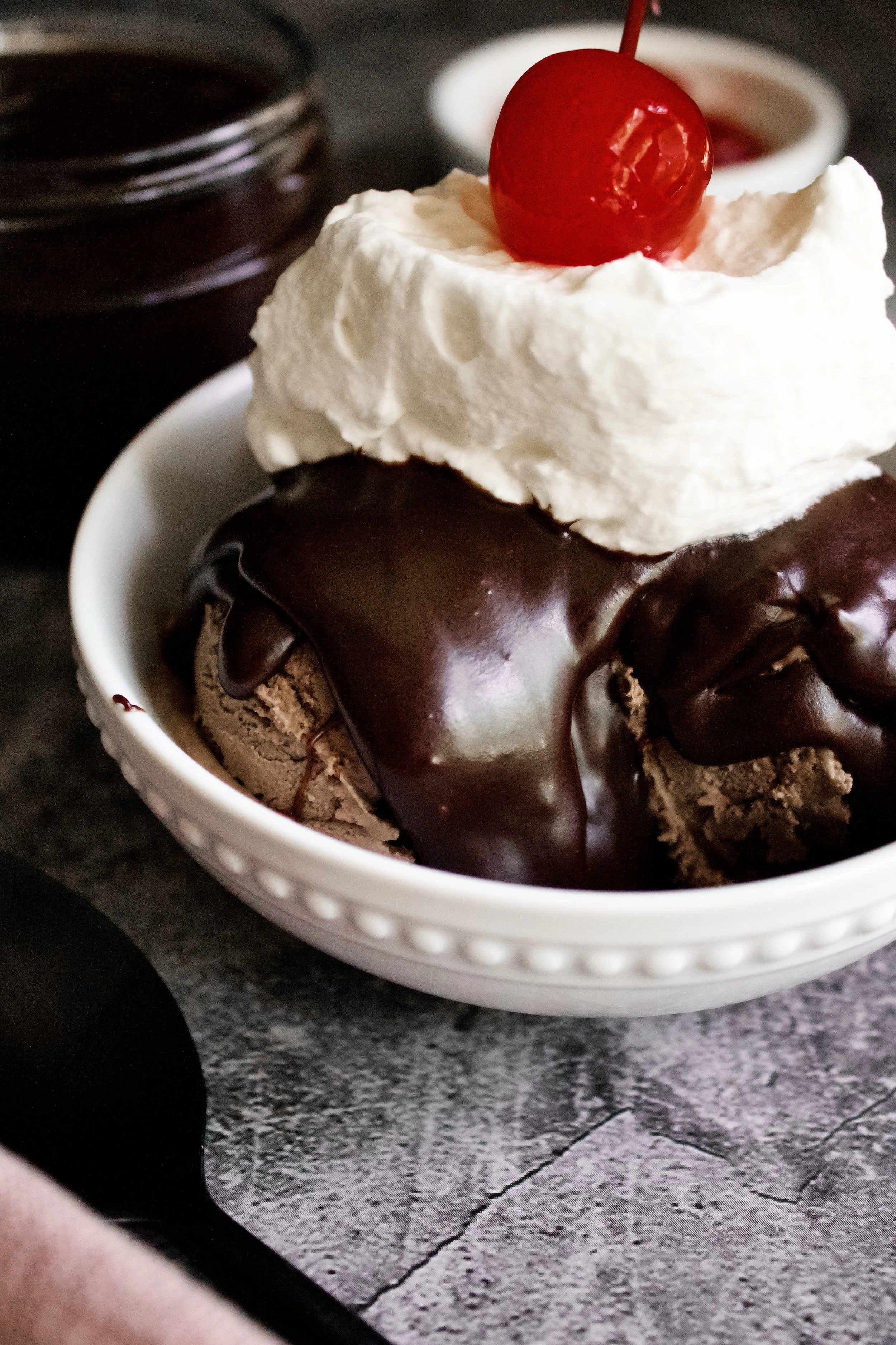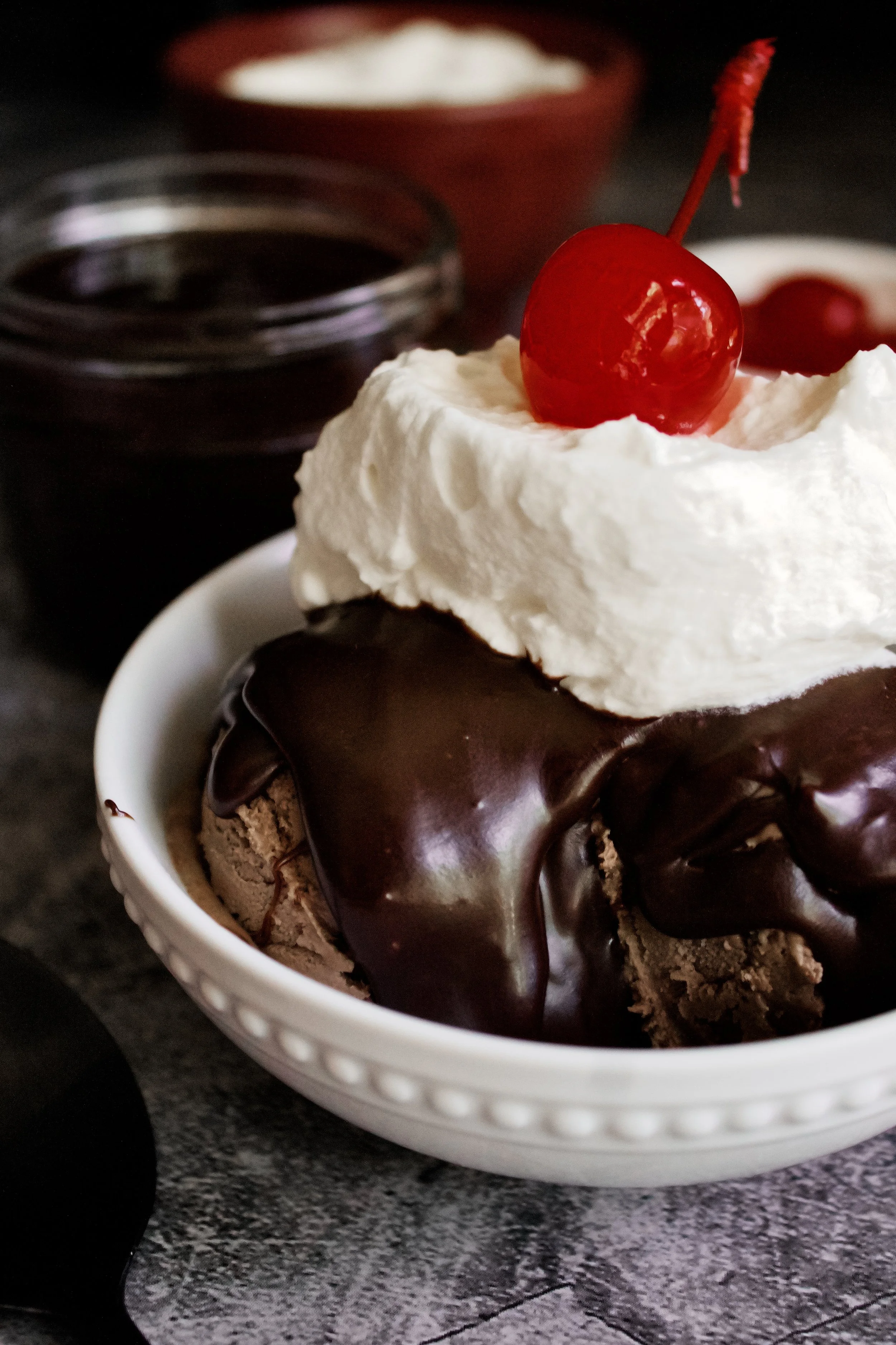 Rich and creamy old-fashioned chocolate ice cream topped with a simple red wine chocolate ganache and finished off with whipped cream and a cherry. This easy dessert is perfect for your Valentine’s or Galentine’s celebration!
