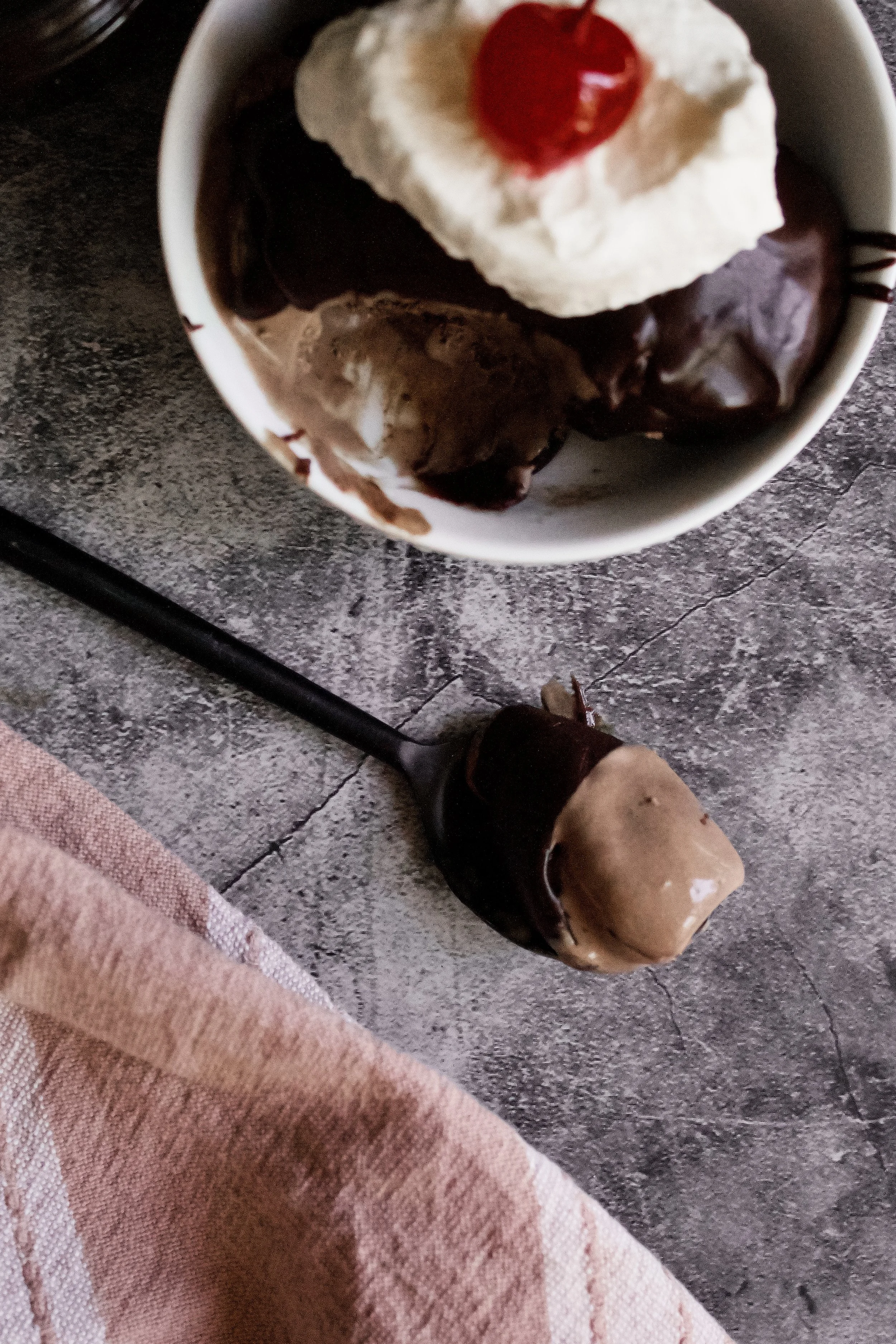 Third, the ease. Both the ice cream and ganache can be made 1-2 weeks in advance (the ice cream lasts for a couple months, but there’s always a high probability it’ll be eaten before then). That means you just need whipped cream, which is quick to whip up (pun intended). So you can have a lovely date or fun girls outing then end your day by throwing together this amazing sundae.