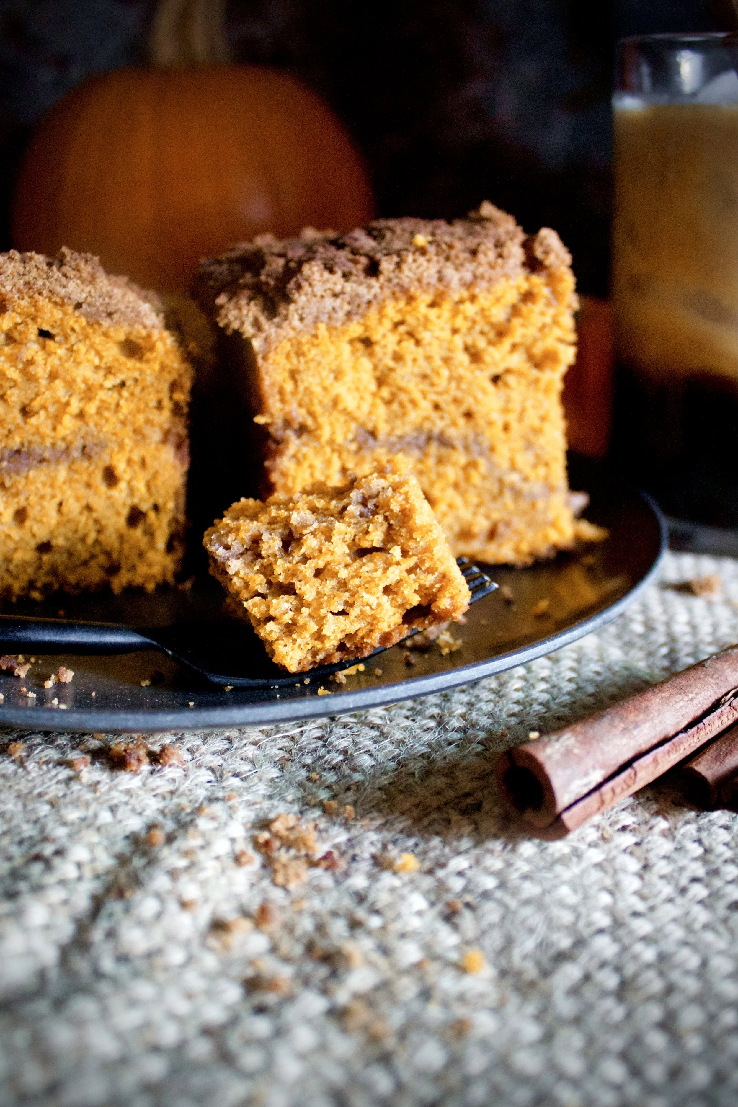 Tender, moist coffee cake with pumpkin spice and real pumpkin, swirled and topped with pumpkin spice streusel. This coffee cake is simple to make and makes plenty to share. Bursting with warm fall flavors, his is the ultimate breakfast or brunch treat!