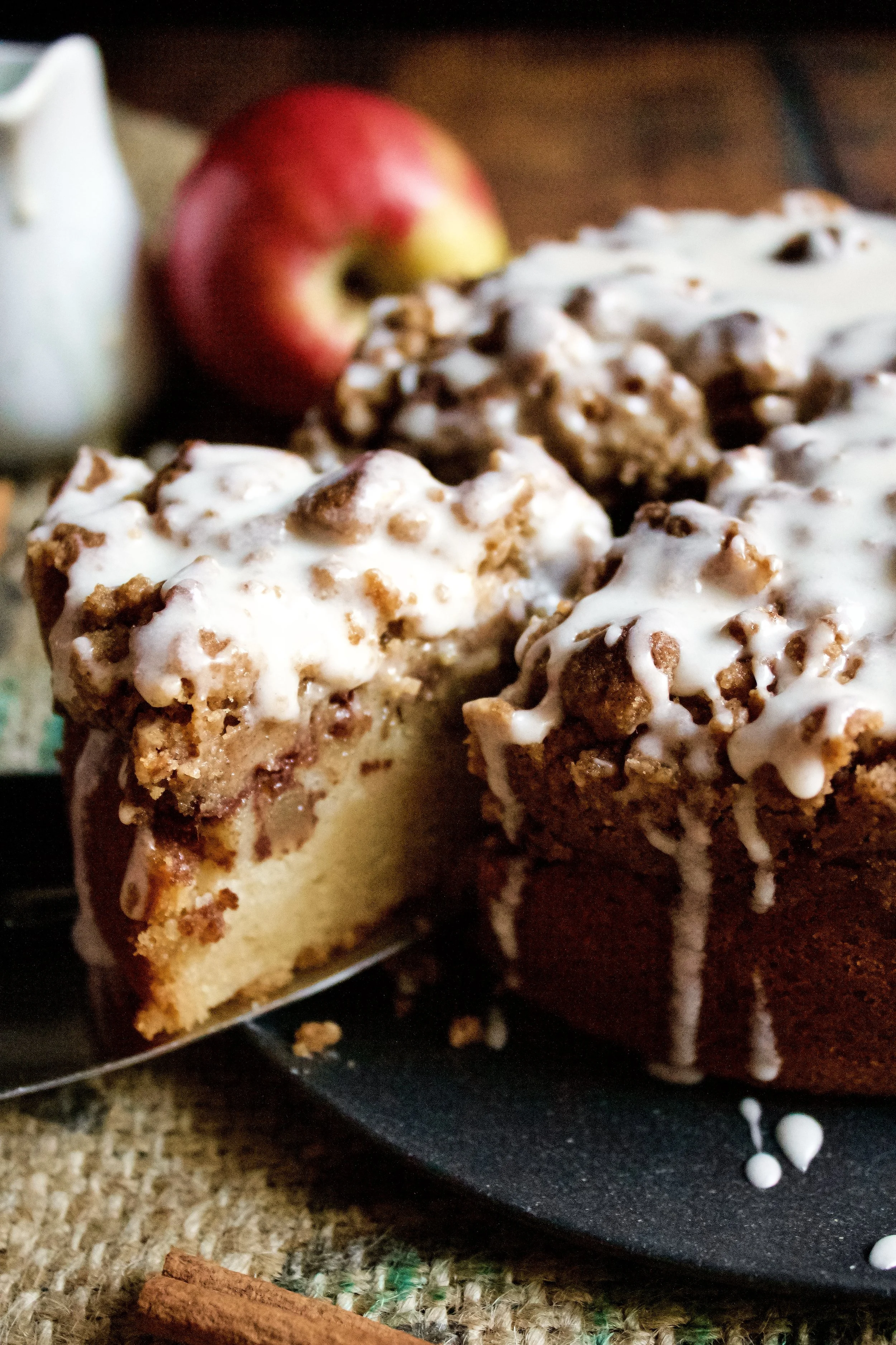Tender Greek yogurt coffee cake layered with crispy cinnamon apples, topped with double cinnamon crumble, and drizzled with cinnamon maple glaze. This crumb cake is coffee’s new best friend and a must for any fall brunch!