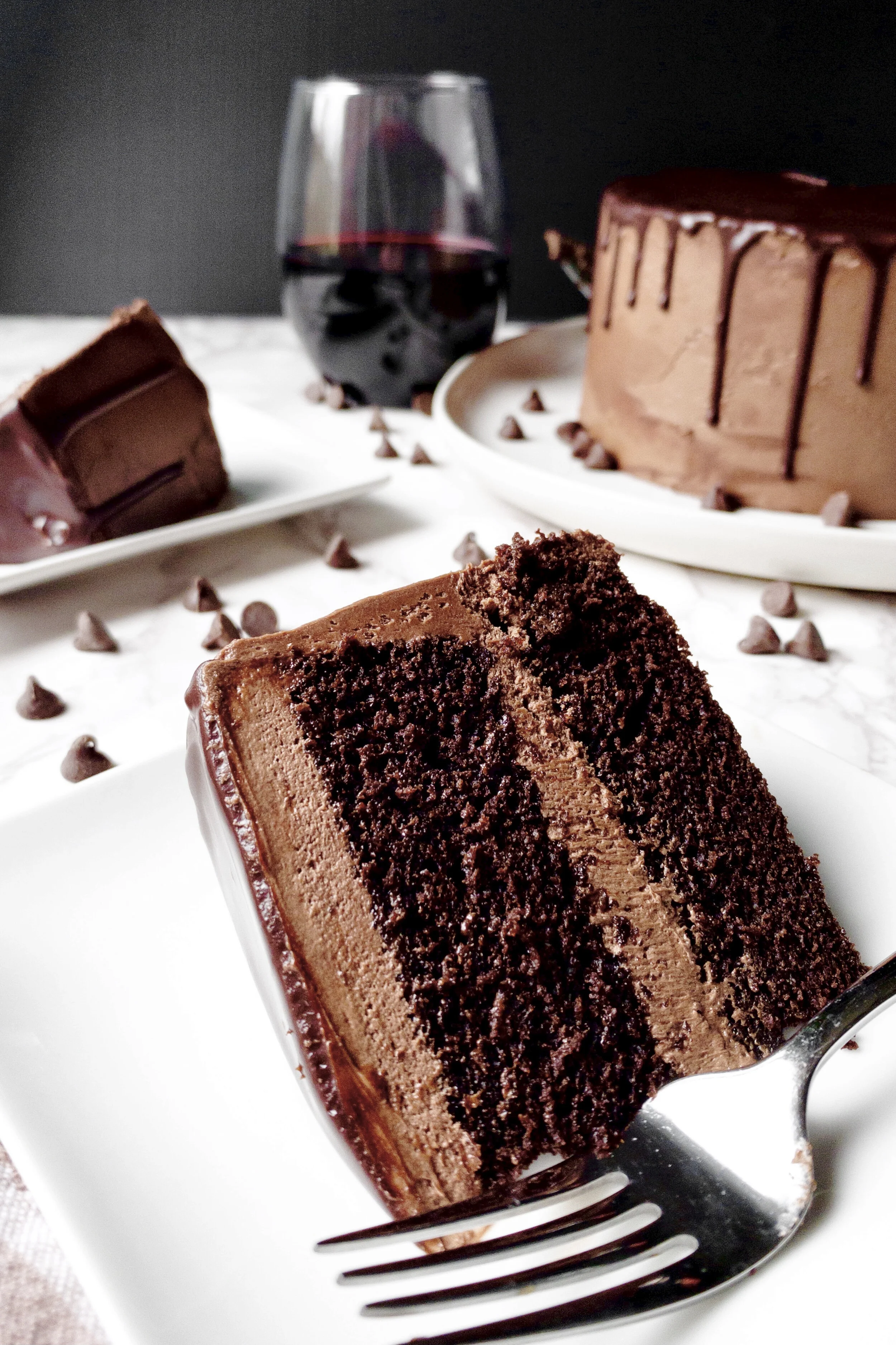 Fluffy, moist chocolate cake filled with chocolate raspberry mousse, fresh raspberries, and mini chocolate chips, and frosted with chocolate ganache buttercream. This cake is at once rich yet light, fully of flavor, and always a crowd pleaser!