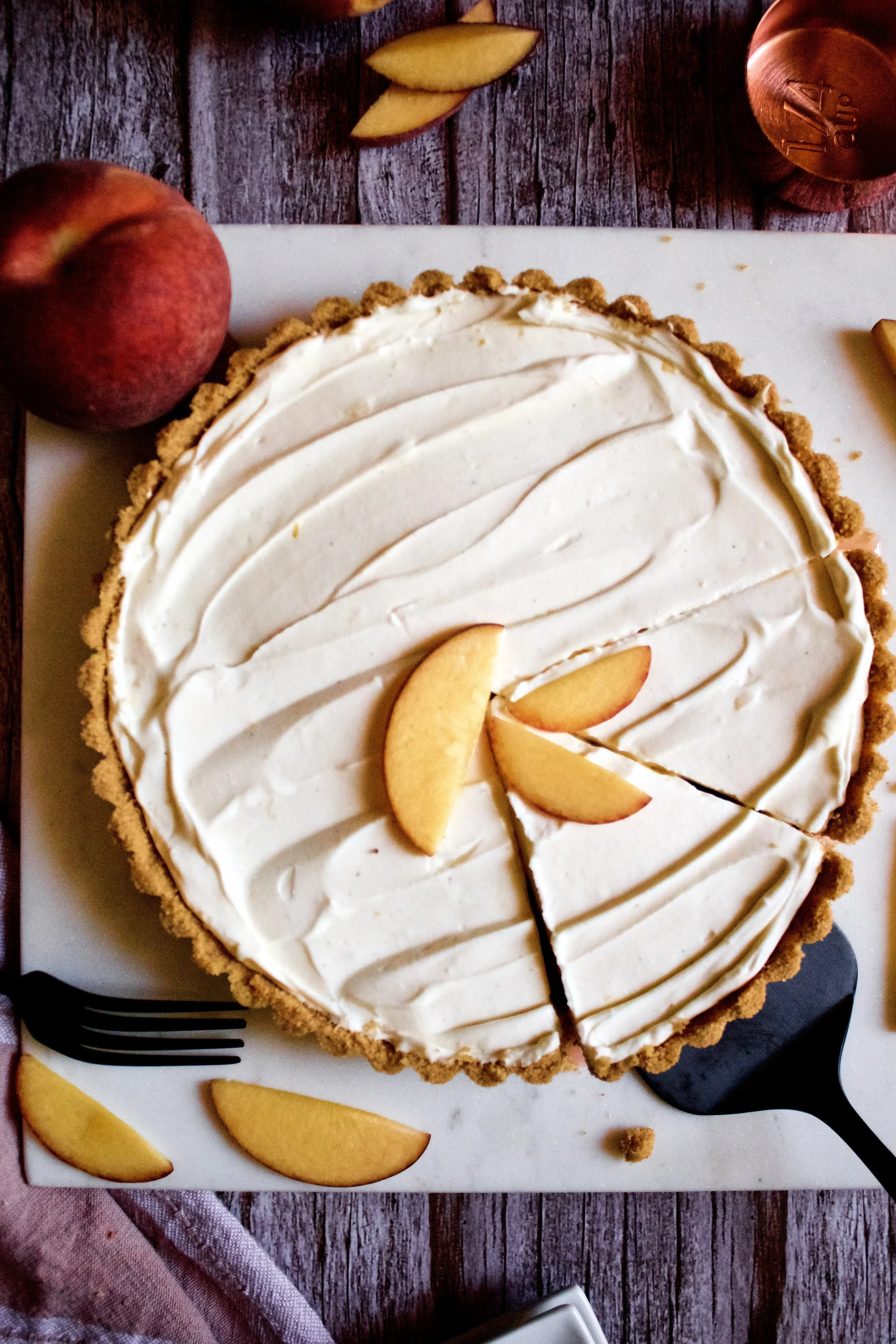Flavorful caramelized peaches topped with a vanilla bean cream, all in a simple graham cracker crust. This simple dessert is a delicious, refreshing way to use up those late summer peaches!
