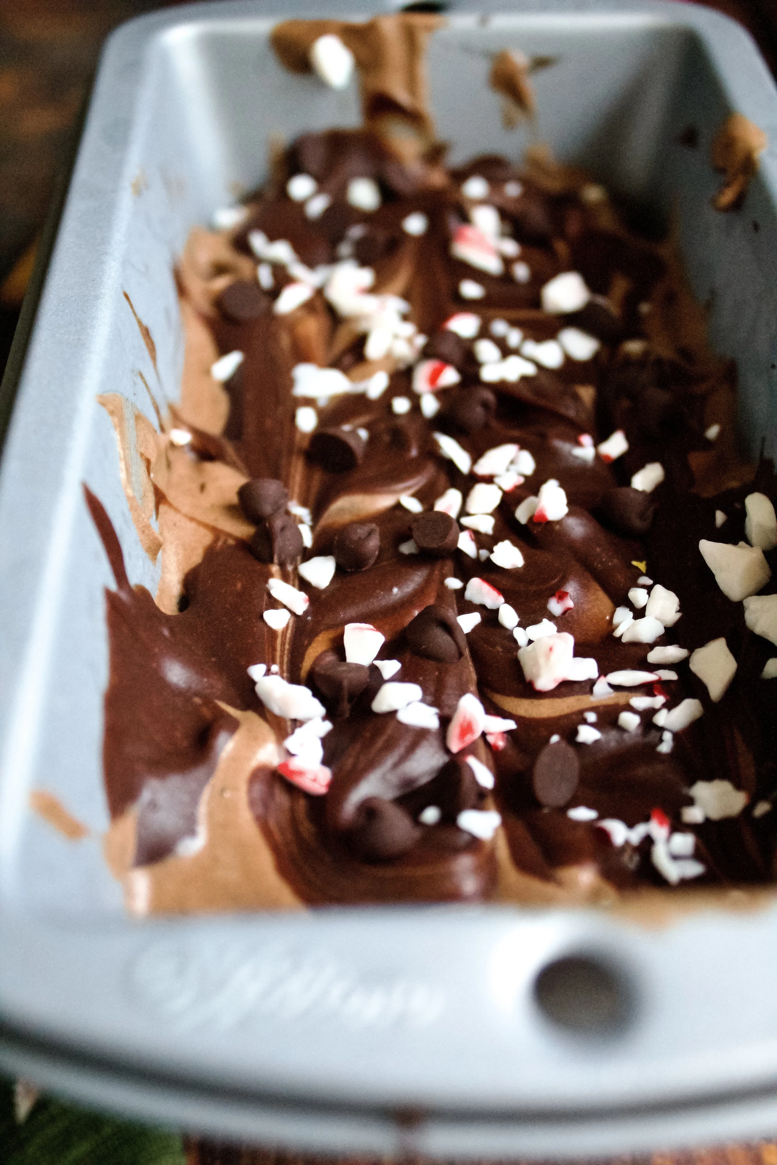 - Once the ice cream is finished, layer ⅓ of it into a 9x5 loaf pan or an ice cream container. Drizzle ⅓ of the ganache onto the ice cream. Sprinkle ⅓ of the candy canes on top. Repeat, layering ice cream and mix-ins two more times, ending with the mix-ins on top.