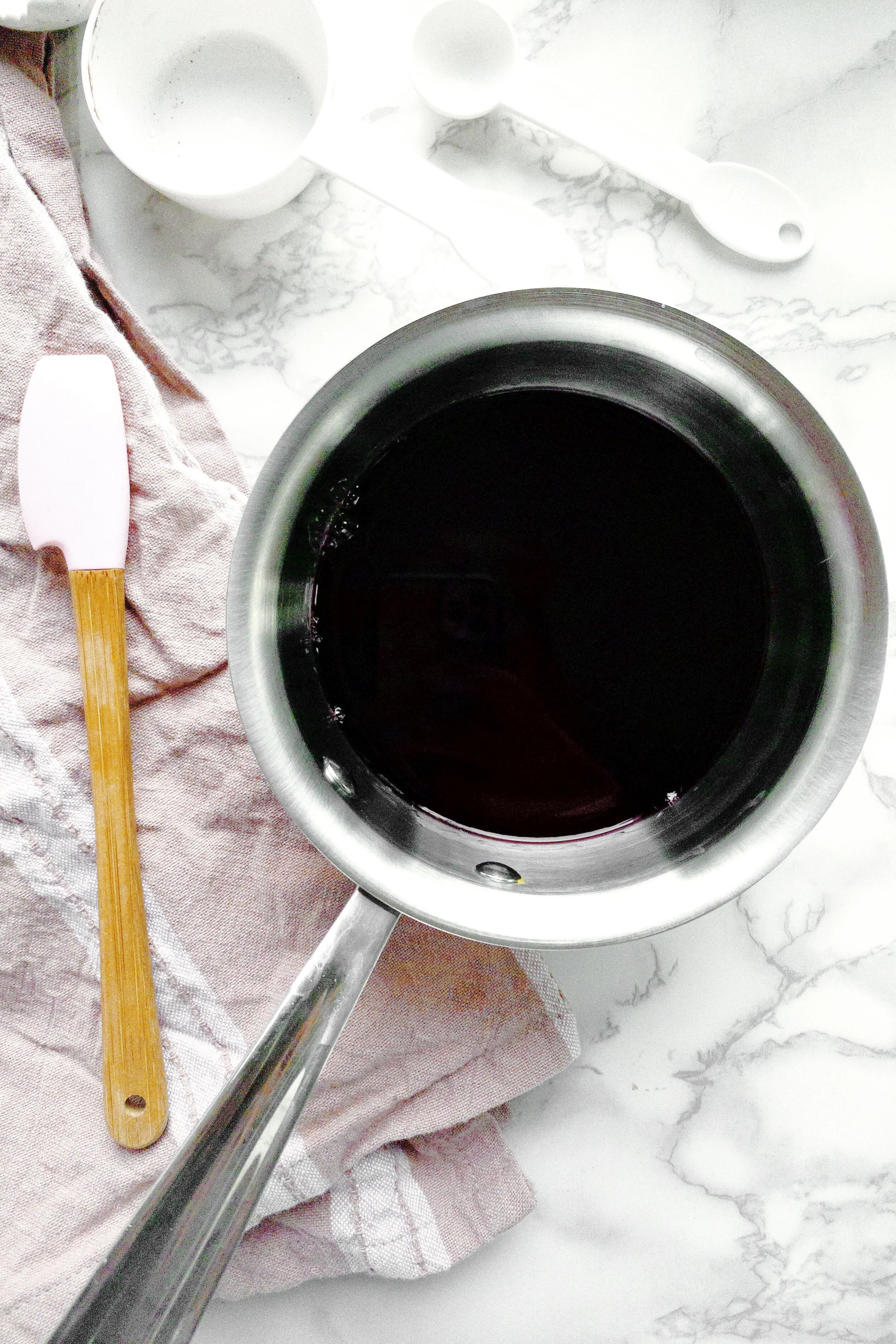 While the cakes cool, make the red wine chocolate buttercream and red wine ganache drip (if you didn’t make them in advance—it only takes about 15 minutes to make both).