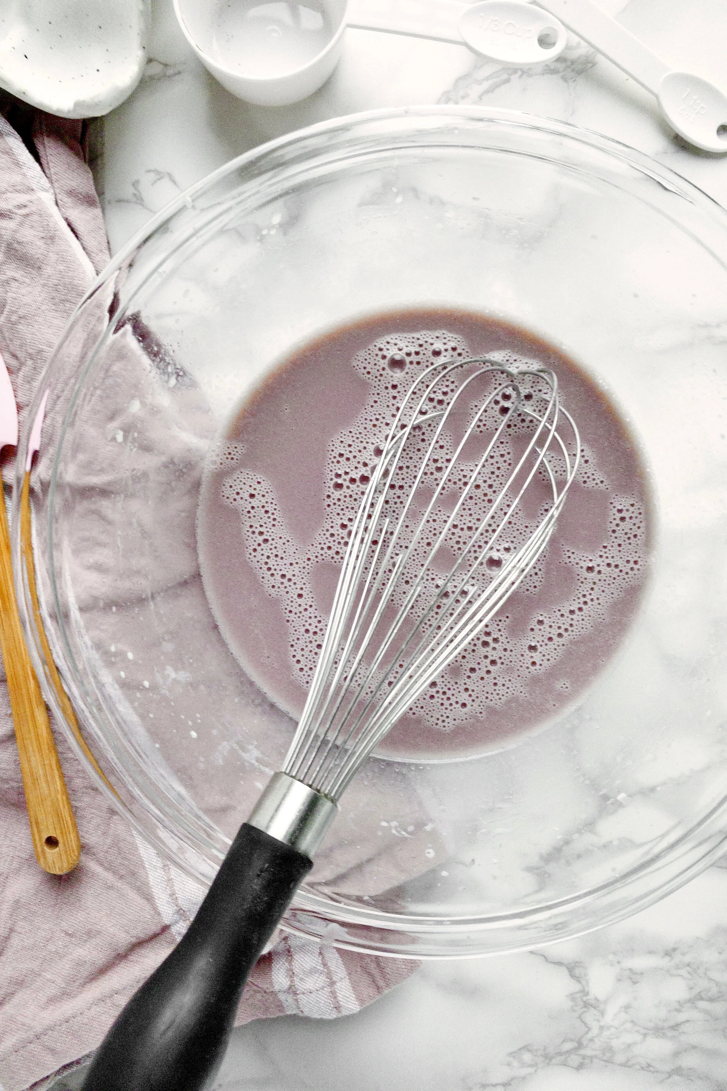 - Using the paddle attachment of your stand mixer (or using a hand mixer), turn mixer to low. Slowly pour wet ingredients into dry. It will clump up then settle into a liquidy consistency. After all ingredients are combined, scrape down sides, making sure to get to the very bottom. Turn mixer up to medium and mix for exactly 2 minutes. Set a timer so you do not overmix!