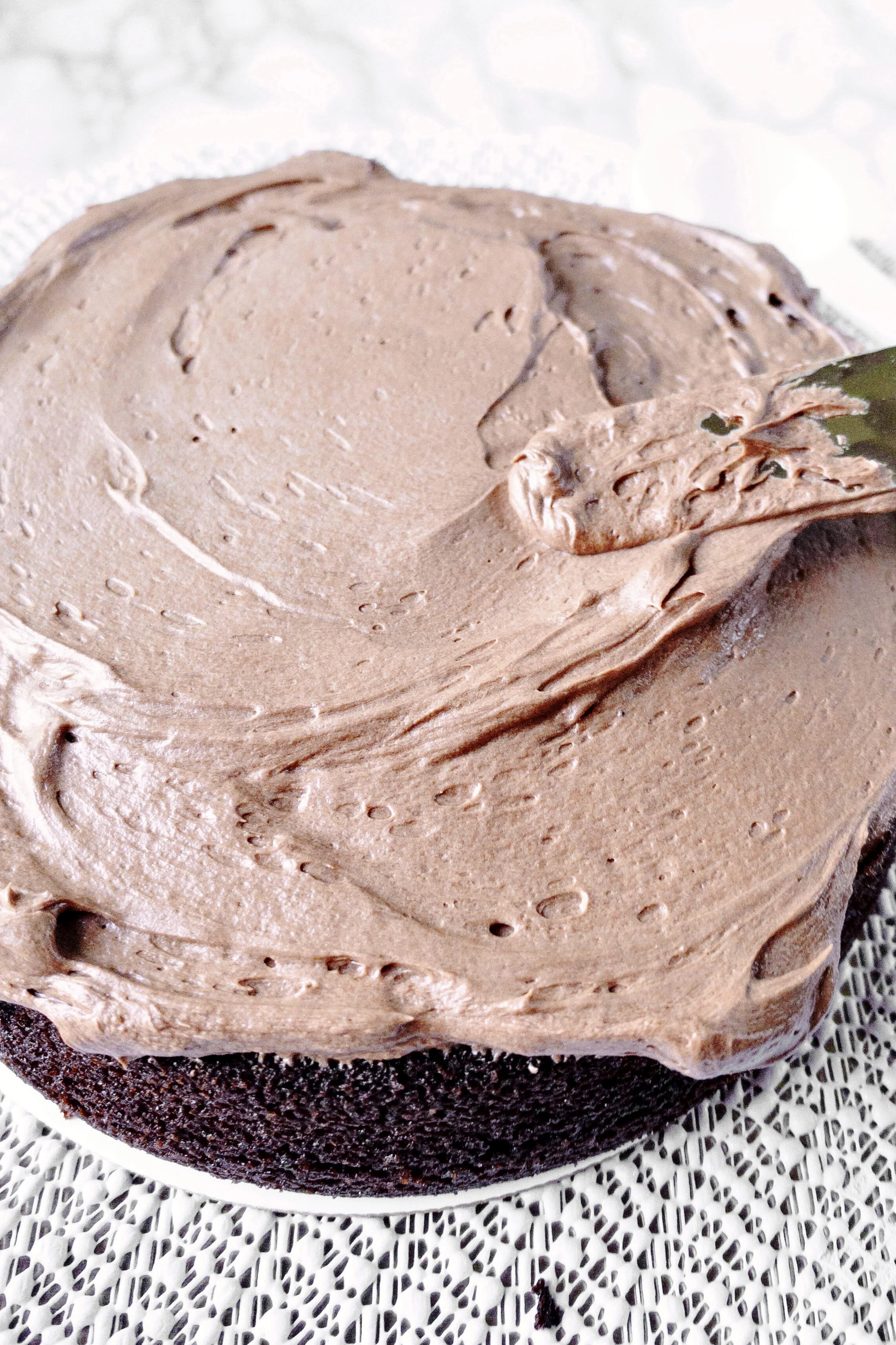 - Fill and frost cake with desired amount of red wine chocolate buttercream. Optionally, you can drizzle some ganache on the filling before adding more cake.