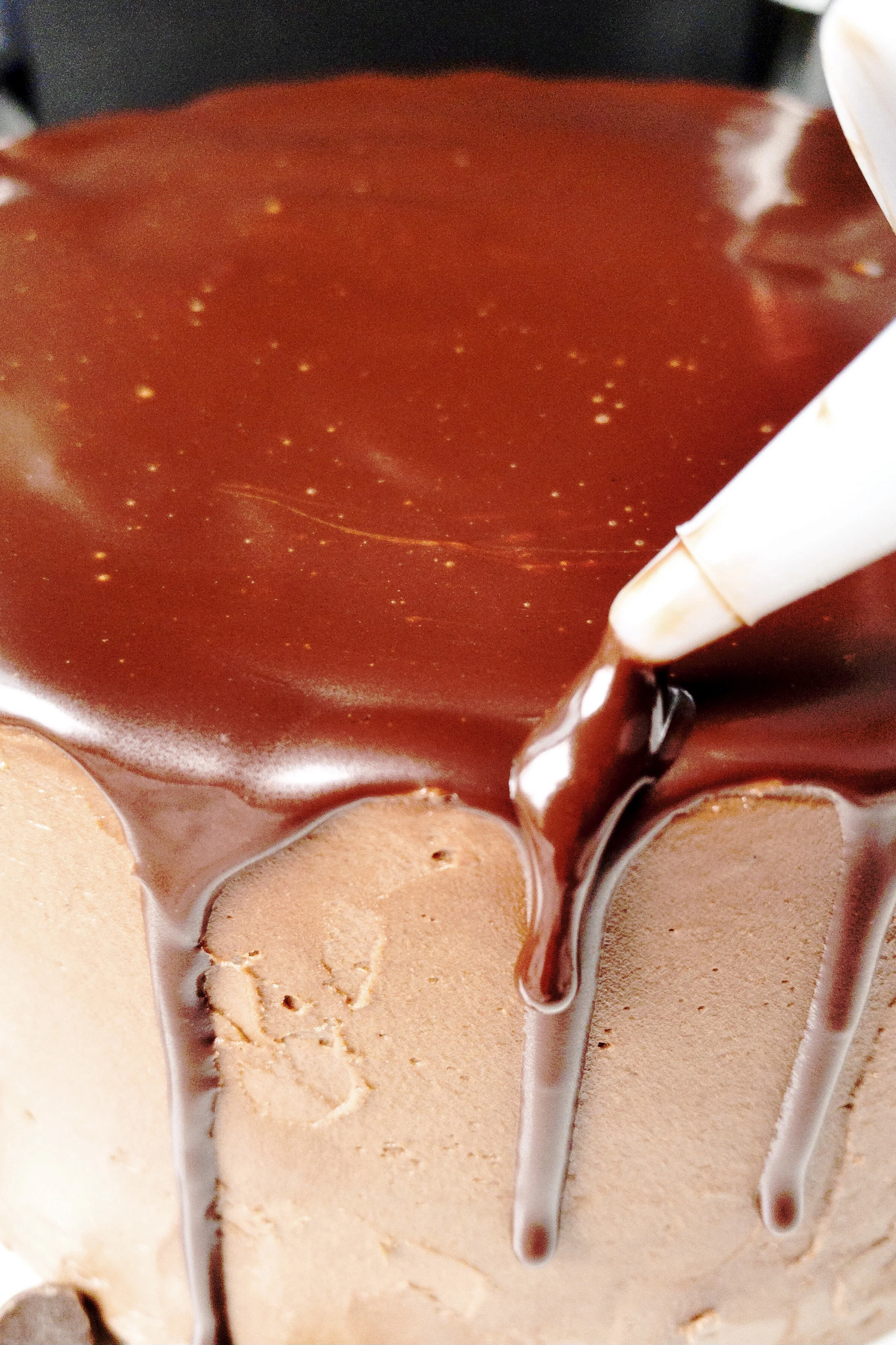 - Chill until frosting is very set (or freeze for 10 minutes). Create drip lines by carefully pouring ganache along the edge of the cake, letting some run off in lines down the side of the cake. I’m no expert, so you don’t want a video of me doing it, but there are many out there! Chelsweets has my favorite drip tutorials.