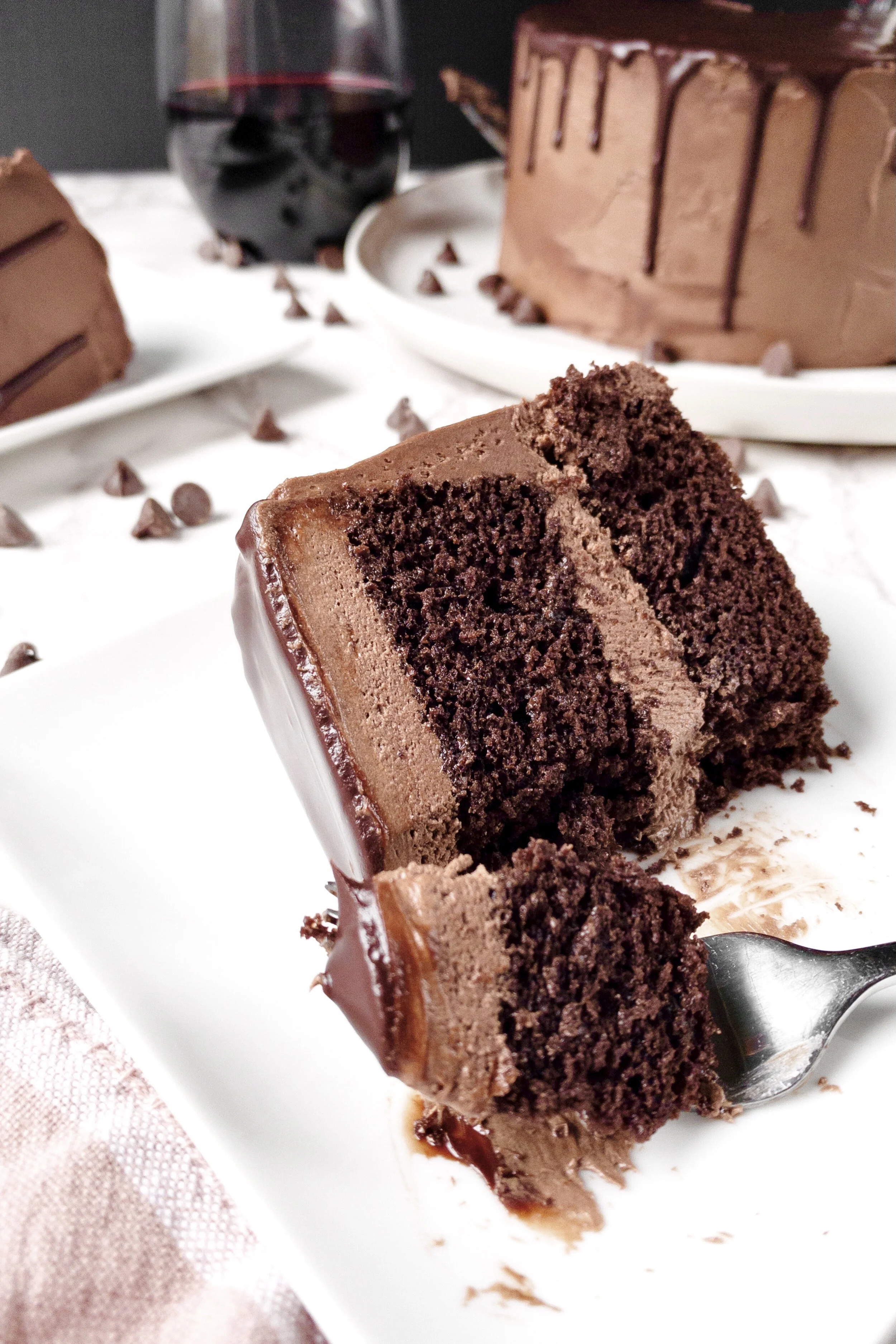 Layers of fluffy, delicious chocolate cake filled with smooth chocolate buttercream and topped with rich dark chocolate ganache drip—all infused with a flavorful burst of sweet red wine. This is a MUST for date night.