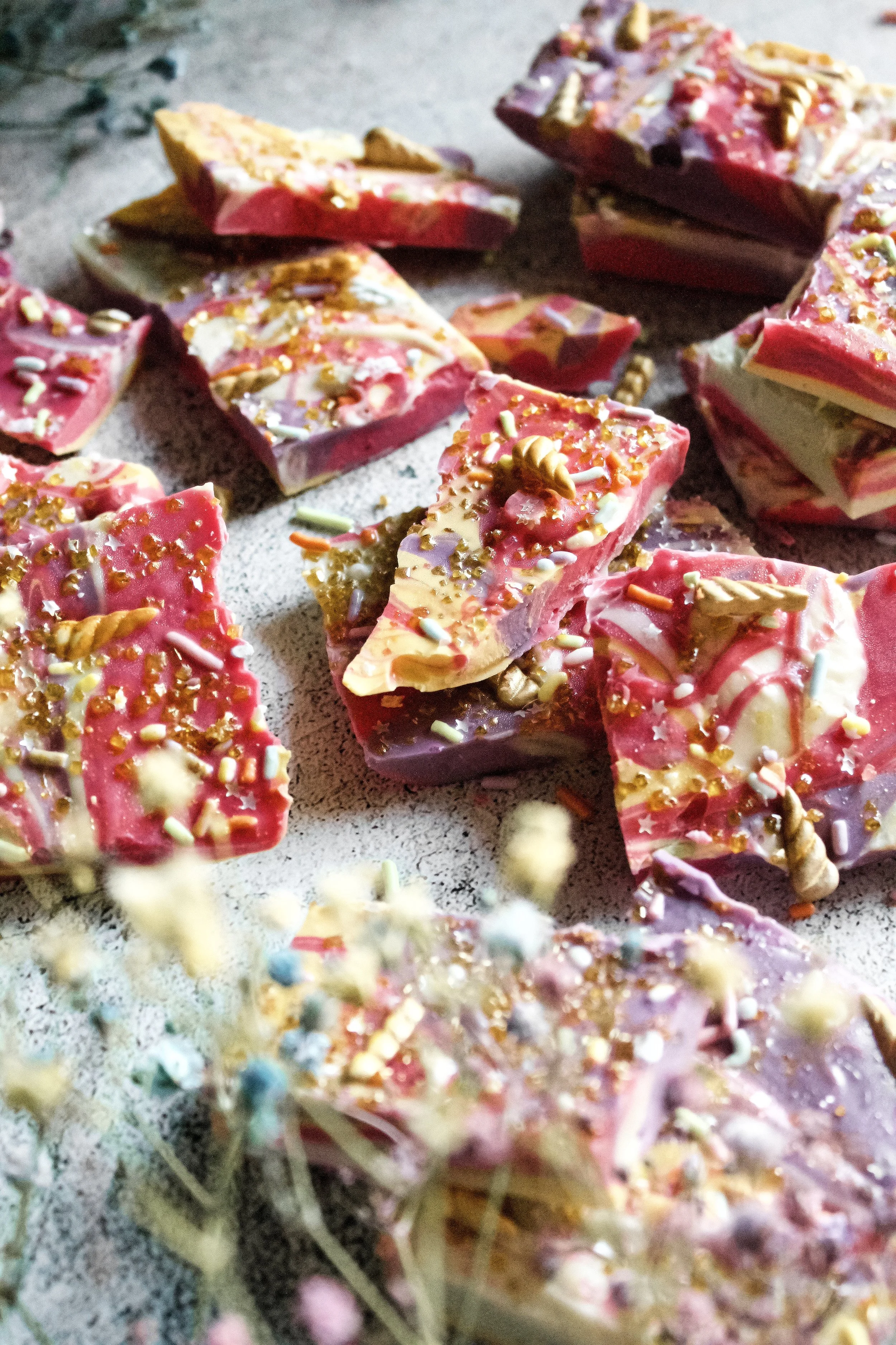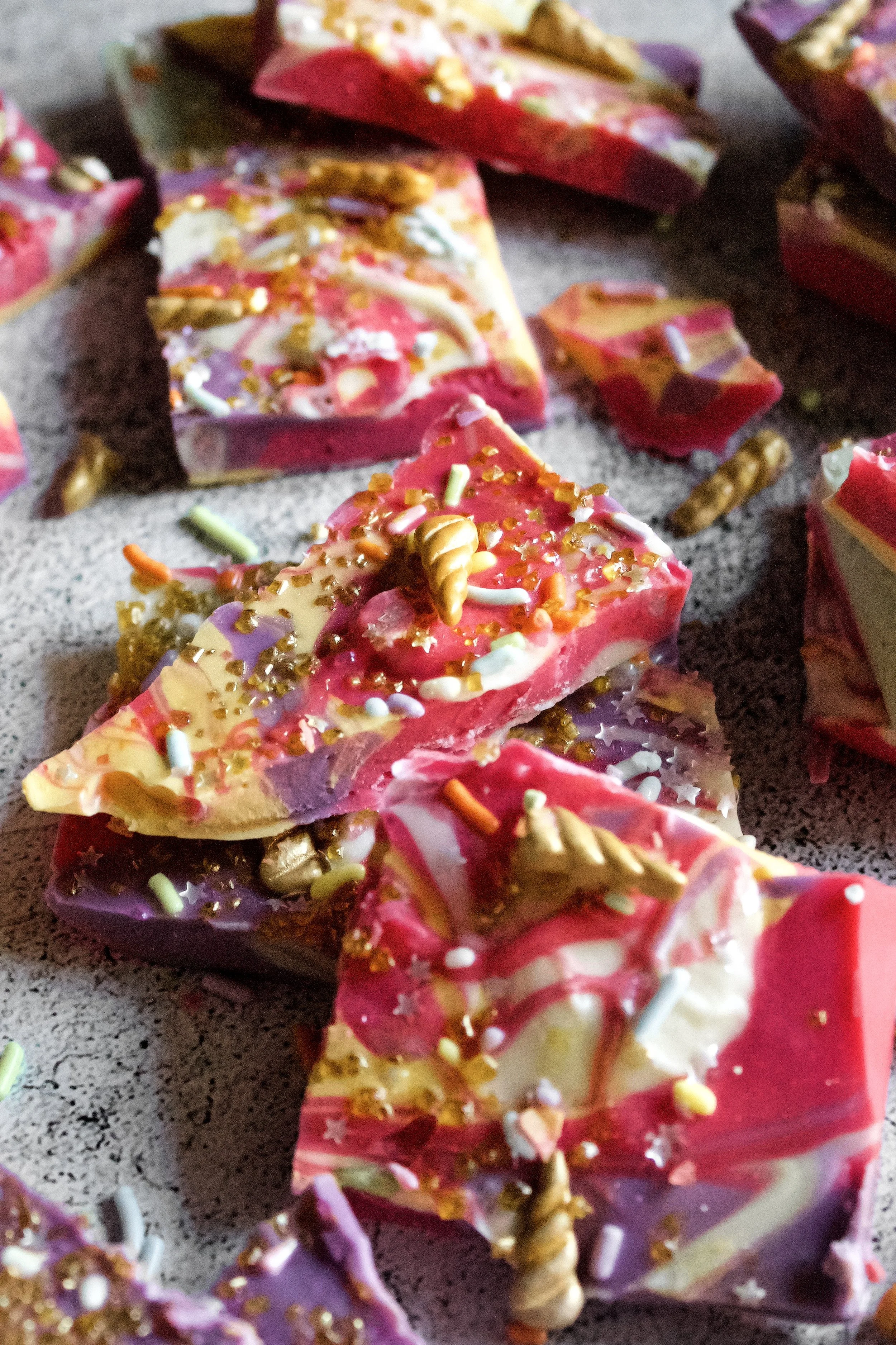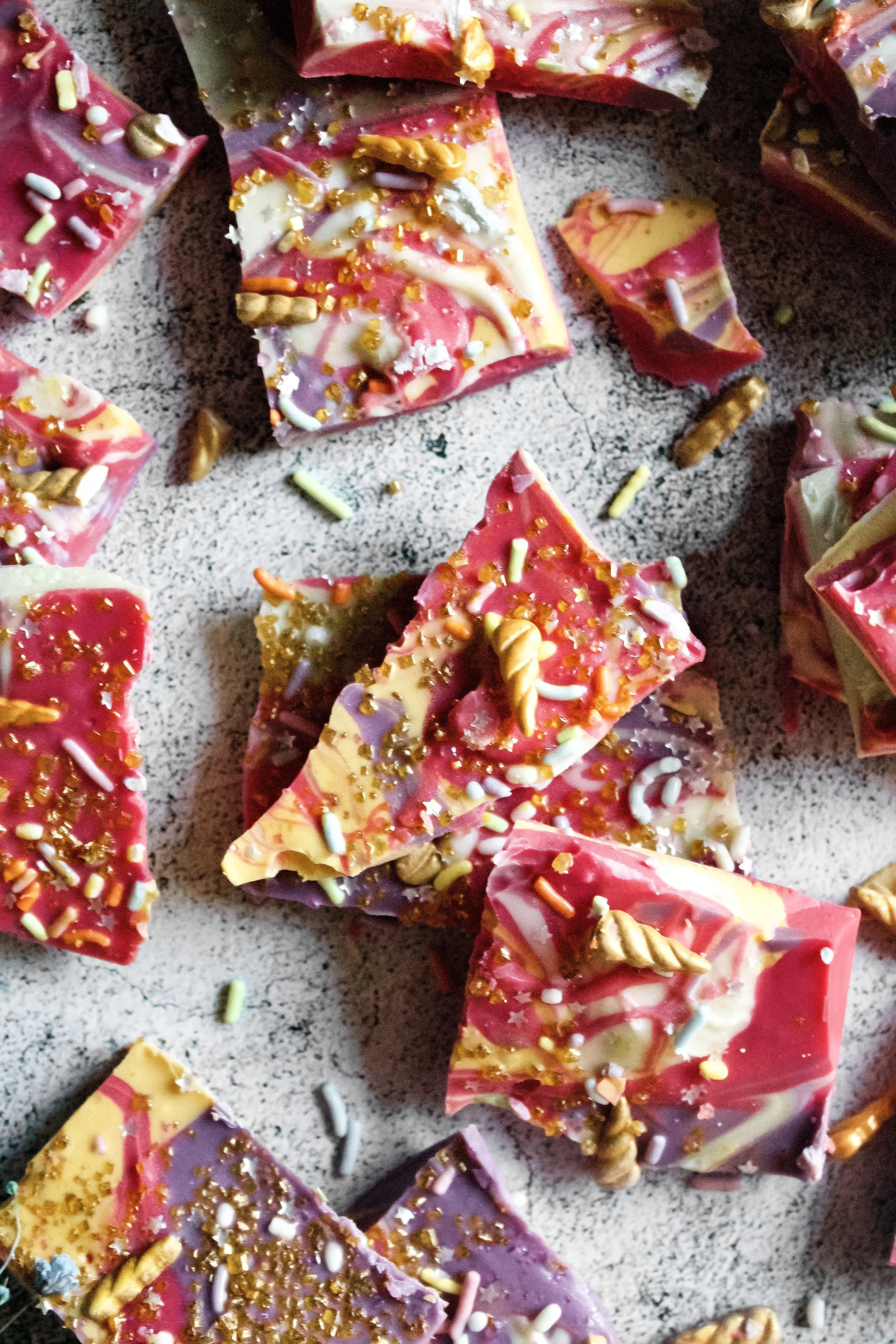 By dropping spoonfuls of the melted chocolate onto the parchment then gently running a knife through it, you get lovely rainbow-ish swirls rather than a mucky brown color. As well, adding the sprinkles while the melts are still warm helps them stick better, which can become an issue when breaking up the bark. And finally, using a variety of unicorn-inspired sprinkles adds not only a fun look but a nice variety of texture, too!