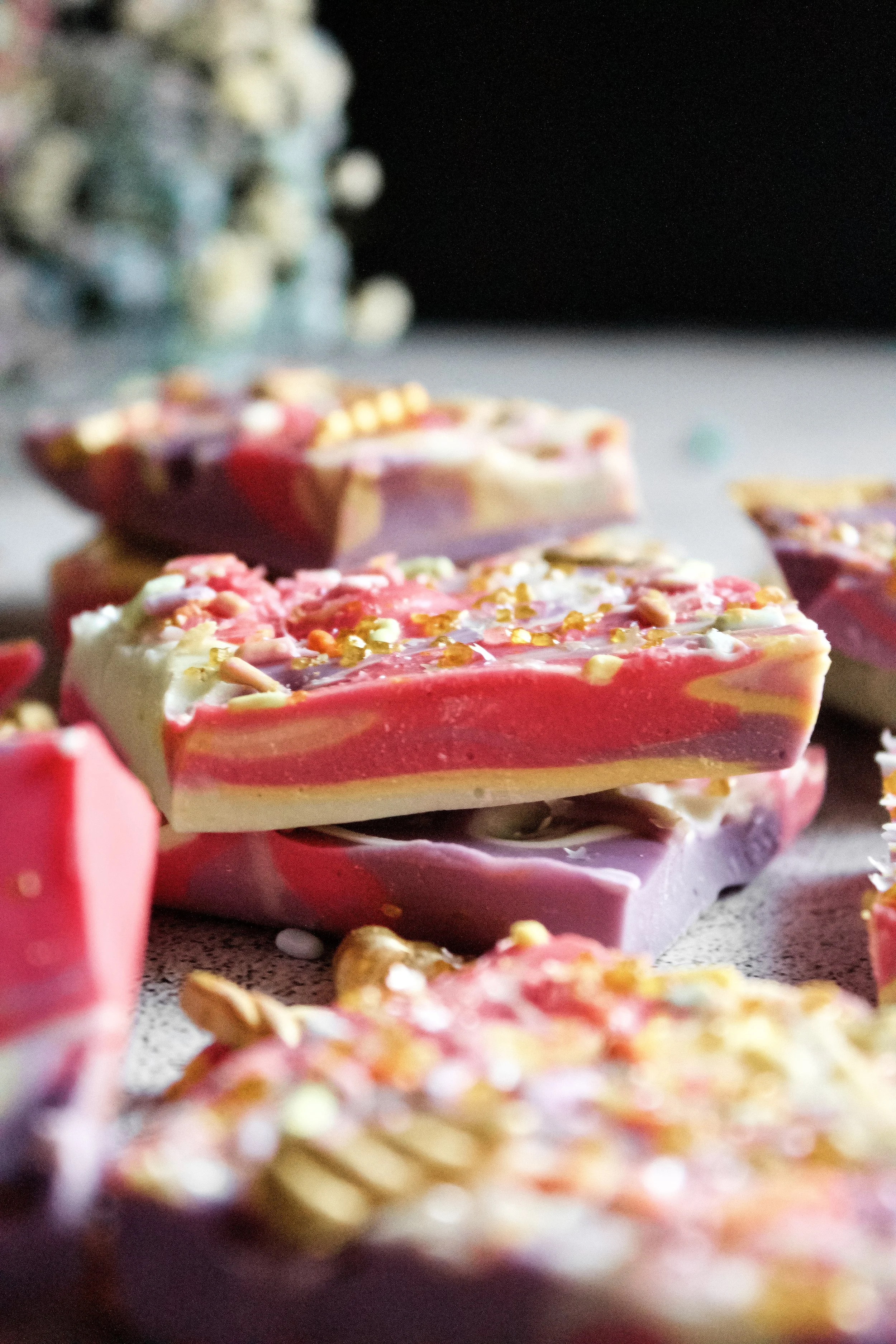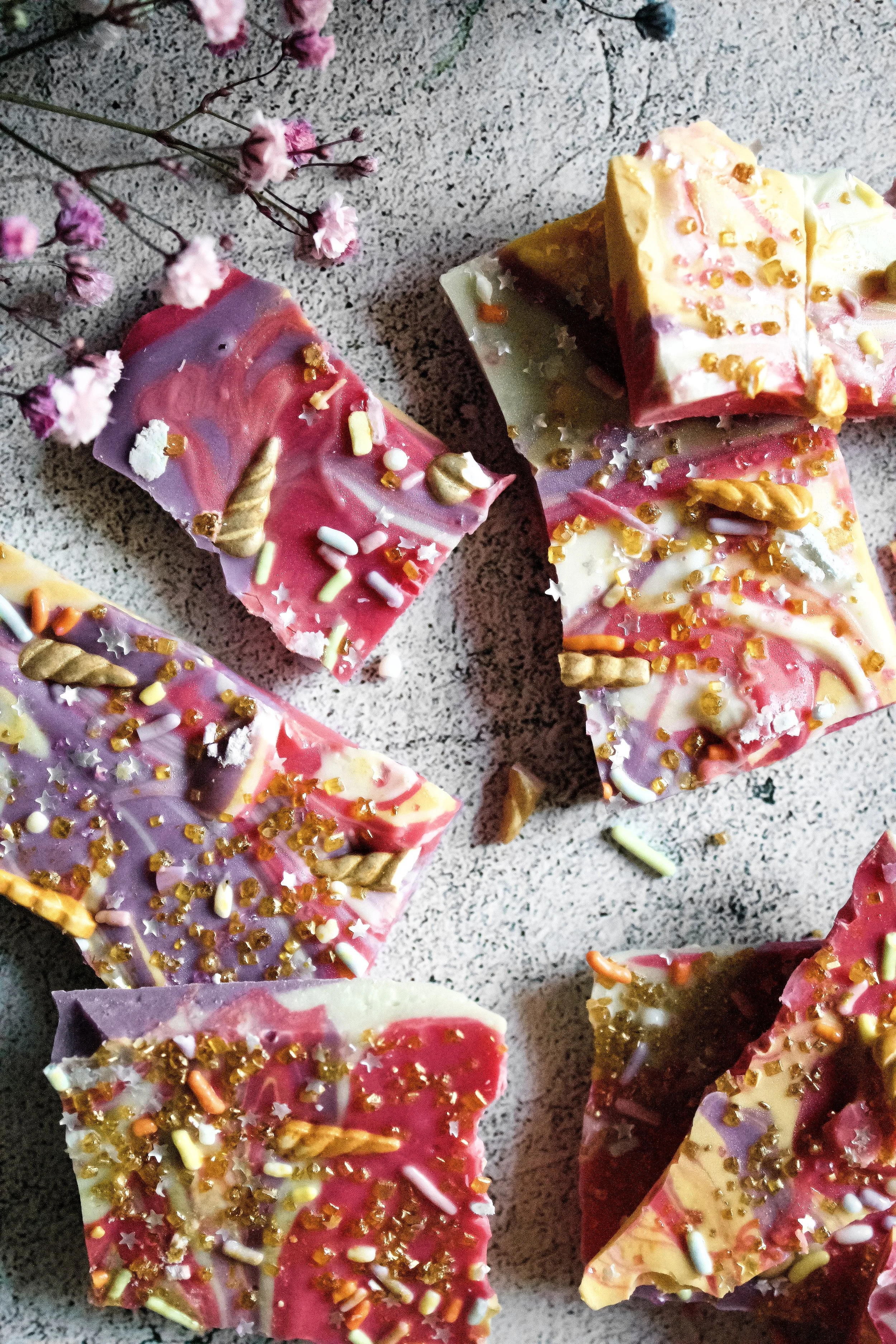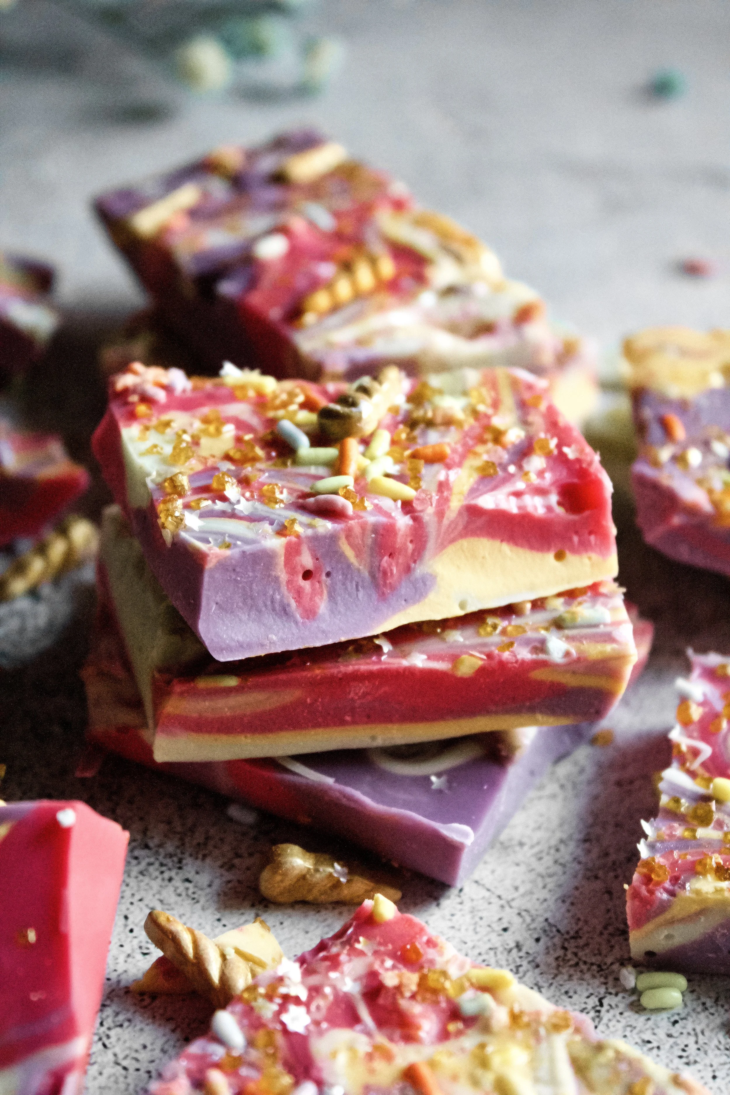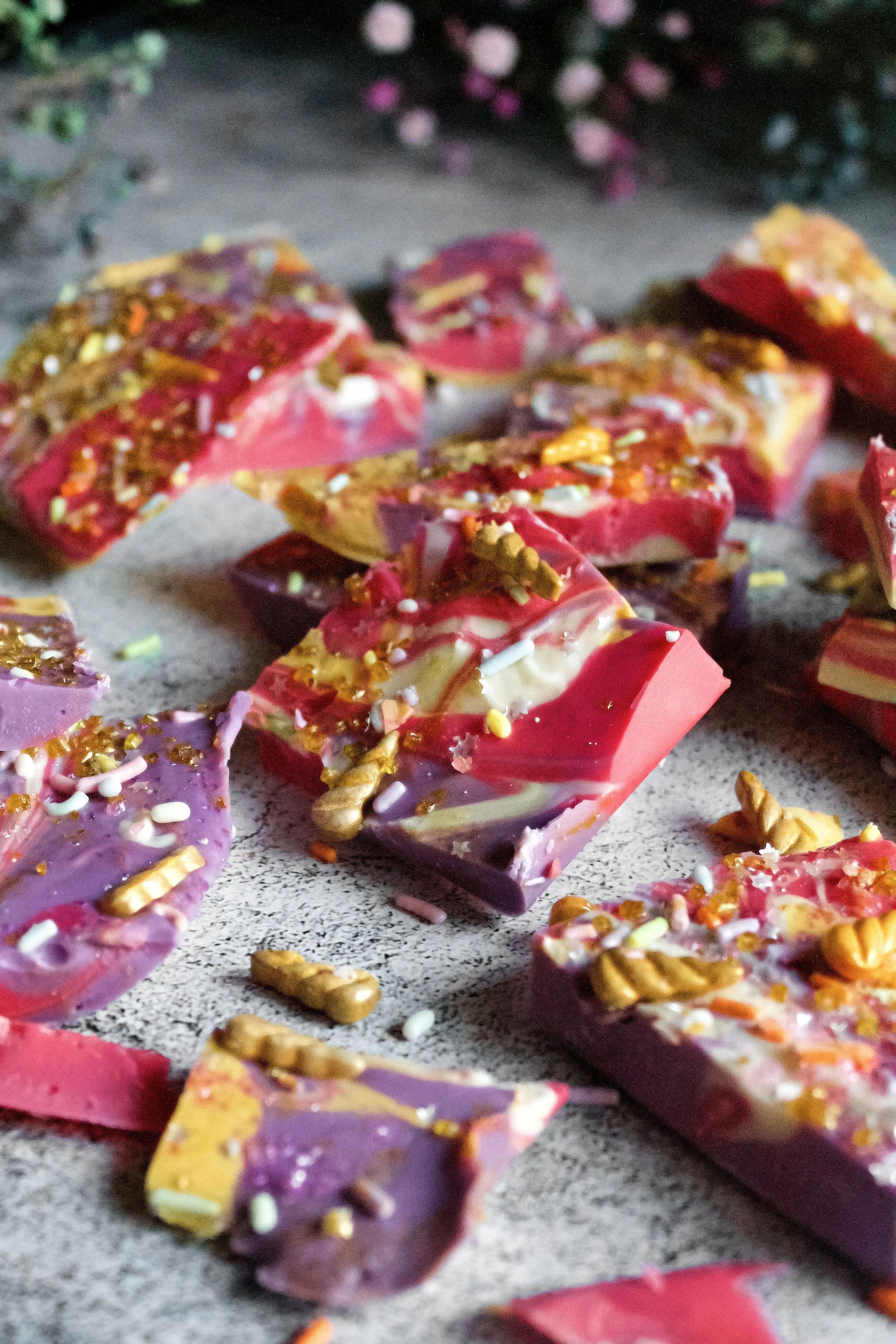 By dropping spoonfuls of the melted chocolate onto the parchment then gently running a knife through it, you get lovely rainbow-ish swirls rather than a mucky brown color. As well, adding the sprinkles while the melts are still warm helps them stick better, which can become an issue when breaking up the bark. And finally, using a variety of unicorn-inspired sprinkles adds not only a fun look but a nice variety of texture, too!