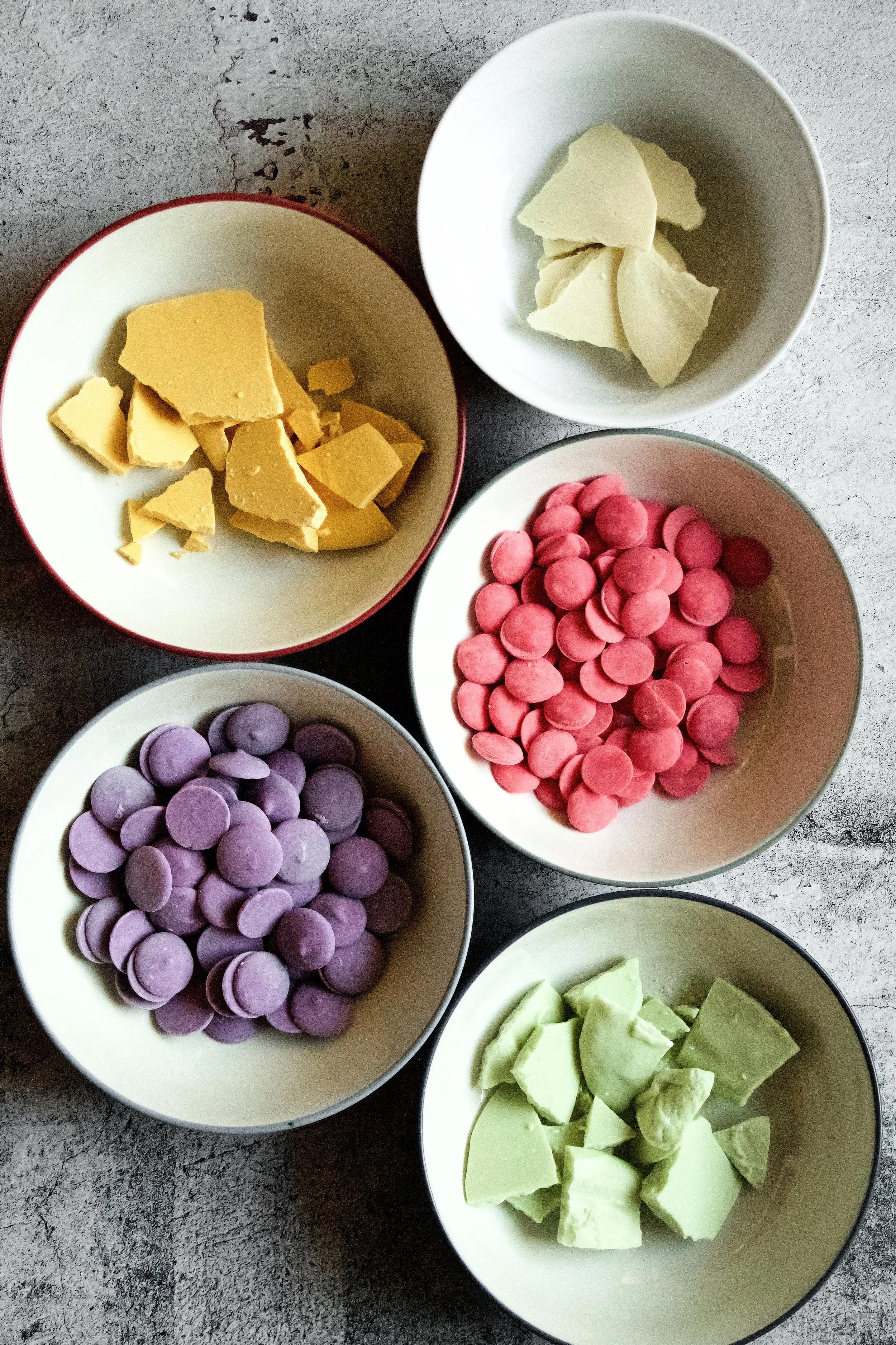 *Note: you can alternatively melt 24 ounces of real white chocolate, divide it into separate bowls, and dye each one with gel food coloring. Work quickly, as the chocolate can melt fast.