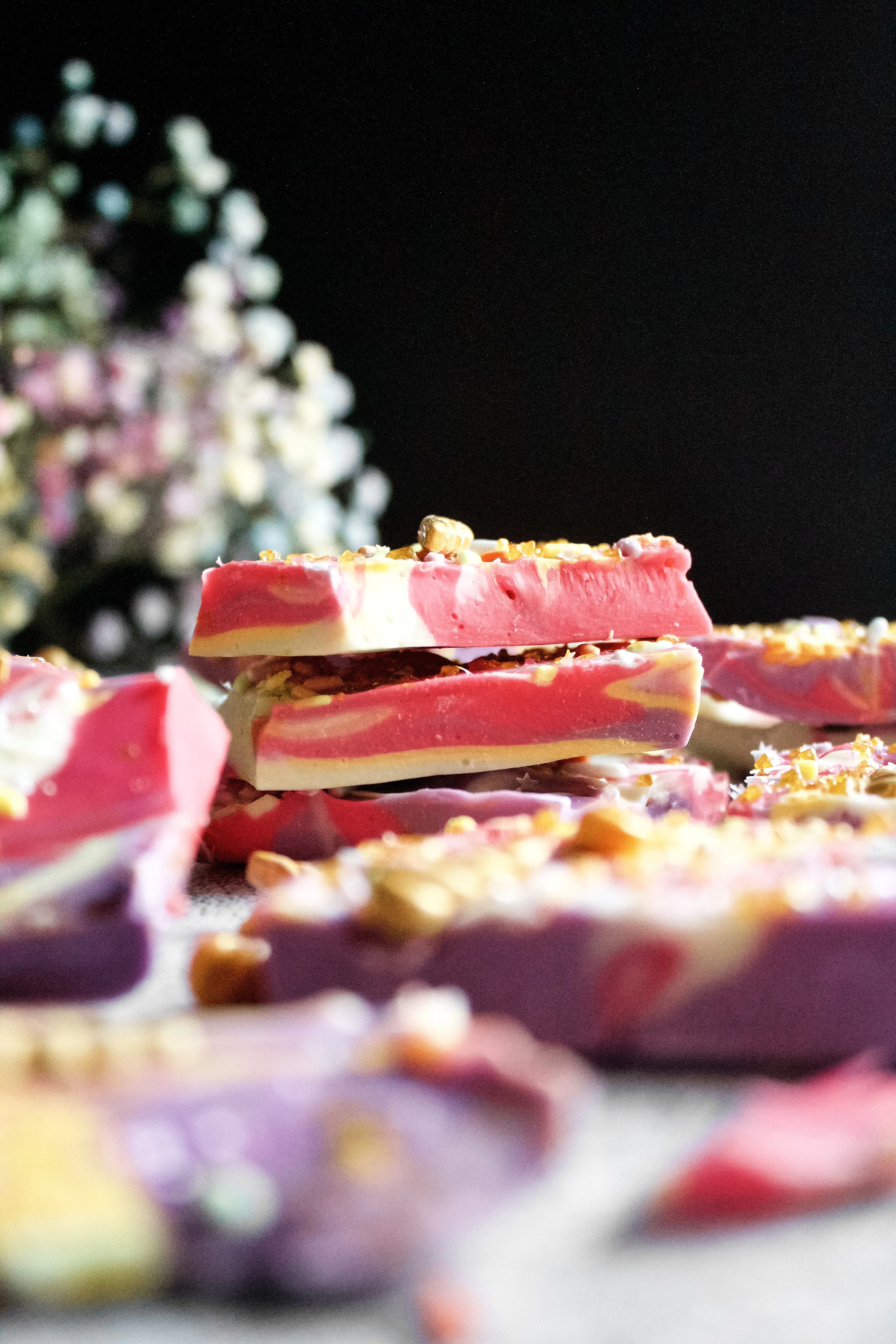 Okay, so technically the only true white chocolate in this candy were the white streaks, since the candy melts taste like white chocolate but are fake. Depending on the brand, “white chocolate” isn’t always actually white chocolate, either. Unless you get the expensive kind that uses actual cocoa butter, you’re not getting true white chocolate. And while I always use real white chocolate in my white chocolate buttercream, I feel no shame using pre-dyed candy melts here. They taste and function the same, and it’s much easier to get the color you want with melts than by dying melted white chocolate.