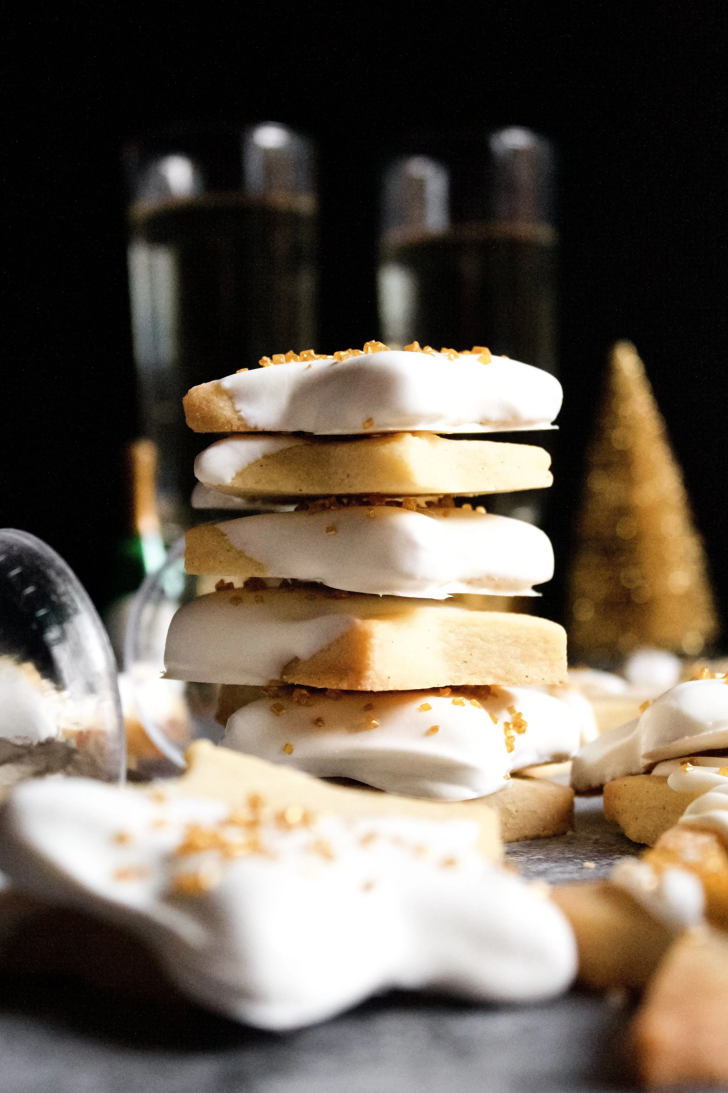 Not only are the festive looking, they taste delicious. This shortbread is always a hit, and the vanilla bean just adds extra flavor. Plus, I love dipping these cookies in chocolate of any kind. White chocolate just felt more festive, especially against the black vanilla bean flecks. Plus, it adds a lightly sweet, vanilla-y taste and some texture. And the gold sugar! You gotta have gold at New Years. And it adds even more crunch, which rounds these cookies out perfectly in taste and appearance.