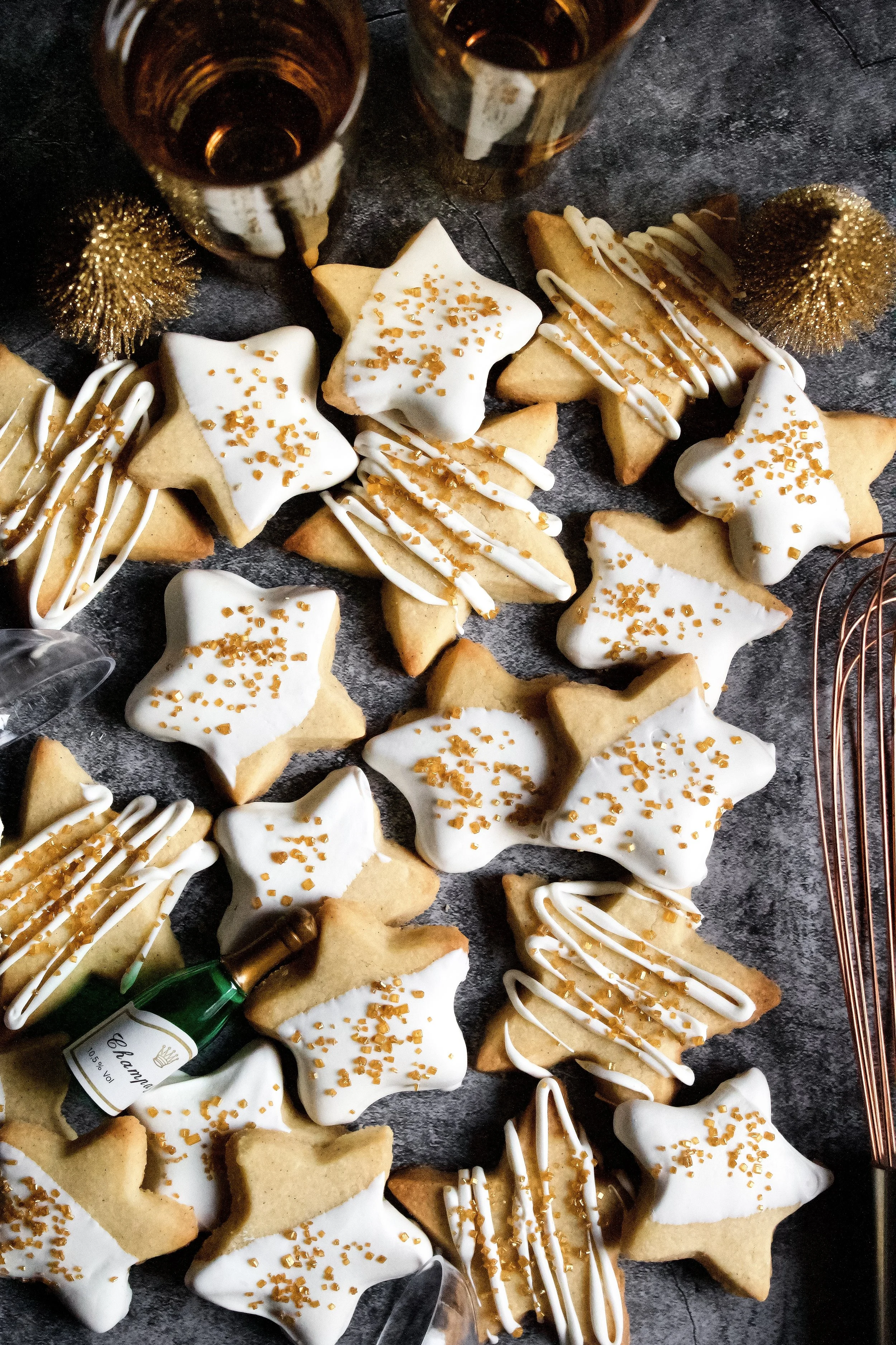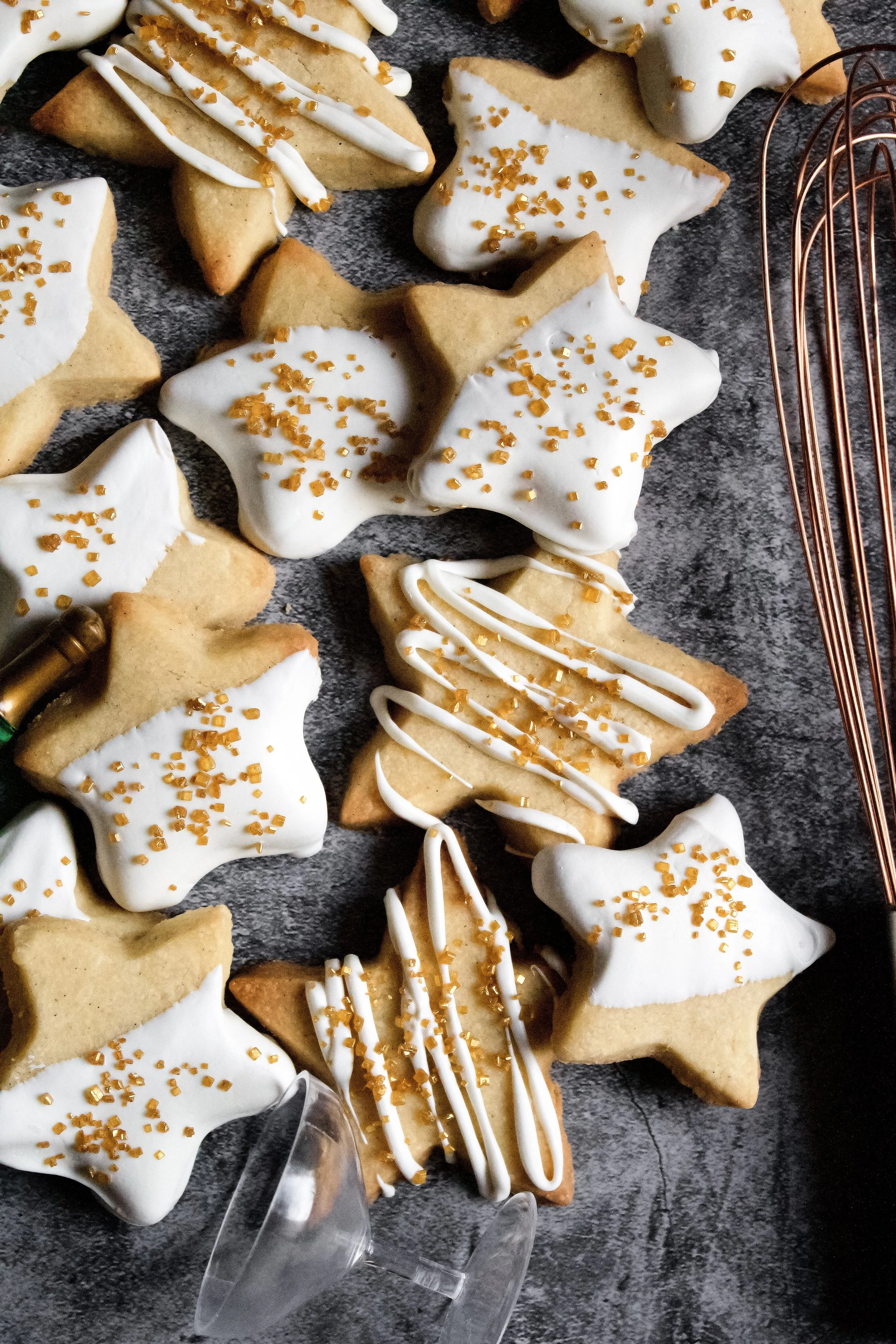 Tender vanilla bean shortbread shaped into festive stars, dipped in white chocolate, and sprinkled with gold sanding sugar. Ring in the new year with these simple yet addicting cookies!